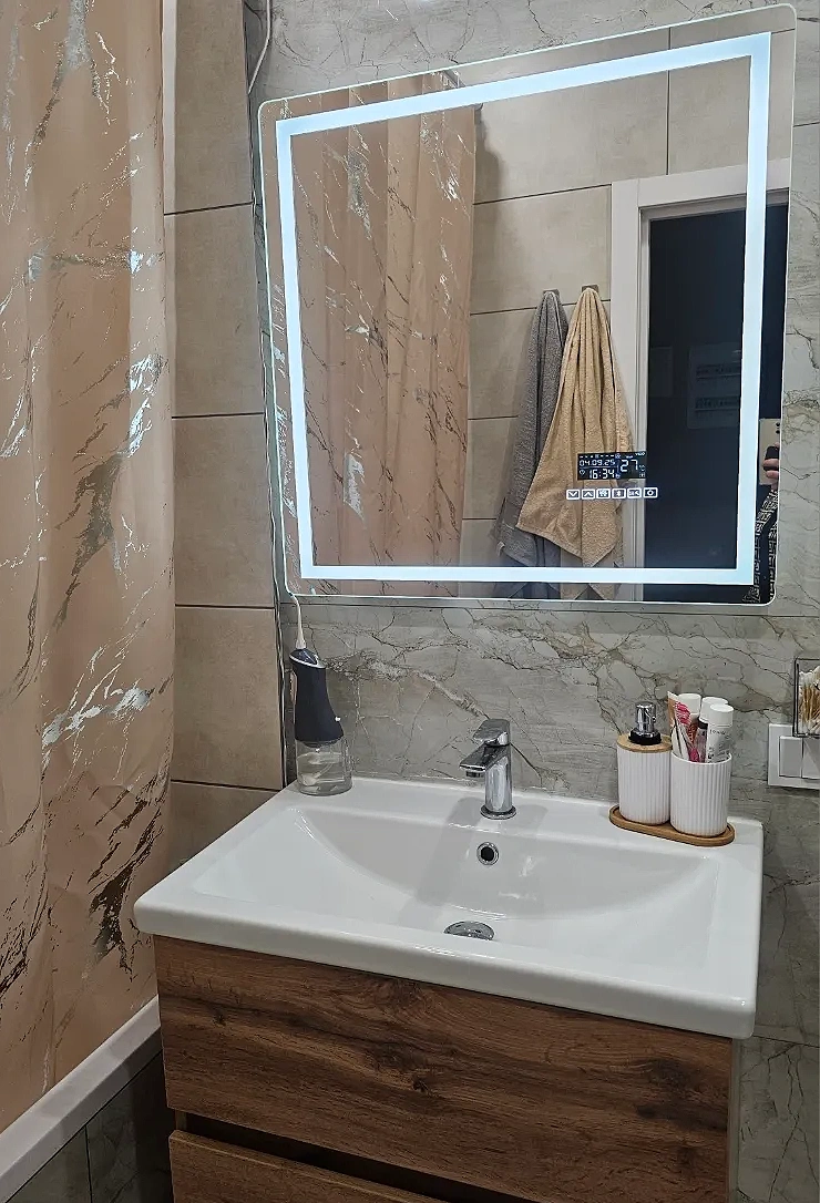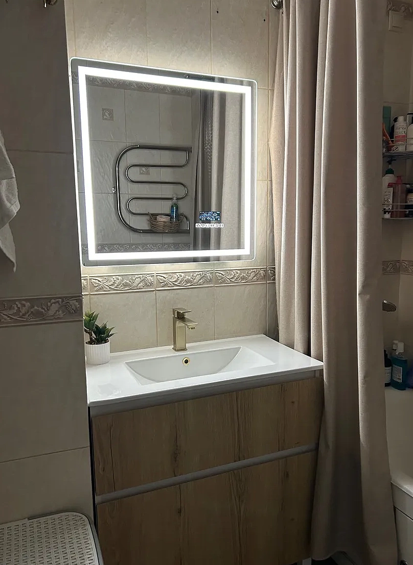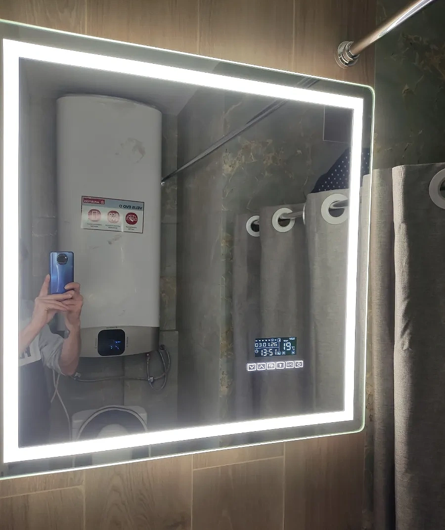 - COB подсветка по периметру создаёт мягкий, равномерный свет без точек и теней, а дефоггер 30×40 см сохраняет зеркало кристально прозрачным после душа.