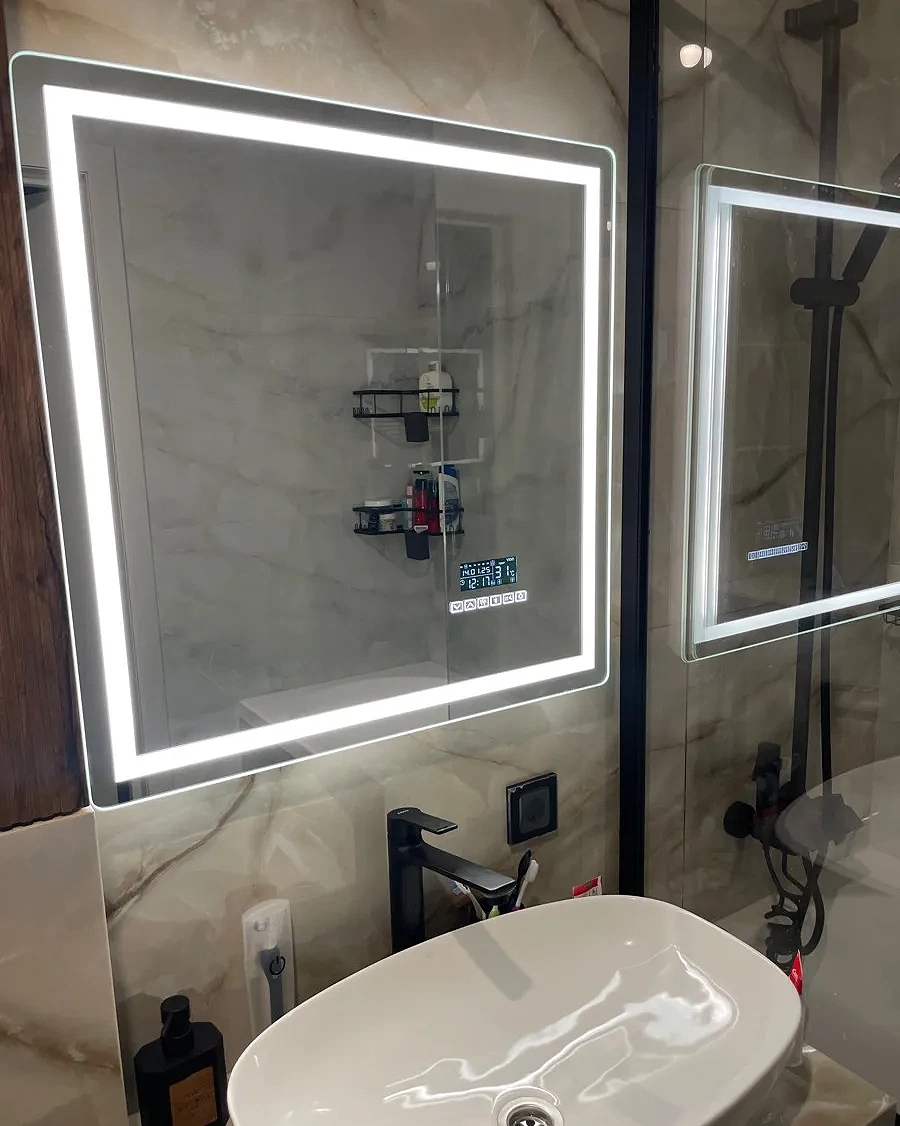 Квадратная модель Деймон Медиа войс 700 OLEVARO — это больше, чем зеркало. Это интеллектуальная мультимедийная система с голосовым управлением, Bluetooth-аудио, часами, датчиком температуры и антизапотеванием.