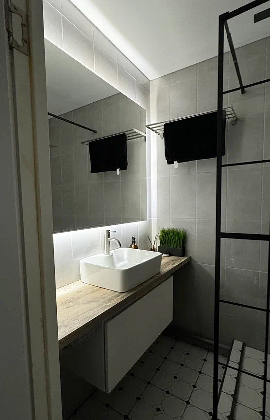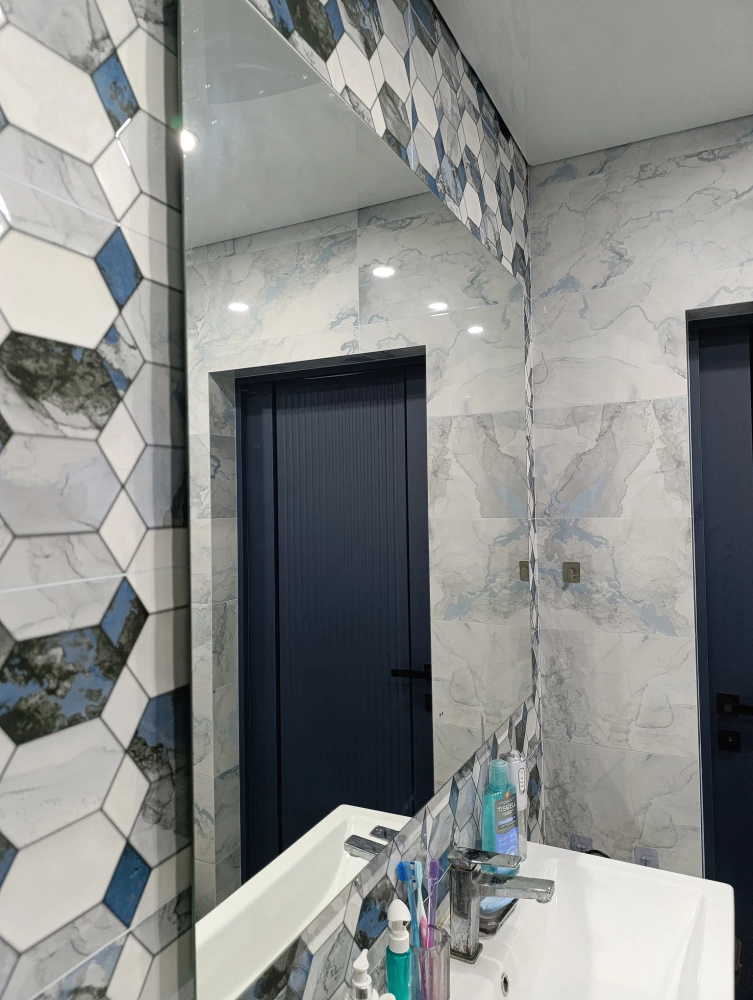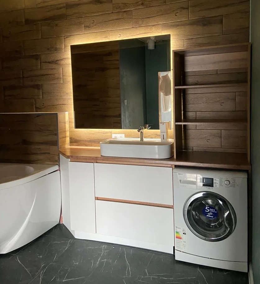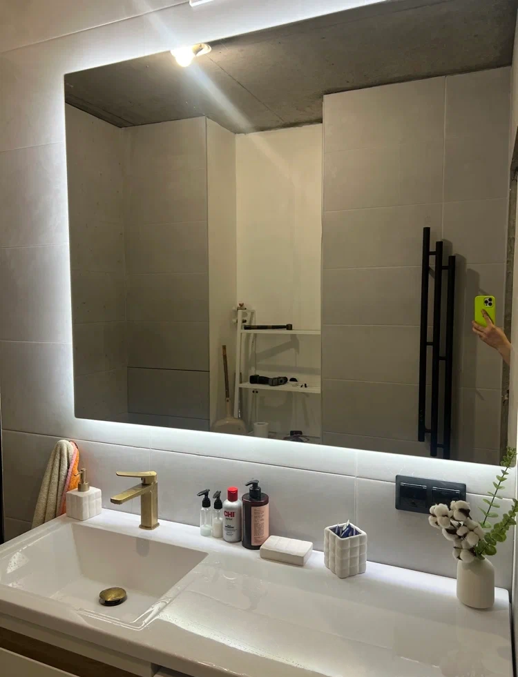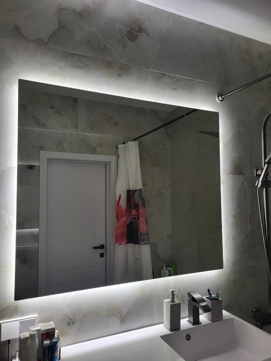 - Внешняя светодиодная подсветка по периметру создаёт мягкое равномерное свечение, визуально увеличивая помещение и добавляя ощущение тепла и уюта.