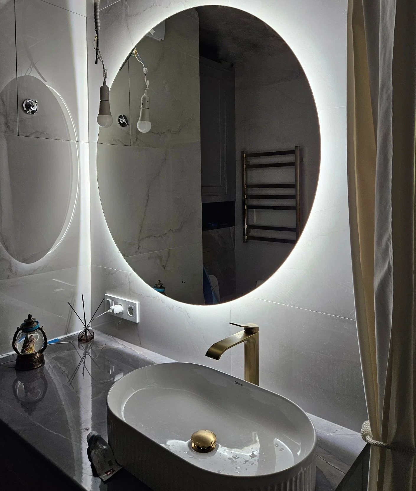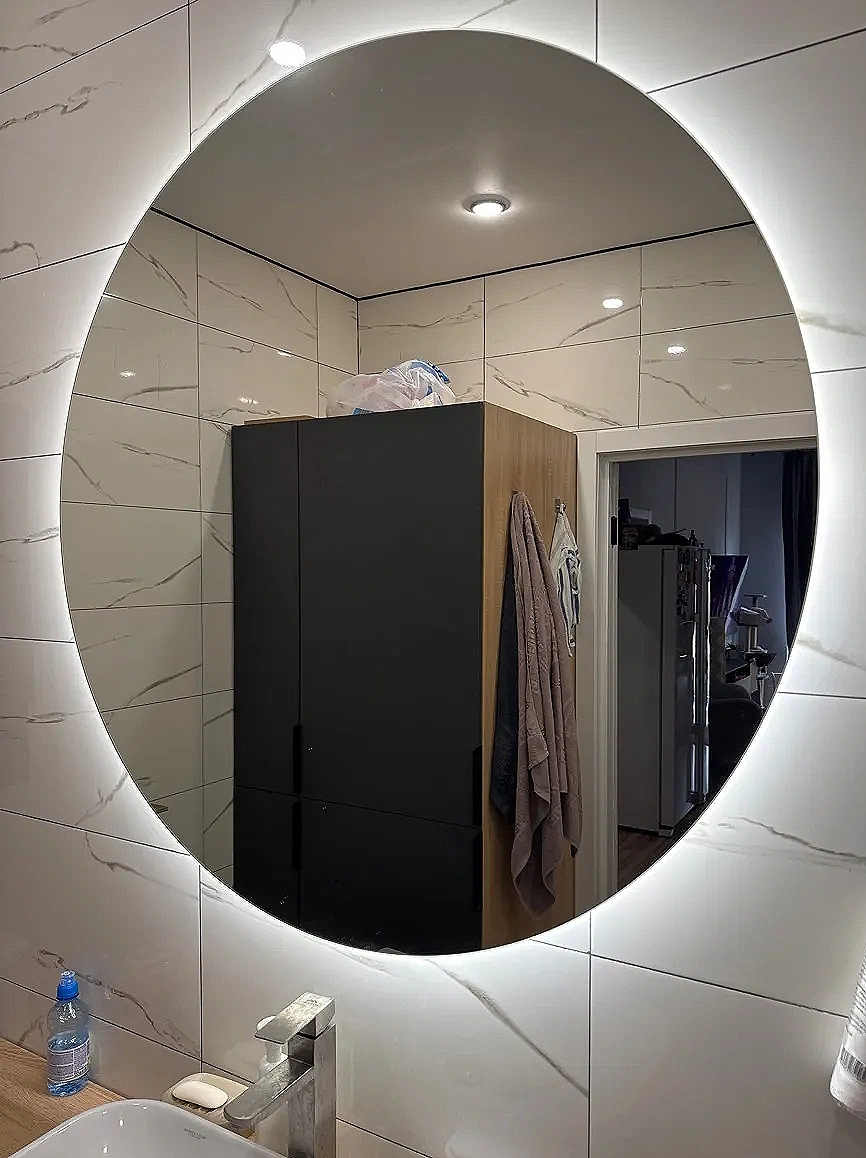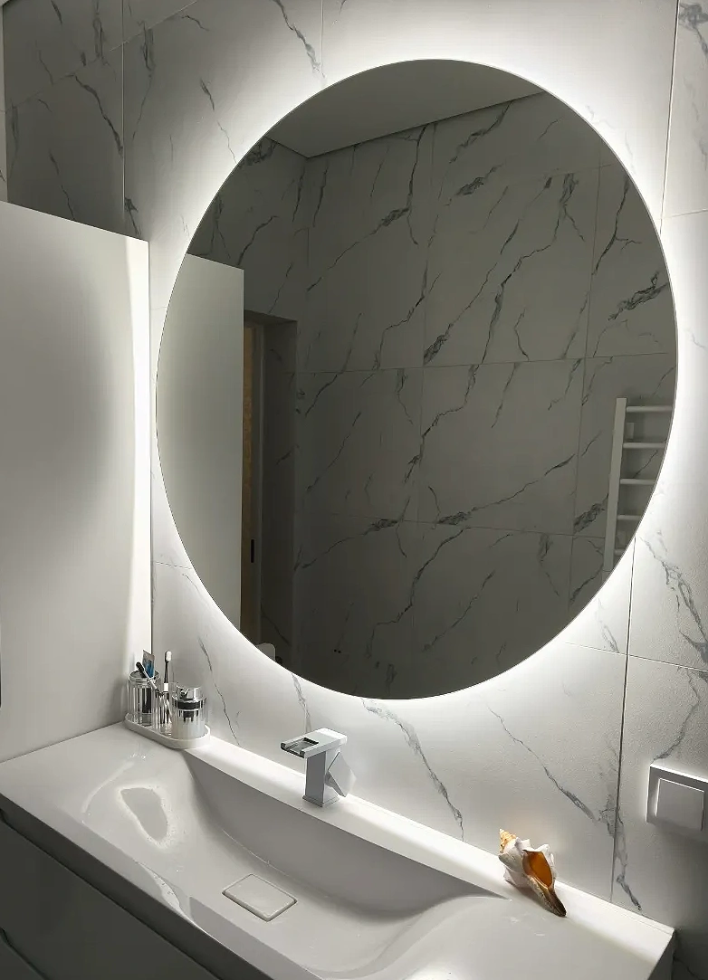 - Внешняя светодиодная подсветка по периметру формирует нежное свечение, визуально “отделяя” зеркало от стены и делая пространство просторнее.