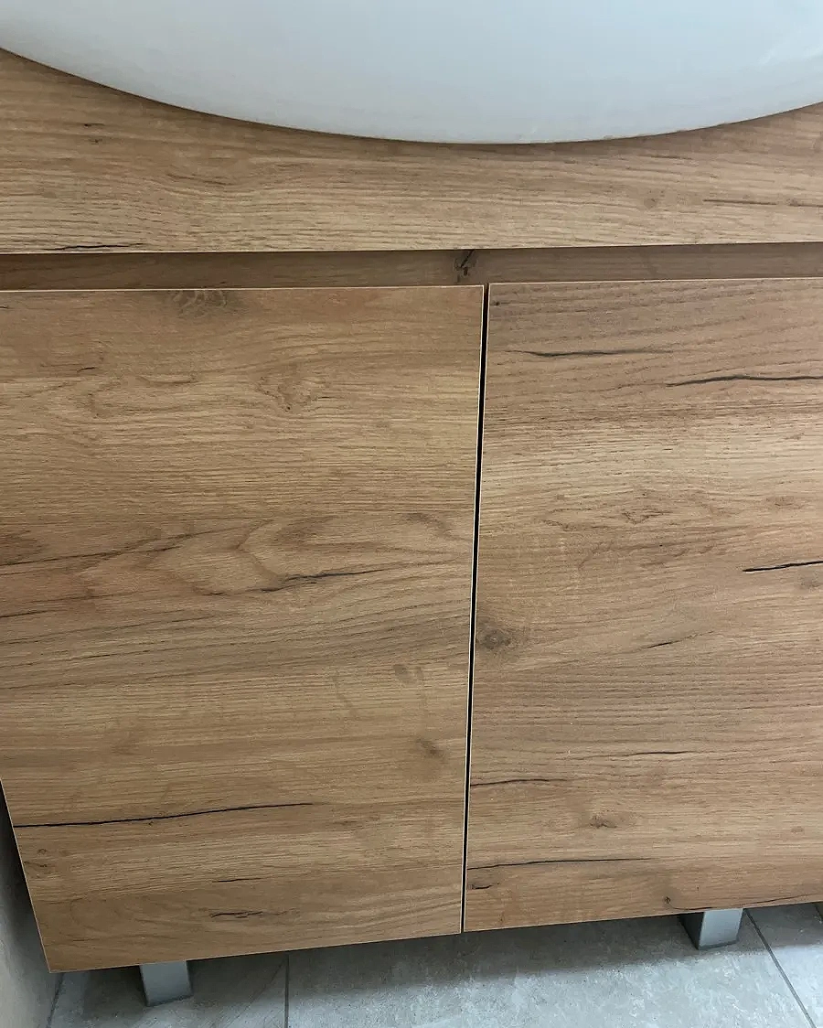 - Тёплая текстура дуба золотого добавляет интерьеру уюта и естественности, гармонично сочетаясь с современной сантехникой и отделкой.