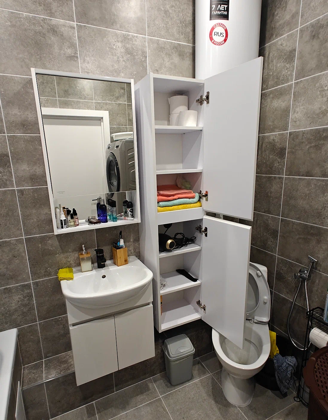 - Благодаря подвесной конструкции, шкаф не занимает место на полу и упрощает уборку — это идеальное решение для небольших ванных комнат.