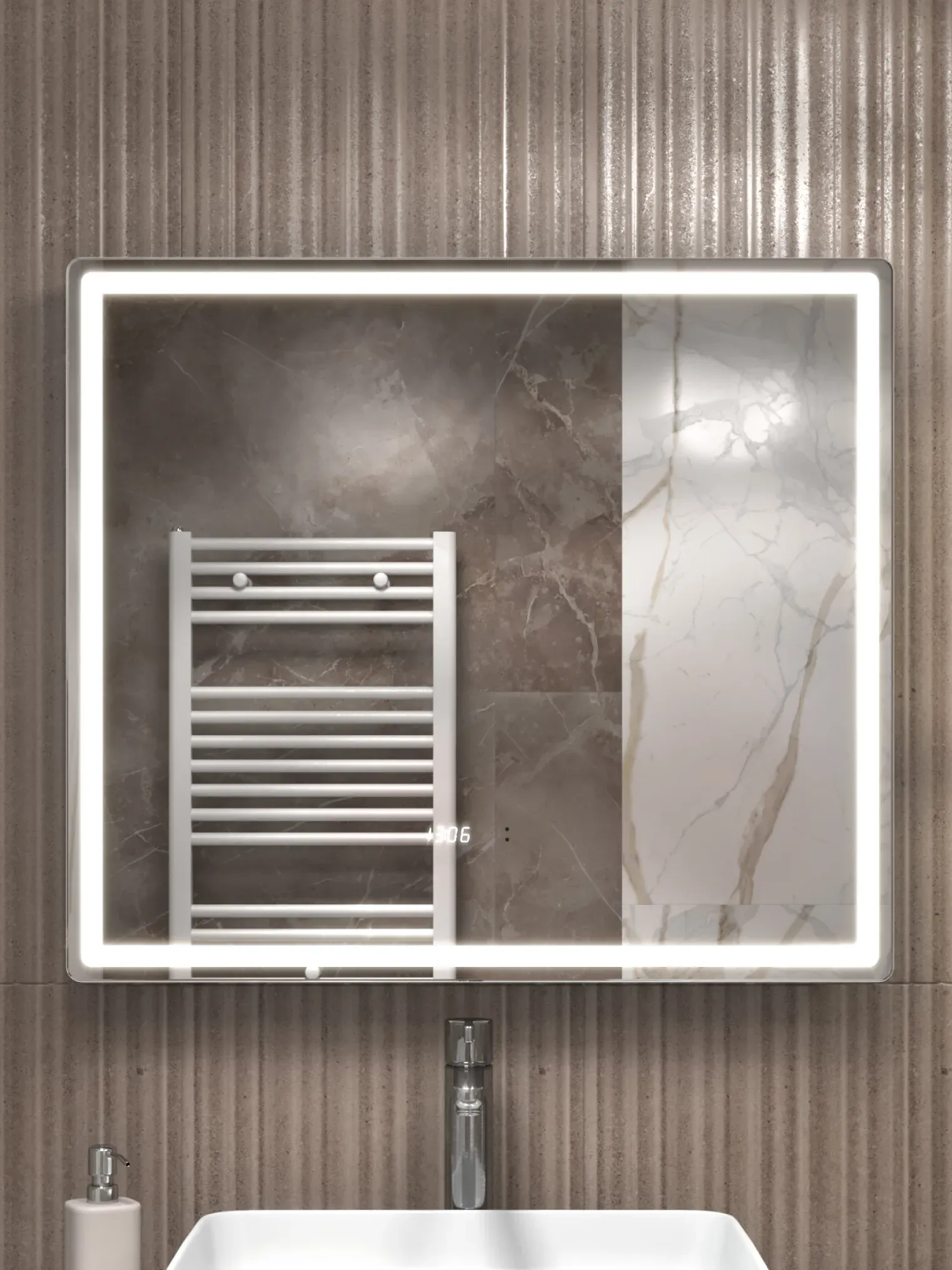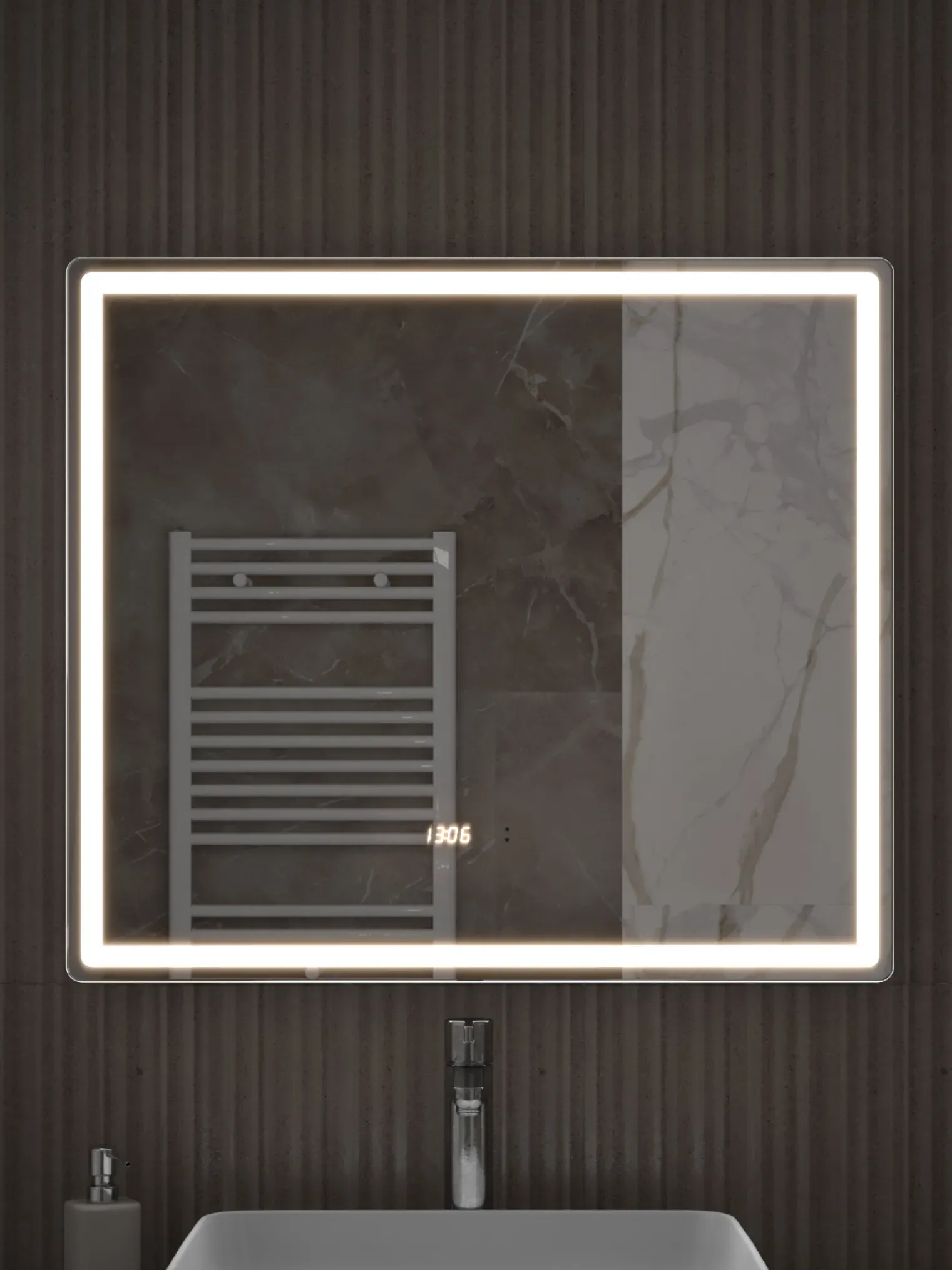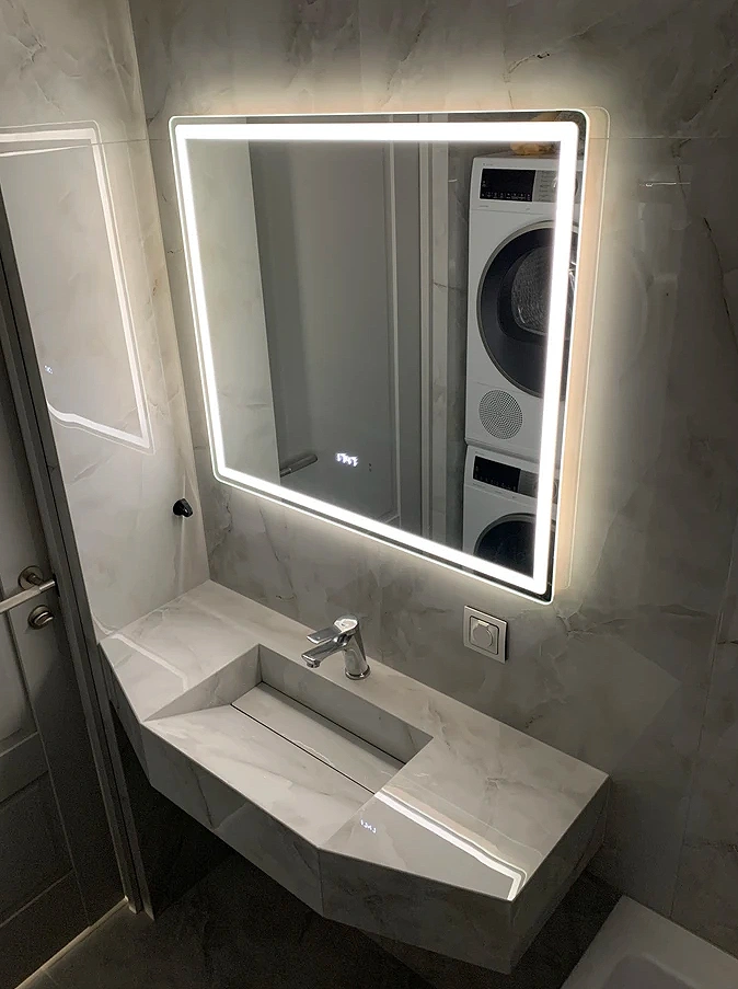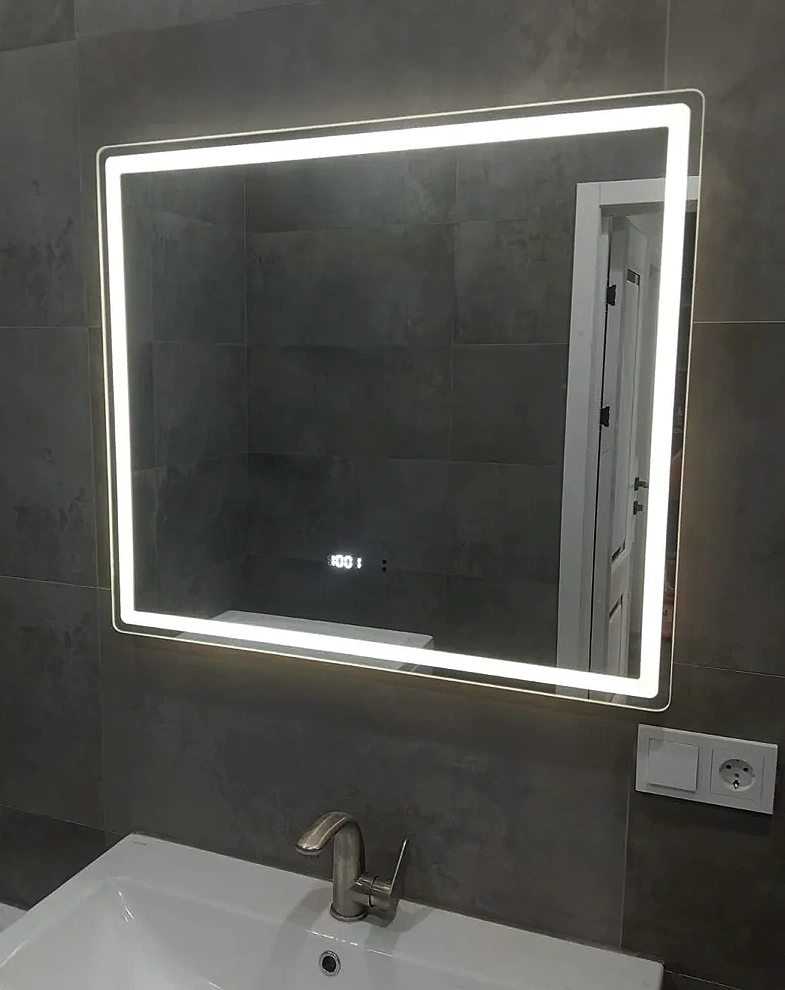 - Фронтальная подсветка COB-типа обеспечивает мягкое и равномерное освещение без бликов, а встроенные часы делают зеркало практичным элементом ежедневного комфорта.