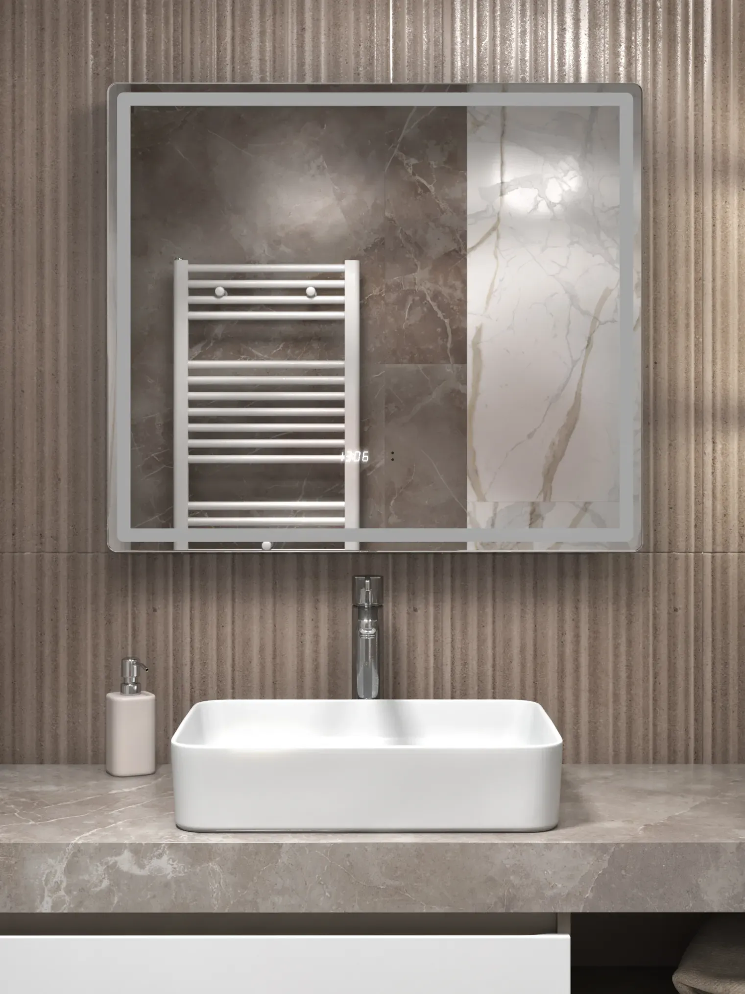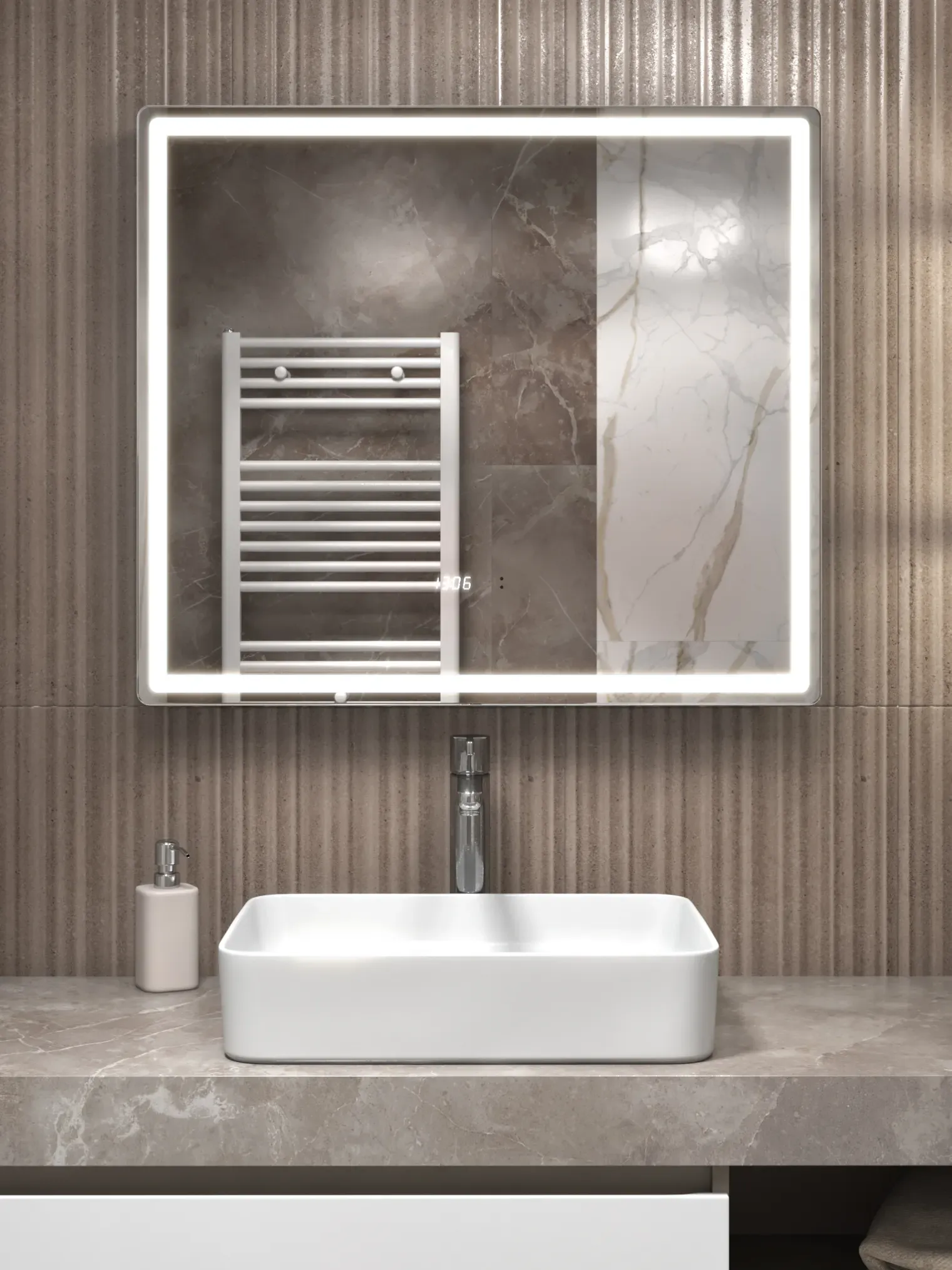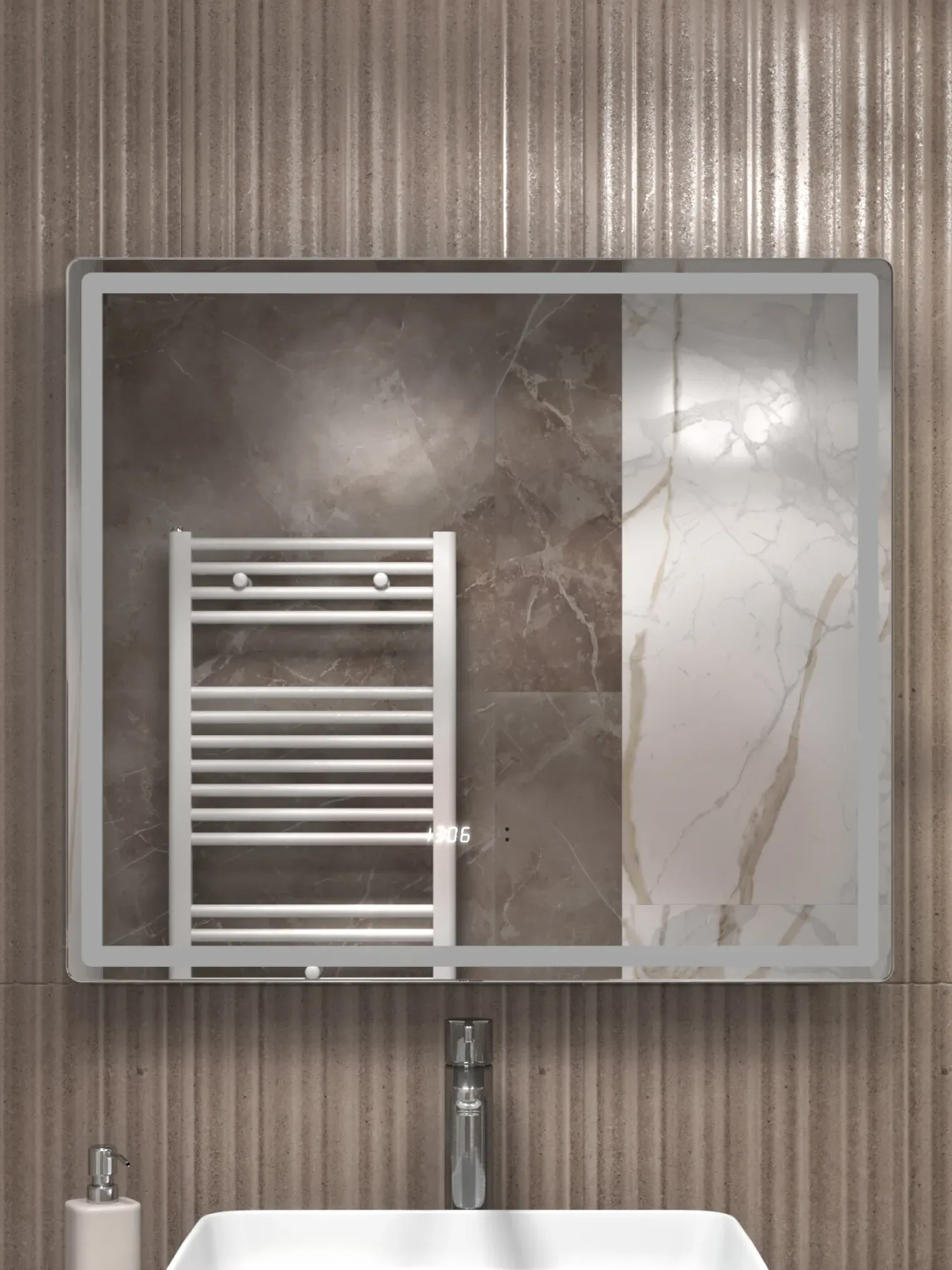 - Фронтальная подсветка COB-типа обеспечивает мягкое и равномерное освещение без бликов, а встроенные часы делают зеркало практичным элементом ежедневного комфорта.