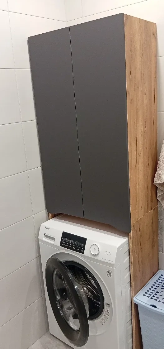- Шкаф устанавливается над стиральной машиной, превращая зону стирки в полноценный и эстетичный мебельный комплекс для ванной комнаты.