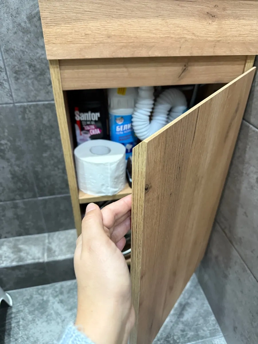 - За распашной дверцей расположено функциональное пространство для хранения бытовой химии, средств ухода или необходимых мелочей.