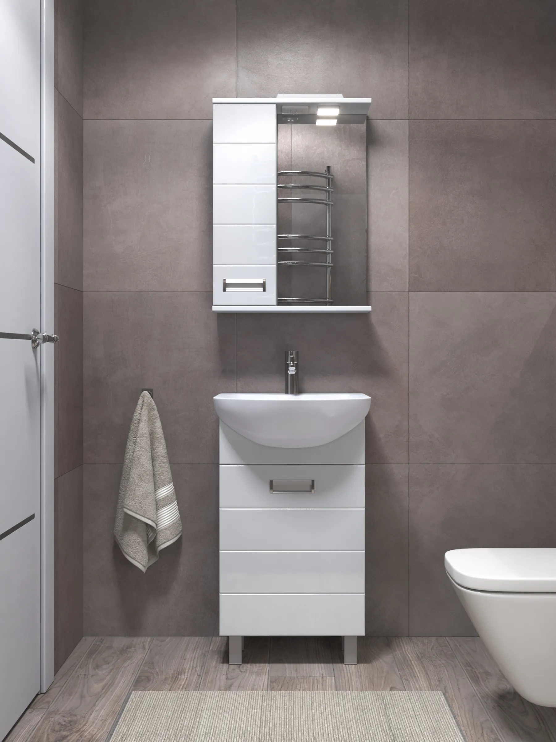 Зеркальный шкаф Bianca 500 — это сочетание современного дизайна, продуманного хранения и аккуратной подсветки рабочей зоны благодаря встроенному споту. Модель шириной 50 см идеально подходит для небольших и средних ванных комнат, добавляя интерьеру свет, комфорт и удобство использования. Корпус выполнен из влагостойкой ЛДСП с матовым ламинированным покрытием, устойчивым к повышенной влажности и ежедневным нагрузкам. Фасад изготовлен из ЛМДФ, покрыт прочной глянцевой плёнкой ПВХ — такой материал не боится влаги, легко очищается и надолго сохраняет первоначальный вид. Встроенное прямоугольное зеркало визуально увеличивает пространство и делает уход за собой удобным. Над зеркалом расположен спот, обеспечивающий дополнительное направленное освещение — комфортное для макияжа, бритья и других повседневных процедур. Слева находится функциональная система хранения с полками, на которых легко разместить косметику, средства гигиены и аксессуары. Дверца оснащена механизмом доводчика, который обеспечивает мягкое, бесшумное закрывание и повышает долговечность фурнитуры. Хромированная лицевая фурнитура подчёркивает современный стиль коллекции Bianca, делая шкаф ярким и элегантным элементом интерьера. Преимущества Bianca 500 (левый) со спотом встроенный спот — дополнительное освещение для удобства ежедневных процедур; компактная ширина 50 см — оптимально для небольших и средних ванных комнат; корпус из влагостойкой ЛДСП — устойчивость к влажности и перепадам температуры; глянцевый фасад из ЛМДФ с ПВХ-покрытием — простота ухода и современный вид; встроенное зеркало — визуальное расширение пространства; дверца с доводчиком — плавное, бесшумное закрывание; удобные полки внутри для аккуратного хранения; хромированная фурнитура — стильный акцент. OLEVARO разрабатывает мебель, ориентируясь на реальные условия эксплуатации в ванных комнатах: высокая влажность, частое использование и необходимость лёгкого ухода. Шкаф Bianca 500 со спотом — это функциональное, надёжное и стильное решение, которое гармонично дополнит современный интерьер и обеспечит удобную организацию хранения. Если вы ищете компактный навесной шкаф с зеркалом и дополнительным освещением, который сочетает эстетику и практичность, — Bianca 500 (левый) станет отличным выбором.