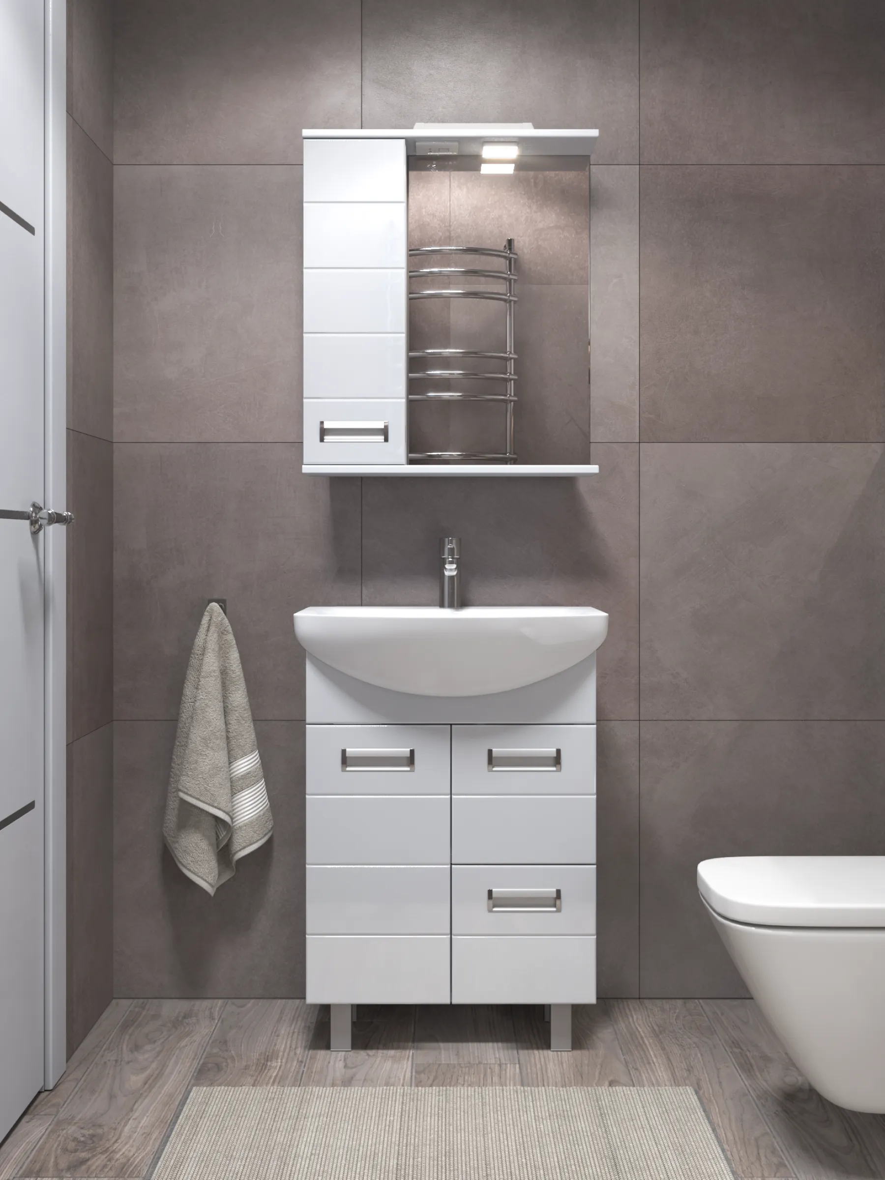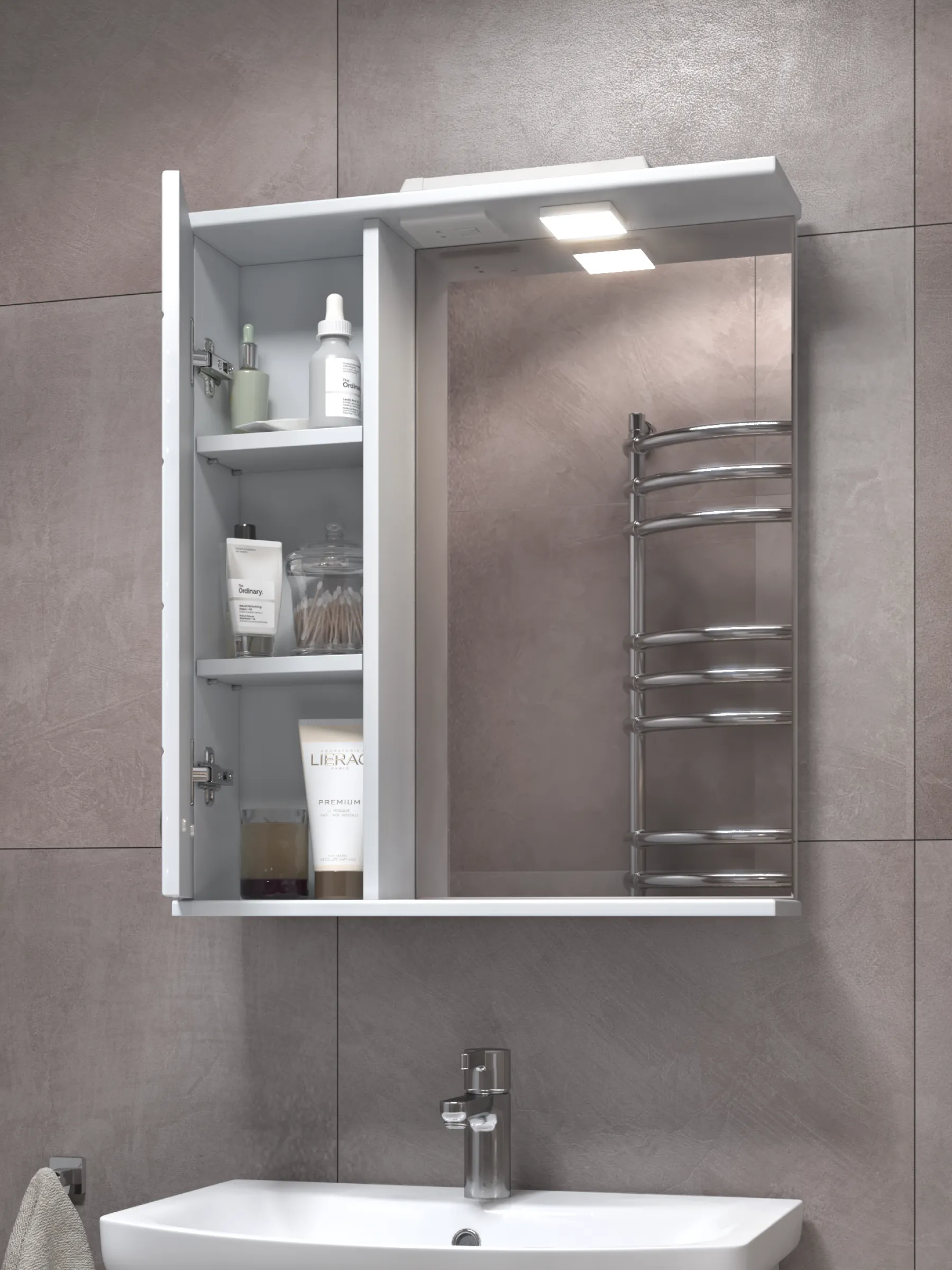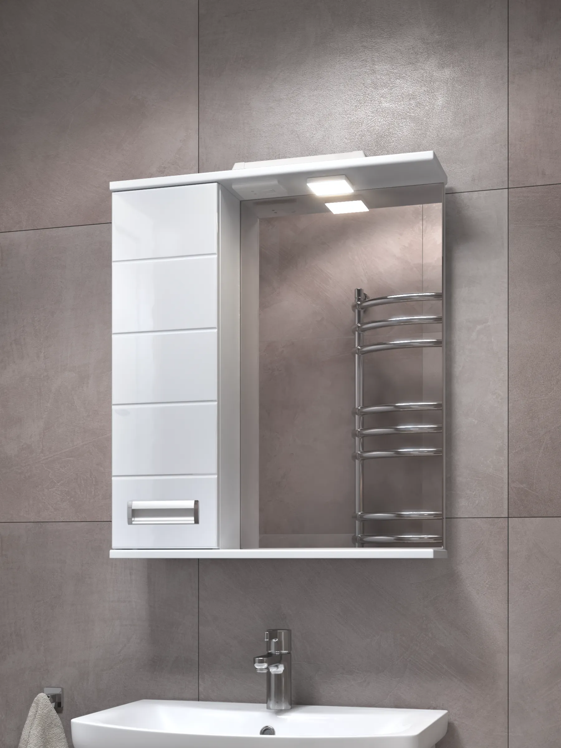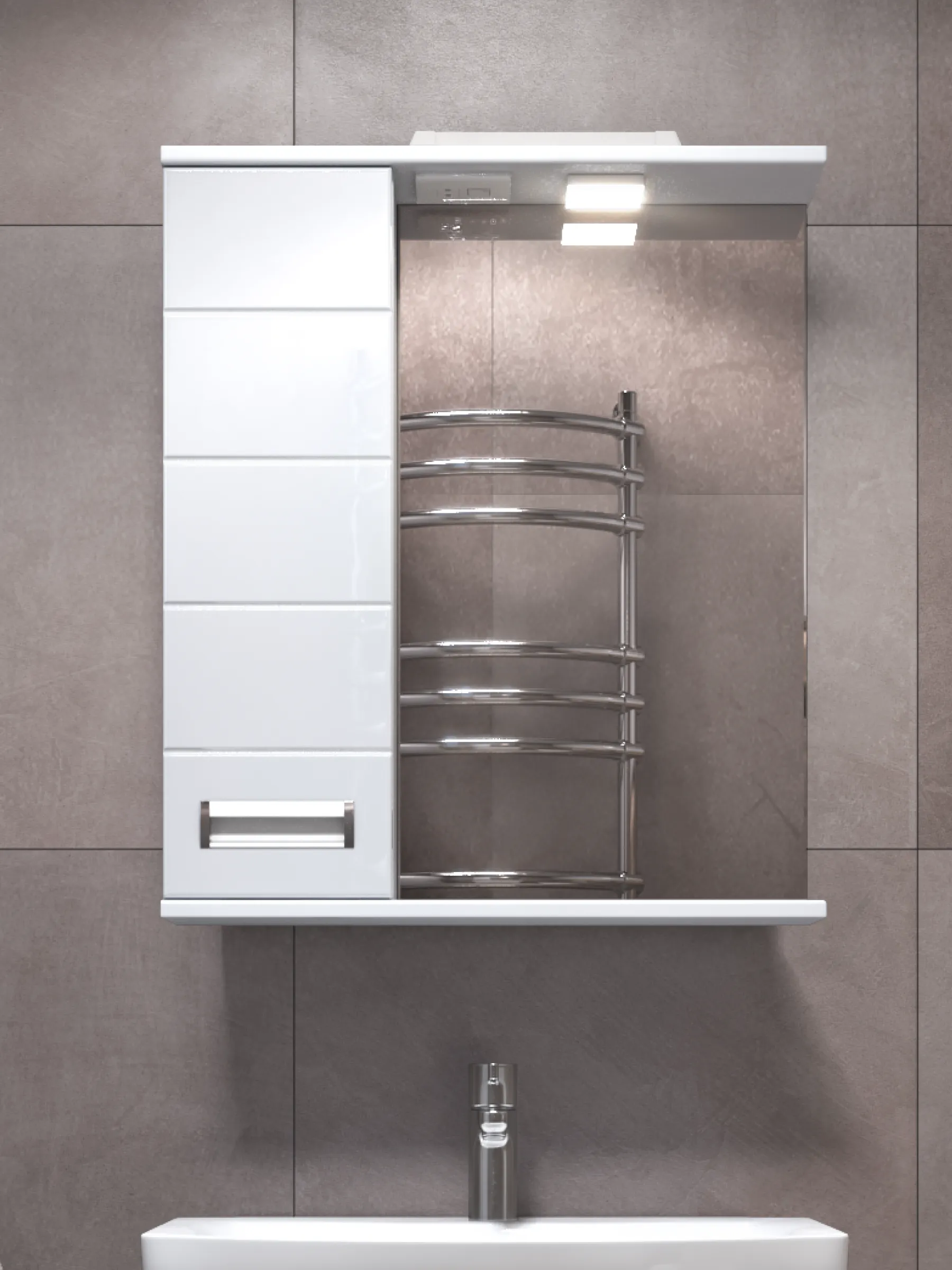 Зеркальный шкаф Bianca 600 — это сочетание элегантного дизайна, вместительной системы хранения и дополнительного освещения благодаря встроенному споту. Модель шириной 60 см отлично подходит для ванных комнат среднего размера, создавая удобное и функциональное пространство возле умывальника. Корпус изготовлен из влагостойкой ЛДСП с матовым ламинированным покрытием, устойчивым к влаге, конденсату и ежедневным нагрузкам. Фасад выполнен из ЛМДФ, покрыт прочной глянцевой плёнкой ПВХ — она добавляет шкафу аккуратный внешний вид и остаётся простой в уходе даже при частом использовании. Встроенное прямоугольное зеркало визуально расширяет помещение и обеспечивает удобную поверхность для ежедневных процедур. Над зеркалом расположен спот, создающий дополнительное направленное освещение — идеальное решение для макияжа, бритья и ухода за кожей. Слева расположено удобное внутреннее пространство с полками, где можно аккуратно разместить косметику, бытовые принадлежности, средства ухода и мелкие аксессуары. Дверца оснащена механизмом доводчика, который обеспечивает мягкое, бесшумное закрывание и продлевает срок службы фурнитуры. Хромированная лицевая фурнитура добавляет модели современный штрих и подчёркивает характер коллекции Bianca. Преимущества Bianca 600 со спотом встроенный спот — комфортное дополнительное освещение; увеличенная ширина 60 см — больше внутреннего пространства для хранения; корпус из влагостойкой ЛДСП — устойчивость к влажности и перепадам температуры; глянцевый ЛМДФ-фасад с ПВХ-плёнкой — стойкость и лёгкость в уходе; встроенное зеркало — удобство и визуальное расширение пространства; дверца с доводчиком — бесшумное плавное закрывание; практичное внутреннее пространство с полками; хромированная фурнитура — современное декоративное решение. OLEVARO создаёт мебель, разработанную специально для условий повышенной влажности и ежедневной эксплуатации. Шкаф Bianca 600 со спотом станет надёжным, стильным и удобным элементом, который помогает поддерживать порядок и улучшает функциональность ванной комнаты. Если вы ищете вместительный навесной шкаф с зеркалом и дополнительным освещением, гармонично сочетающий эстетику и практичность, — Bianca 600 (левый) станет отличным выбором.