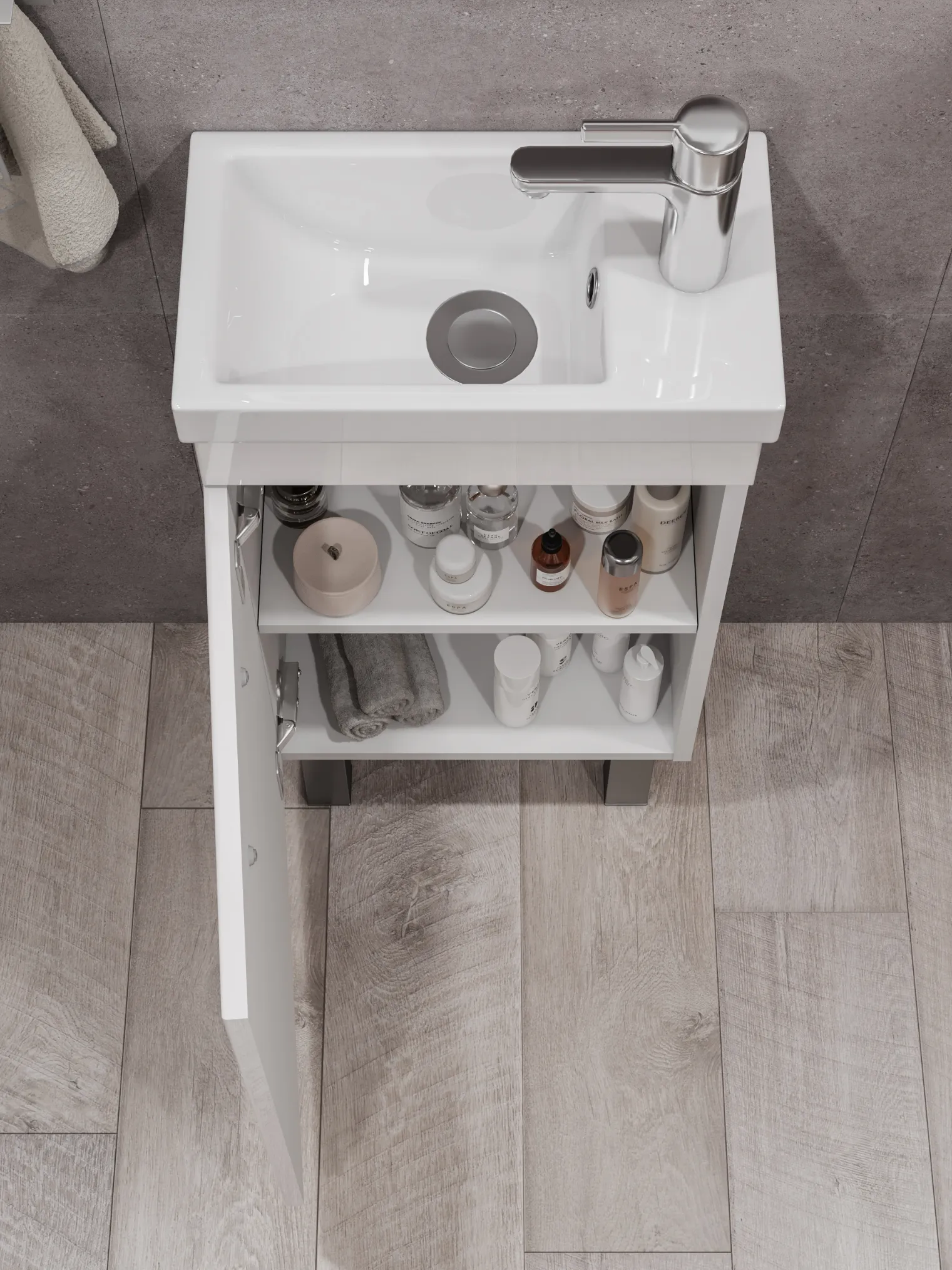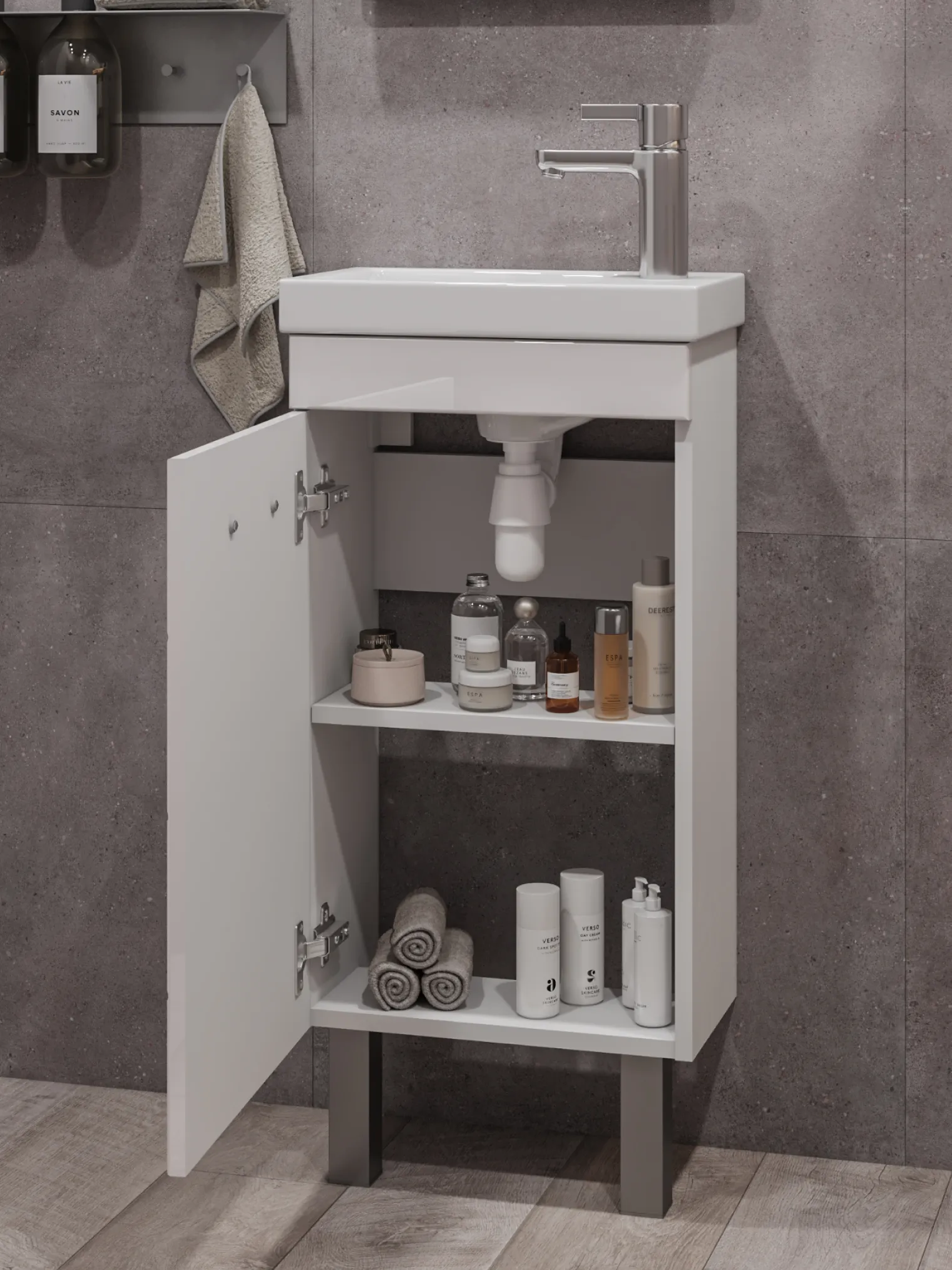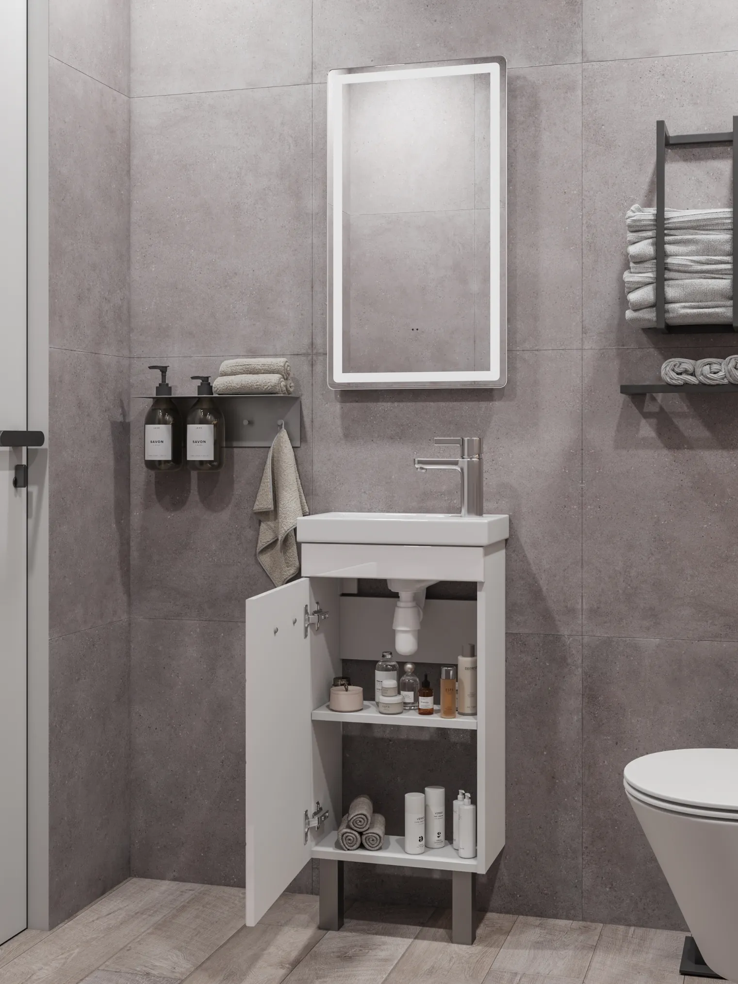 Петли с доводчиками обеспечивают плавное и бесшумное закрывание дверей. Внутри тумбы — удобное отделение для хранения бытовой химии, полотенец и других принадлежностей. Модель Bianca 400-1-0 продается без раковины и идеально сочетается с моделью раковины Como 40.