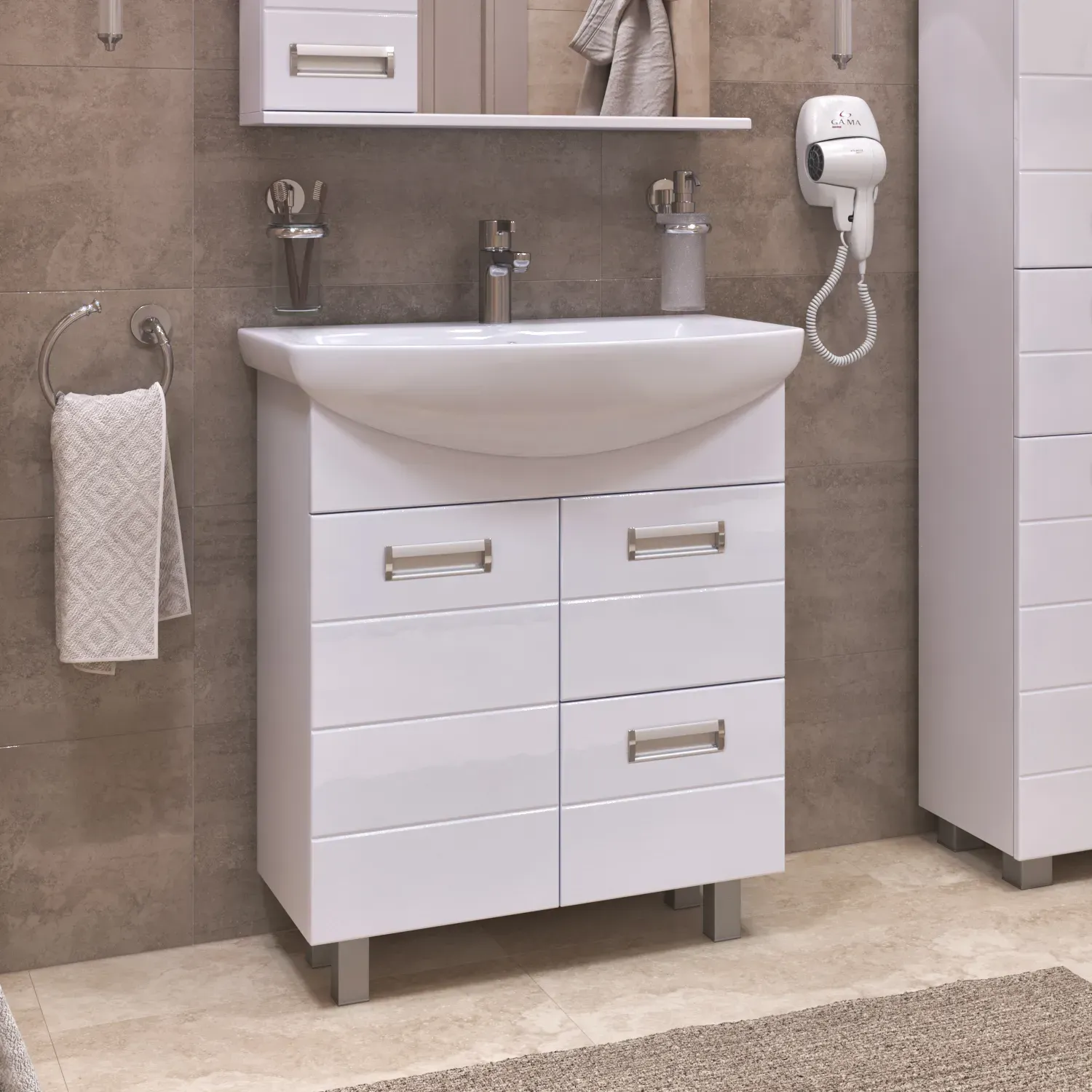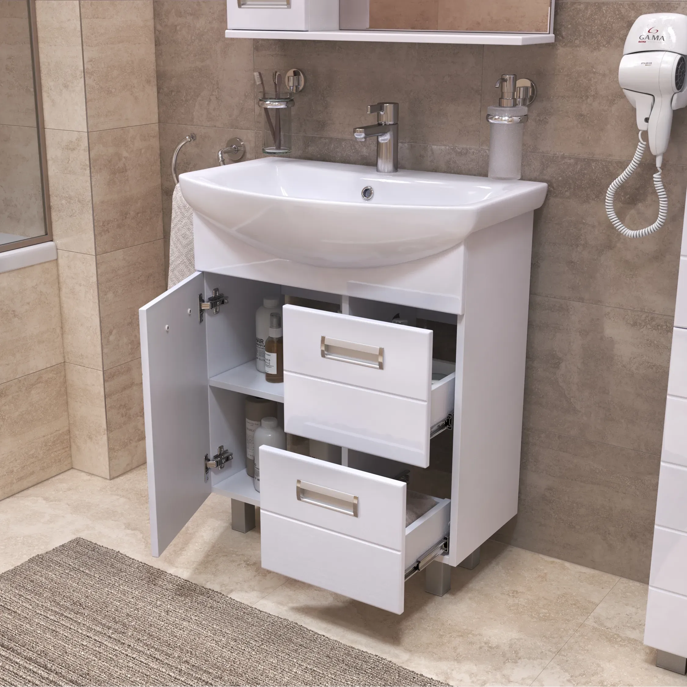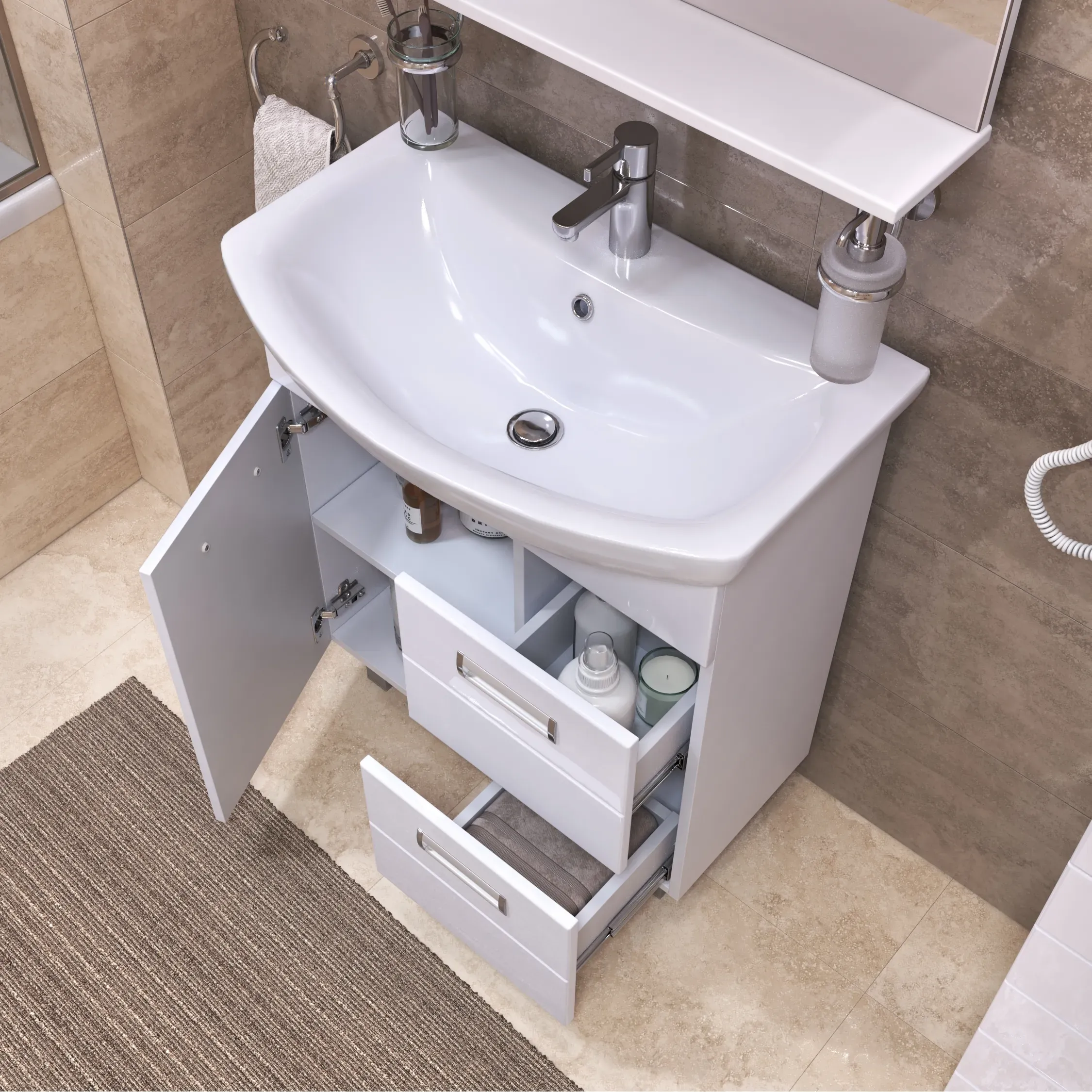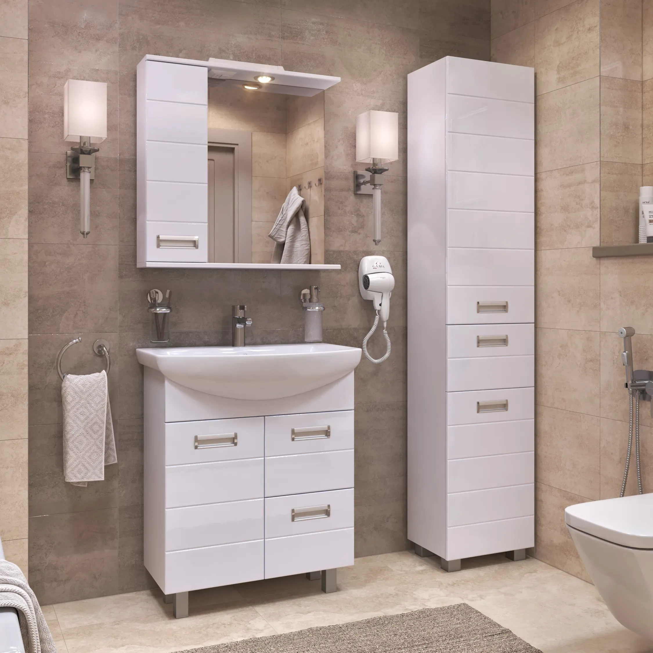 Тумба под раковину Bianca 700-1-2 — функциональное и эстетичное решение для современной ванной комнаты. Эта напольная тумба под раковину объединяет в себе эргономичный дизайн, надёжные материалы и продуманную систему хранения, обеспечивая комфорт в ежедневном использовании. Белый цвет корпуса делает интерьер ванной визуально светлее и просторнее, а глянцевые фасады из ЛМДФ, покрытые влагостойкой плёнкой ПВХ, придают мебели благородный блеск. Корпус из ЛДСП с матовым ламинированным покрытием устойчив к влаге, пару и перепадам температуры. Хромированная фурнитура подчёркивает современный стиль коллекции Bianca и добавляет интерьеру изысканности. В тумбе предусмотрены два выдвижных ящика и одна дверца, что позволяет удобно организовать хранение косметики, полотенец и бытовых принадлежностей. Механизмы доводчиков обеспечивают плавное и бесшумное закрывание фасадов, делая использование мебели особенно комфортным. Модель Bianca 700-1-2 поставляется без раковины, но идеально подходит под модель Балтика 70. Для подбора другой раковины важно учитывать размеры тумбы, указанные в технической схеме на странице товара, чтобы сохранить гармонию и удобство установки. OLEVARO — российский производитель мебели для ванных комнат, сочетающий современный дизайн, влагостойкие материалы и европейские стандарты качества. Продукция бренда отличается долговечностью, функциональностью и продуманными деталями, обеспечивающими комфорт на долгие годы. Если вы хотите купить напольную тумбу под раковину в ванную комнату, которая станет стильным акцентом интерьера и обеспечит порядок, — выбирайте Bianca 700-1-2.
