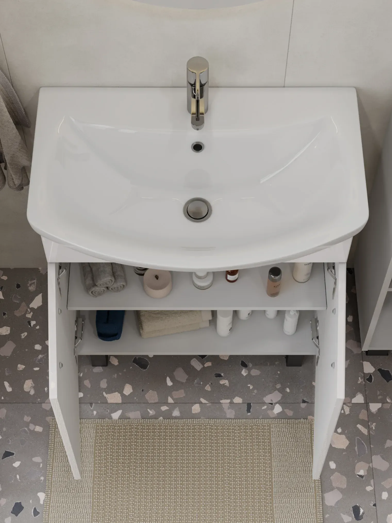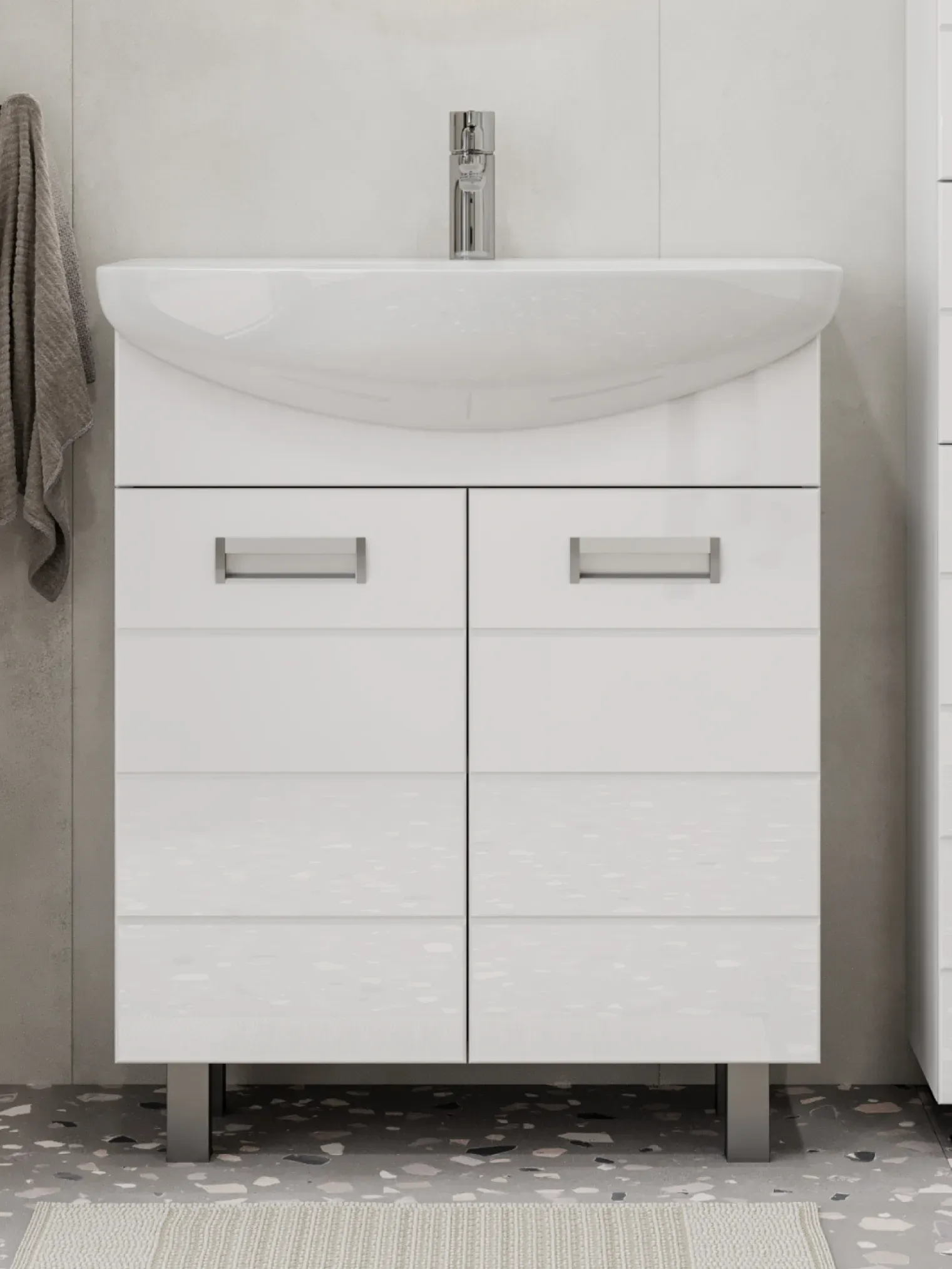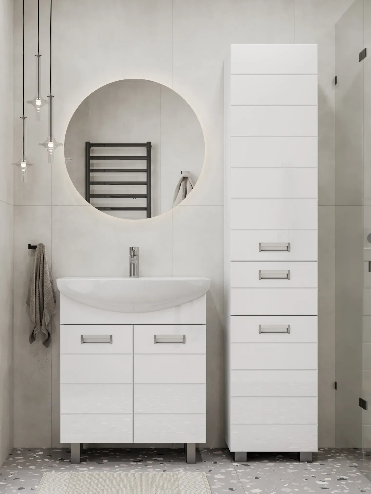 Тумба под раковину Bianca 700-2-0 — стильное и практичное решение для просторной ванной комнаты. Эта напольная тумба под раковину сочетает в себе лаконичный дизайн, устойчивость к влаге и продуманную систему хранения. Белый цвет корпуса и глянцевые фасады из ЛМДФ, покрытые влагостойкой плёнкой ПВХ, делают интерьер ванной визуально светлее и придают мебели благородный блеск. Корпус из ЛДСП с ламинированным покрытием защищён от влаги и перепадов температуры, а качественная фурнитура в цвете хром подчёркивает современный стиль коллекции Bianca. Две распашные дверцы открывают доступ к просторному внутреннему отделению, где удобно разместить всё необходимое — от полотенец до бытовой химии. Петли с доводчиками обеспечивают мягкое закрывание дверей и дополнительный комфорт при ежедневном использовании. Модель Bianca 700-2-0 поставляется без раковины, но идеально сочетается с моделью Балтика 70. Если вы планируете установить другую раковину, важно учитывать точные размеры тумбы, указанные в технической схеме на странице товара, чтобы обеспечить совместимость и удобство монтажа. OLEVARO — российский производитель мебели для ванных комнат, который объединяет современные технологии и высокий стандарт качества. Мебель бренда разрабатывается специально для эксплуатации во влажной среде, сохраняя эстетику и функциональность на долгие годы. Если вы хотите купить напольную тумбу под раковину в ванную комнату, которая станет центром стильного интерьера и обеспечит удобное хранение, — выбирайте Bianca 700-2-0.