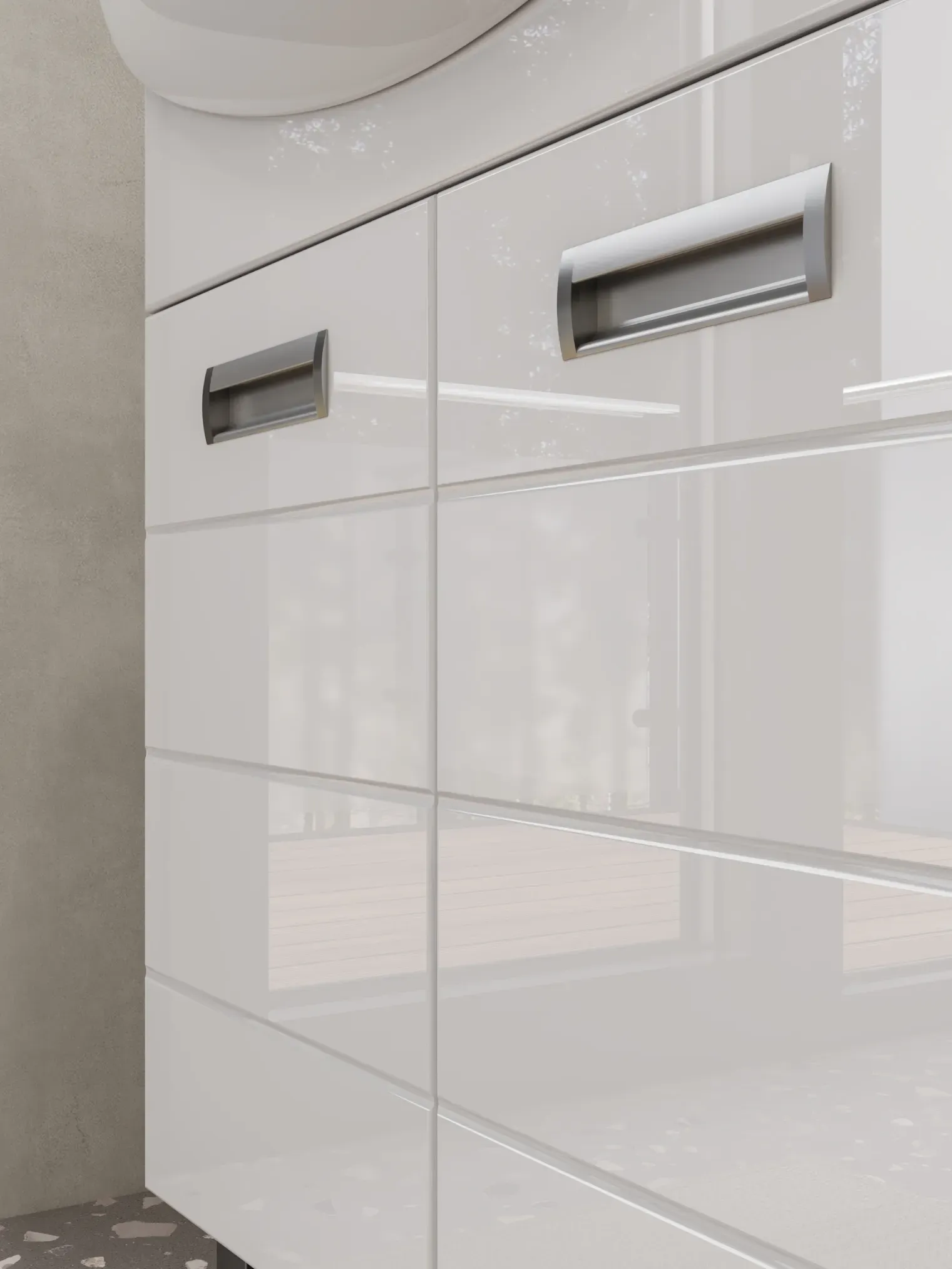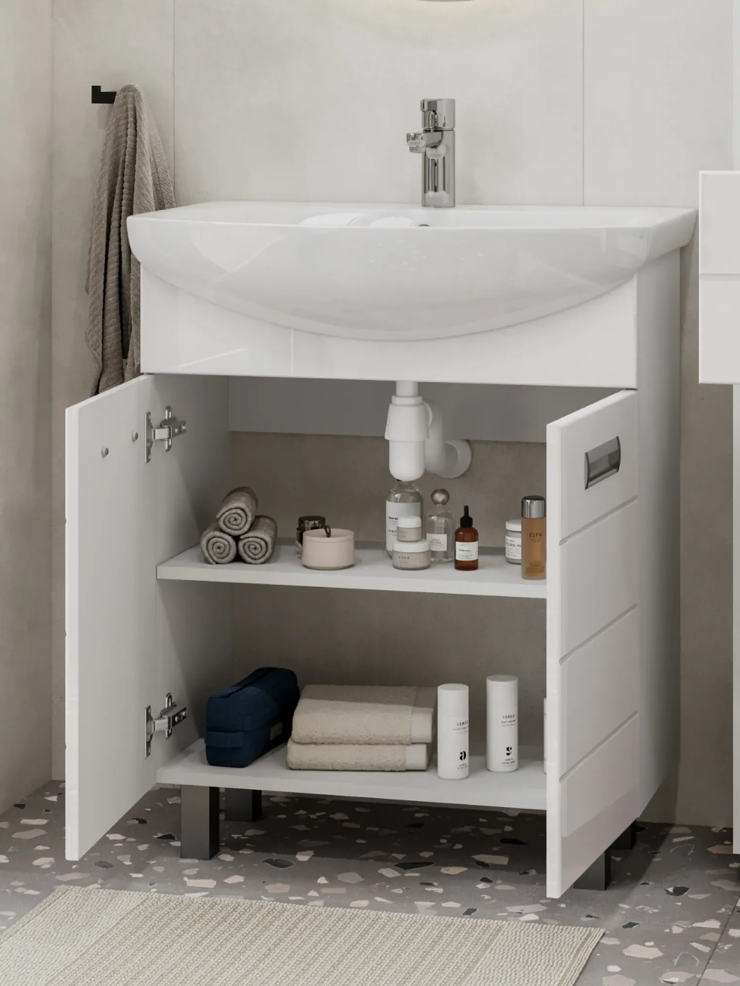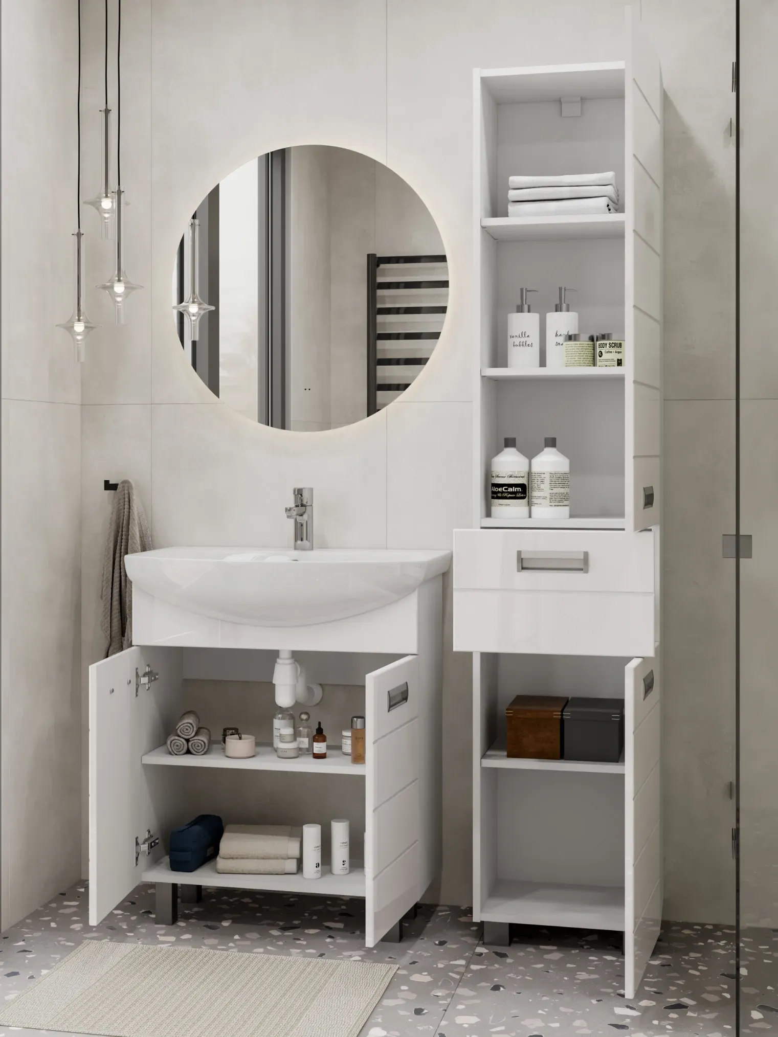 Тумба под раковину Bianca 700-2-0 — стильное и практичное решение для просторной ванной комнаты. Эта напольная тумба под раковину сочетает в себе лаконичный дизайн, устойчивость к влаге и продуманную систему хранения. Белый цвет корпуса и глянцевые фасады из ЛМДФ, покрытые влагостойкой плёнкой ПВХ, делают интерьер ванной визуально светлее и придают мебели благородный блеск. Корпус из ЛДСП с ламинированным покрытием защищён от влаги и перепадов температуры, а качественная фурнитура в цвете хром подчёркивает современный стиль коллекции Bianca. Две распашные дверцы открывают доступ к просторному внутреннему отделению, где удобно разместить всё необходимое — от полотенец до бытовой химии. Петли с доводчиками обеспечивают мягкое закрывание дверей и дополнительный комфорт при ежедневном использовании. Модель Bianca 700-2-0 поставляется без раковины, но идеально сочетается с моделью Балтика 70. Если вы планируете установить другую раковину, важно учитывать точные размеры тумбы, указанные в технической схеме на странице товара, чтобы обеспечить совместимость и удобство монтажа. OLEVARO — российский производитель мебели для ванных комнат, который объединяет современные технологии и высокий стандарт качества. Мебель бренда разрабатывается специально для эксплуатации во влажной среде, сохраняя эстетику и функциональность на долгие годы. Если вы хотите купить напольную тумбу под раковину в ванную комнату, которая станет центром стильного интерьера и обеспечит удобное хранение, — выбирайте Bianca 700-2-0.