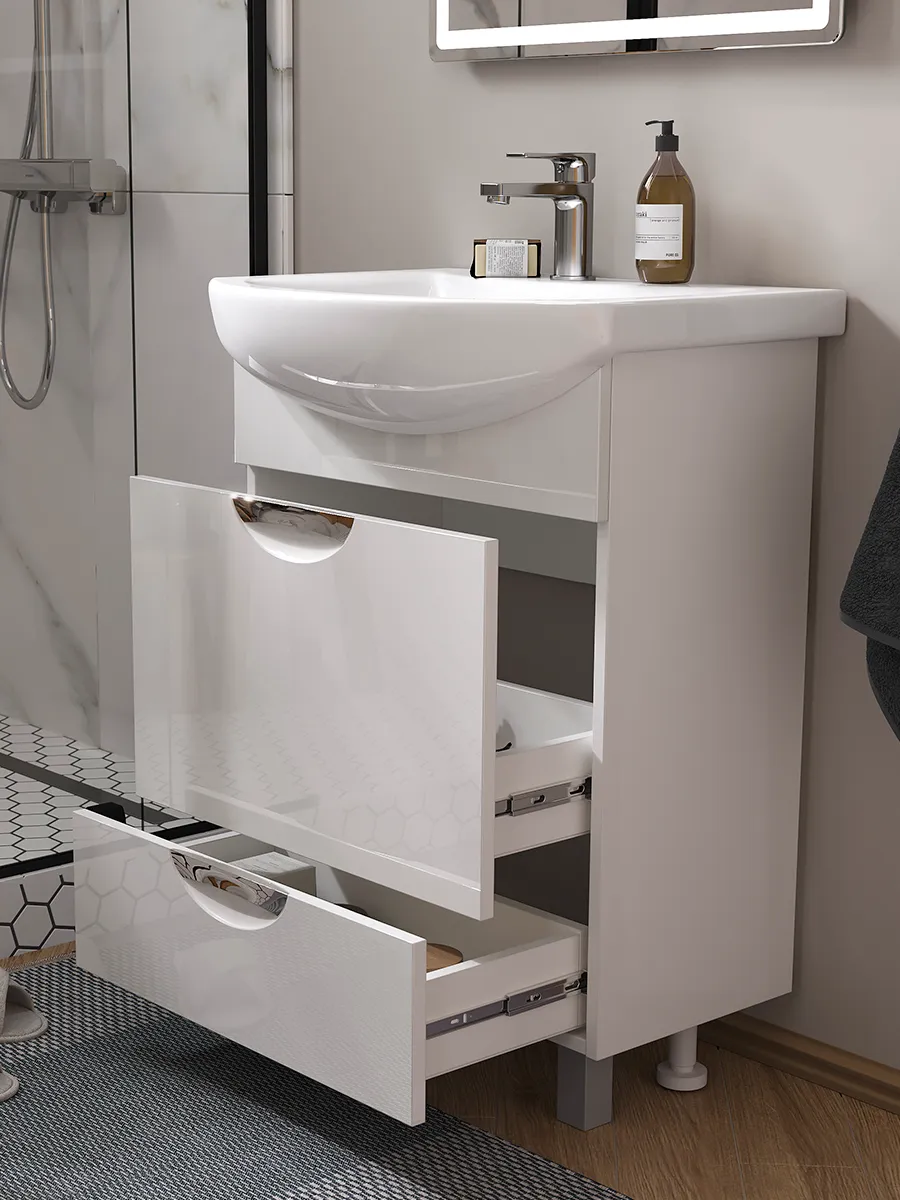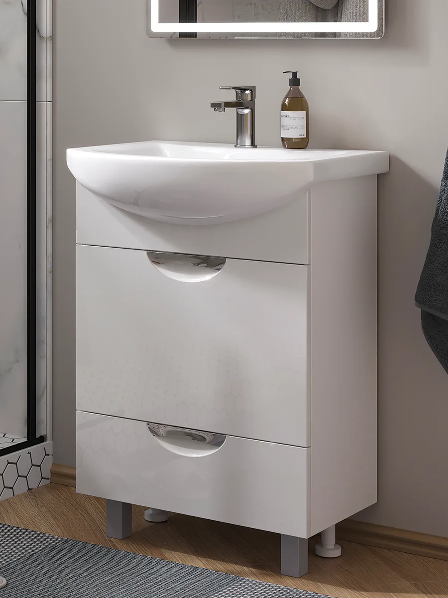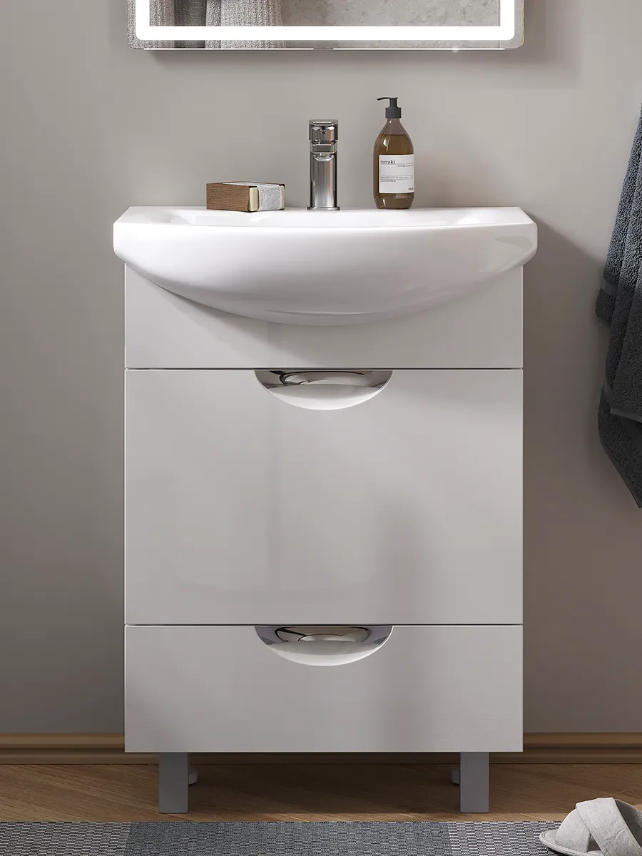 Тумба под раковину Colibri 600-0-2 — практичная и стильная модель, созданная для тех, кто ищет удобную систему хранения и современный внешний вид в ванной комнате. Компактная ширина 56 см позволяет разместить тумбу даже в небольших ванных, сохранив удобство использования и достаточное пространство под хранение. Корпус выполнен из влагостойкой ЛДСП с матовым ламинированным покрытием, устойчивым к пару и перепадам температуры. Глянцевые фасады из ЛМДФ, обработанные прочной плёнкой ПВХ, выглядят аккуратно, легко очищаются и сохраняют первоначальный вид даже при ежедневной эксплуатации. Хромированная лицевая фурнитура подчёркивает современный стиль коллекции Colibri. Тумба оснащена двумя выдвижными ящиками, которые удобно использовать для косметики, средств ухода, бытовой химии или аксессуаров. Ящики выдвигаются плавно и обеспечивают быстрый доступ к содержимому. Конструкция без доводчиков делает модель более доступной по цене, сохраняя при этом высокое качество исполнения. Модель Colibri 600-0-2 продаётся без раковины, но идеально подходит под умывальник Балтика 60. Если вы хотите подобрать раковину другого типа или бренда, ориентируйтесь на габариты тумбы и техническую схему, размещённую на странице товара. Бренд OLEVARO — российский производитель мебели для ванной комнаты, который совмещает современные технологии обработки материалов с актуальным дизайном. Мебель создаётся с учётом условий повышенной влажности и обеспечивает долговечность, практичность и комфорт в использовании. Если вы хотите купить напольную тумбу под раковину, компактную, удобную и современную — Colibri 600-0-2 станет отличным выбором для вашей ванной комнаты.