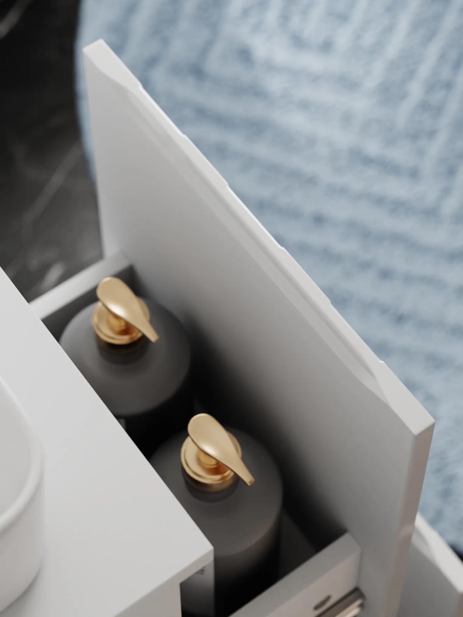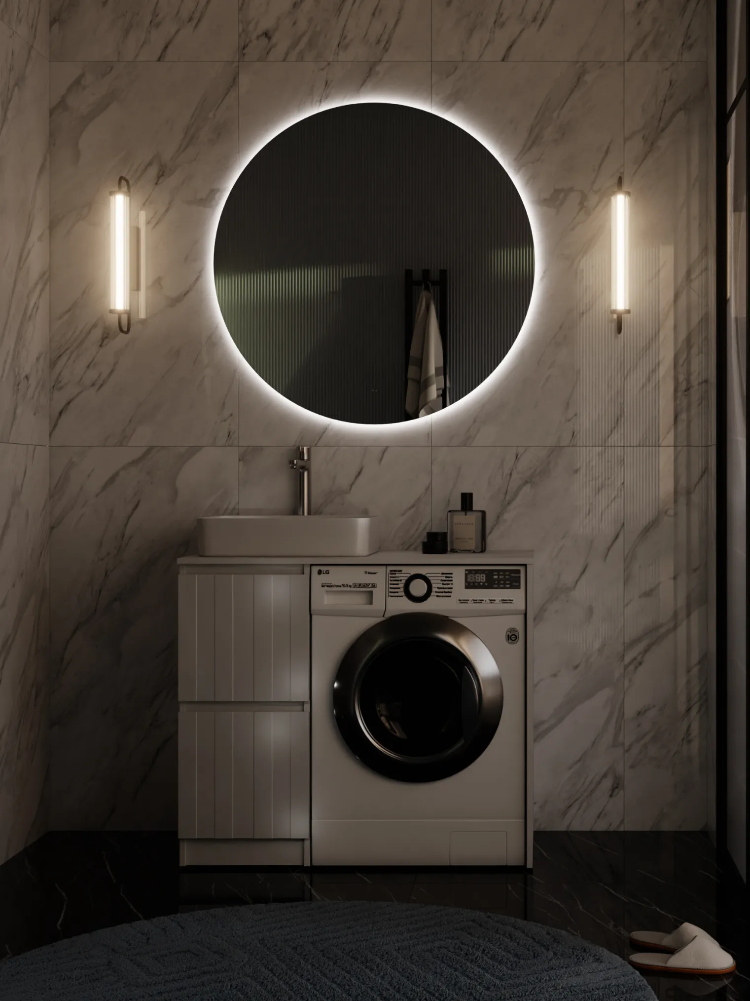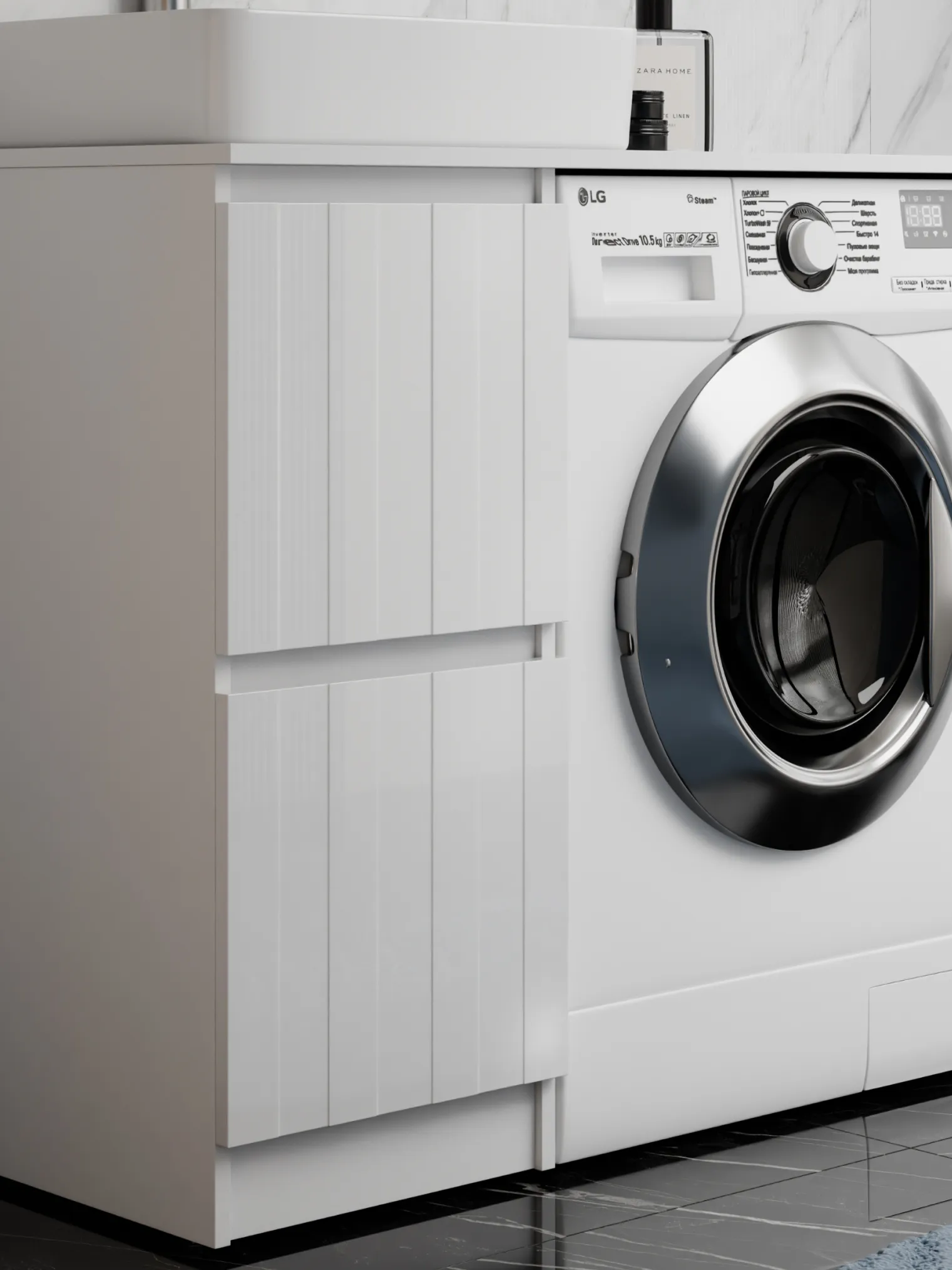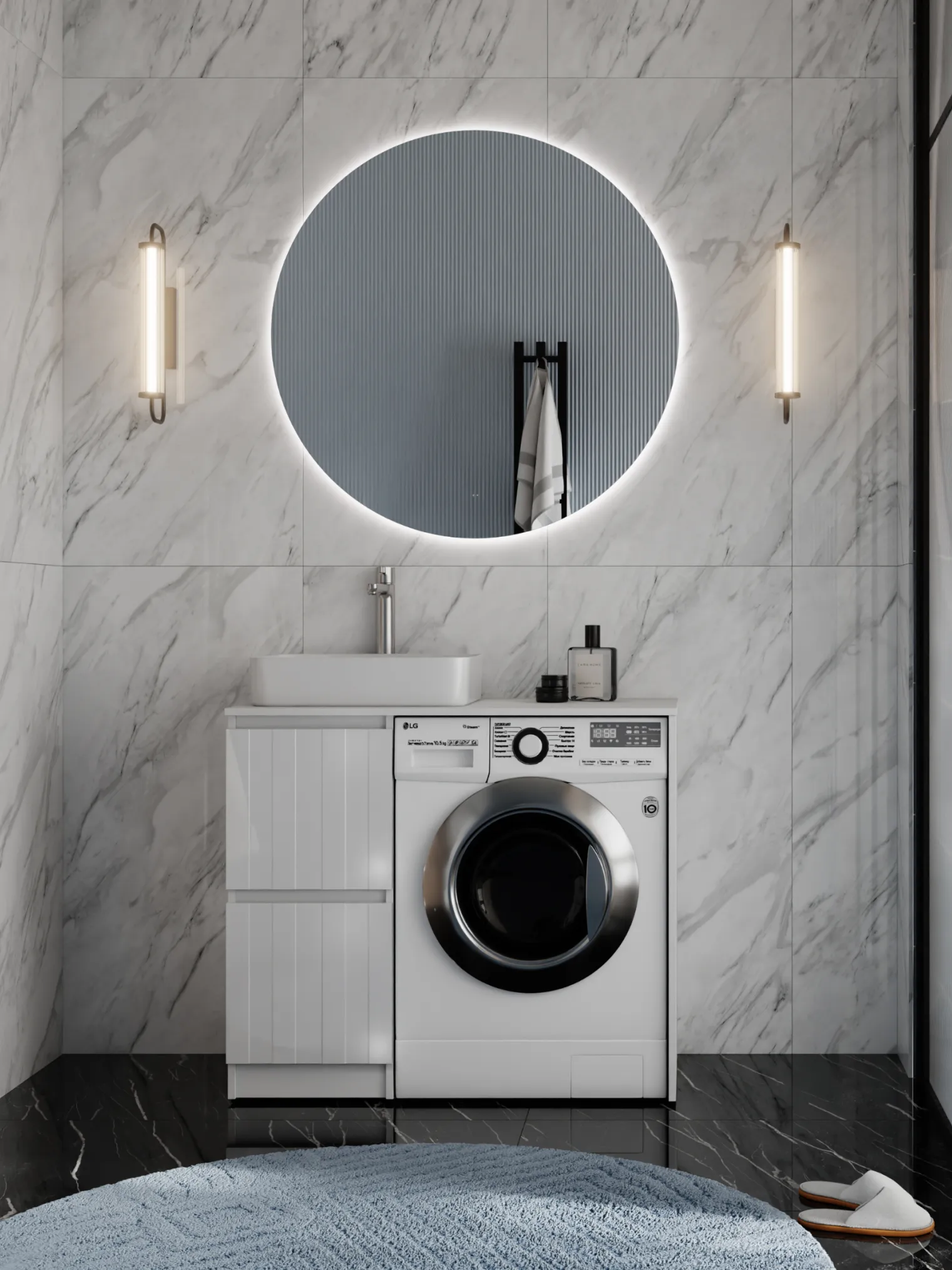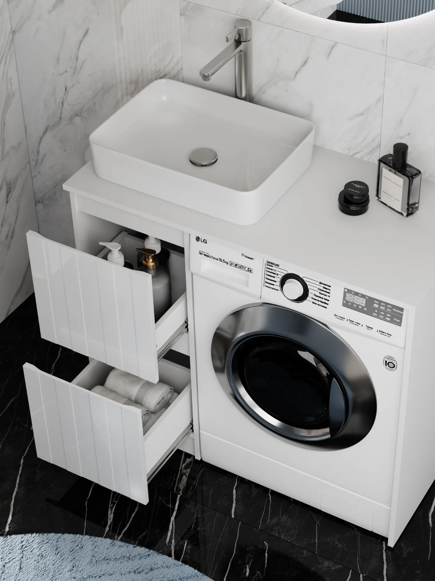 Тумба под раковину Ellio 1000-0-2 со столешницей под стиральную машину — продуманное решение для тех, кто хочет объединить зону умывания и бытовую технику в единой, аккуратной и функциональной композиции. Модель позволяет установить стиральную машину под общей столешницей, экономя пространство и создавая цельный, современный вид ванной комнаты. Корпус выполнен из влагостойкой ЛДСП с матовым ламинированным покрытием, устойчивым к воздействию влаги, пара и бытовых нагрузок. Глянцевые фасады из ЛМДФ, покрытые прочной ПВХ-плёнкой, сохраняют блеск и свежий внешний вид, а лаконичная интегрированная ручка подчёркивает минималистичный стиль коллекции Ellio. Внутри тумбы расположены два глубоких выдвижных ящика — удобная система хранения для косметики, средств ухода, полотенец и других необходимых вещей. Благодаря широкой столешнице обеспечивается удобная рабочая поверхность, а также возможность установки накладной раковины на выбор. Модель поставляется без раковины, что позволяет гибко подобрать умывальник под ваш интерьер. При выборе важно учитывать размеры тумбы и особенности размещения стиральной машины — все данные указаны в технической схеме на странице товара. OLEVARO — российский производитель мебели для ванных комнат, который создаёт практичные решения для современных интерьеров. Вся продукция проектируется с учётом эксплуатации во влажной среде, сочетая функциональность, долгий срок службы и современную эстетику. Если вы хотите организовать пространство ванной максимально рационально и стильно, тумба Ellio 1000-0-2 со столешницей под стиральную машину станет отличным выбором и поможет создать аккуратную, удобную и гармоничную бытовую зону.