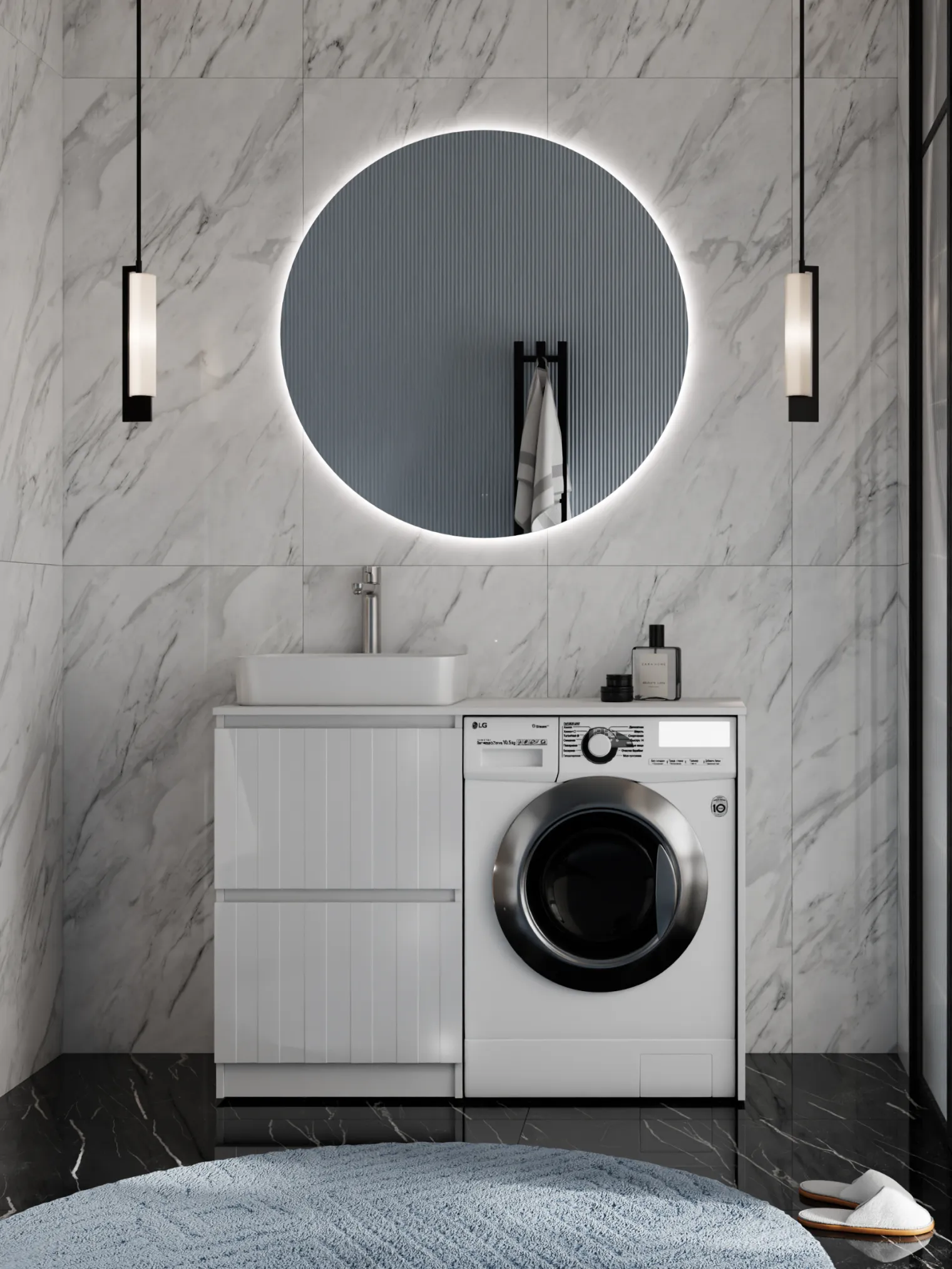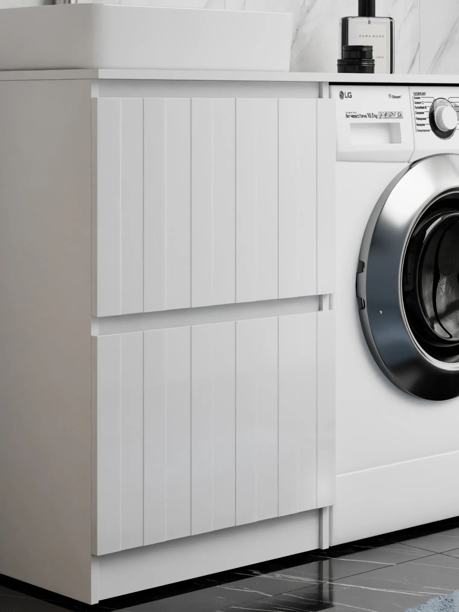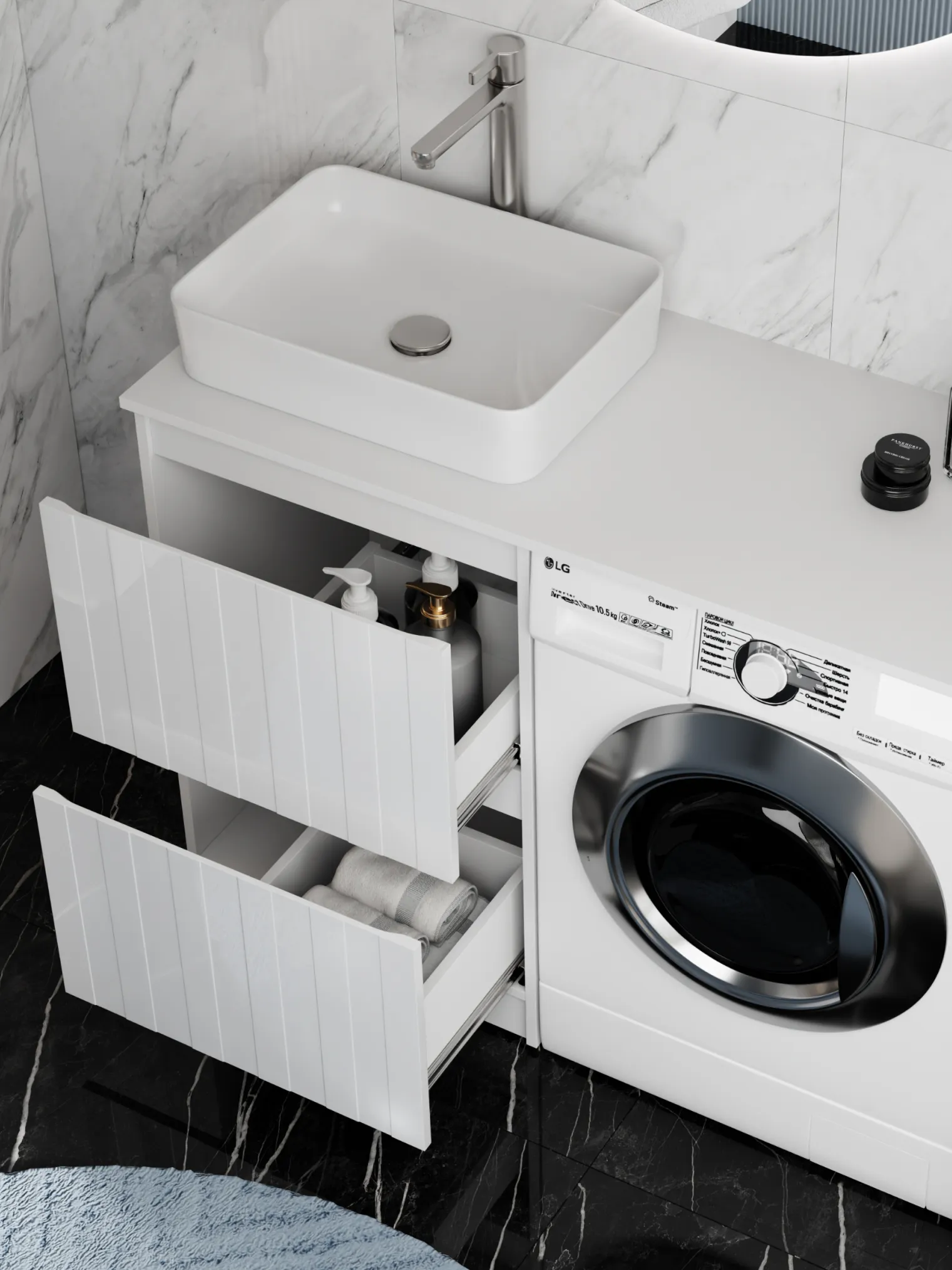 Тумба под раковину Ellio 1200-0-2 со столешницей под стиральную машину — это функциональное, стильное и продуманное решение для просторных ванных комнат, где важно объединить зону умывания и бытовую технику в единой гармоничной композиции. Благодаря увеличенной ширине модель обеспечивает комфортное использование, широкую рабочую поверхность и продуманное хранение. Корпус выполнен из влагостойкой ЛДСП с матовым ламинированным покрытием, устойчивым к влаге, пару и ежедневным нагрузкам. Глянцевые фасады из ЛМДФ, покрытые прочной ПВХ-плёнкой, придают мебели аккуратный внешний вид и легко очищаются. Интегрированная ручка подчёркивает чистый и современный дизайн коллекции Ellio. Тумба оснащена двумя глубокими выдвижными ящиками, которые позволяют удобно хранить косметику, бытовую химию, полотенца и аксессуары. Широкая столешница создаёт просторную рабочую зону, а также позволяет интегрировать накладную раковину или подобрать модель умывальника по вашему стилю. Конструкция разработана так, чтобы стиральная машина аккуратно располагалась под столешницей, экономя место и формируя единое визуально чистое пространство. Тумба поставляется без раковины, что даёт свободу выбора. Для правильного подбора умывальника и техники важно учитывать габариты, указанные в технической схеме на странице товара. OLEVARO — российский производитель мебели для ванных комнат, специализирующийся на создании практичных, долговечных и эстетичных решений. Продукция бренда выдерживает условия повышенной влажности и сохраняет свой внешний вид многие годы. Если вы хотите организовать ванную максимально рационально и современно, Ellio 1200-0-2 со столешницей под стиральную машину станет отличным выбором: просторная, удобная и идеально подходящая для интеграции техники и раковины в единую систему.