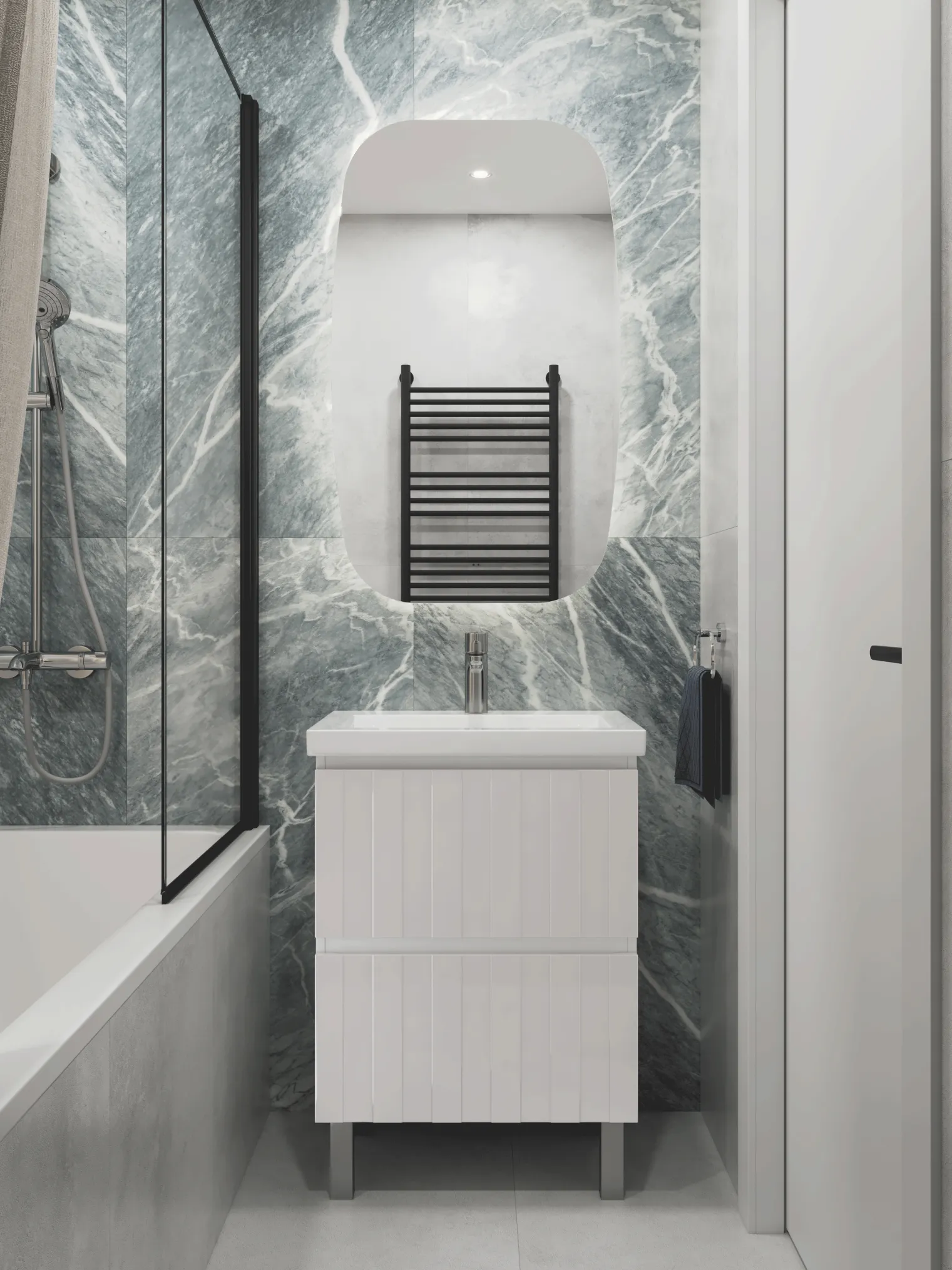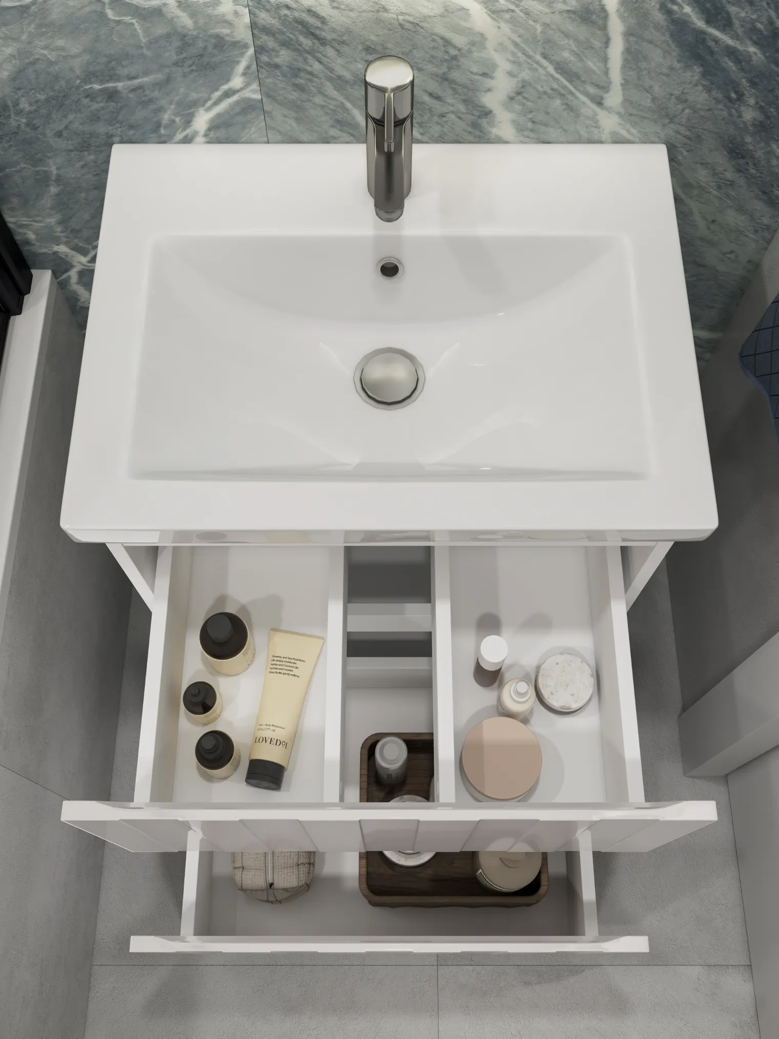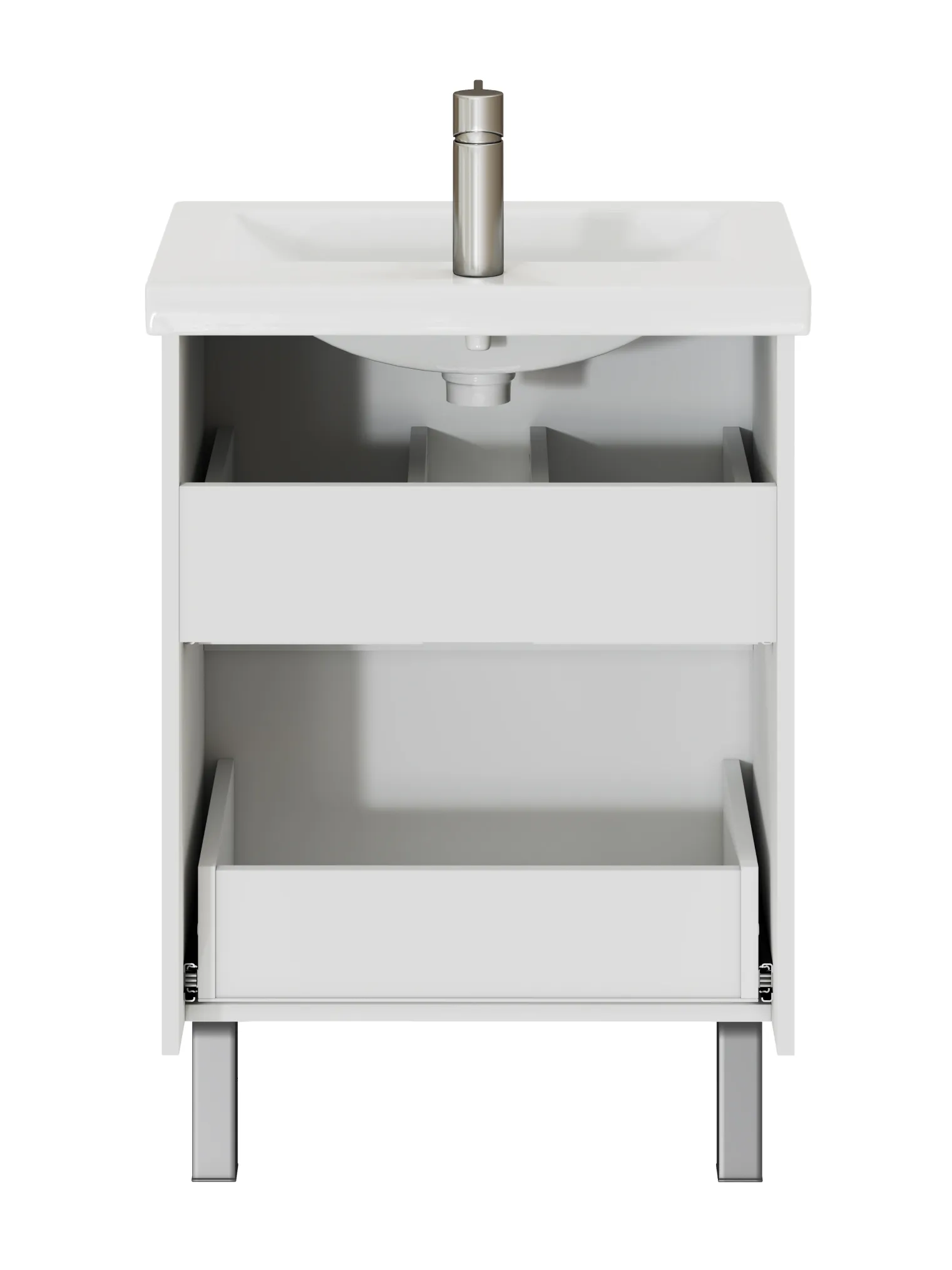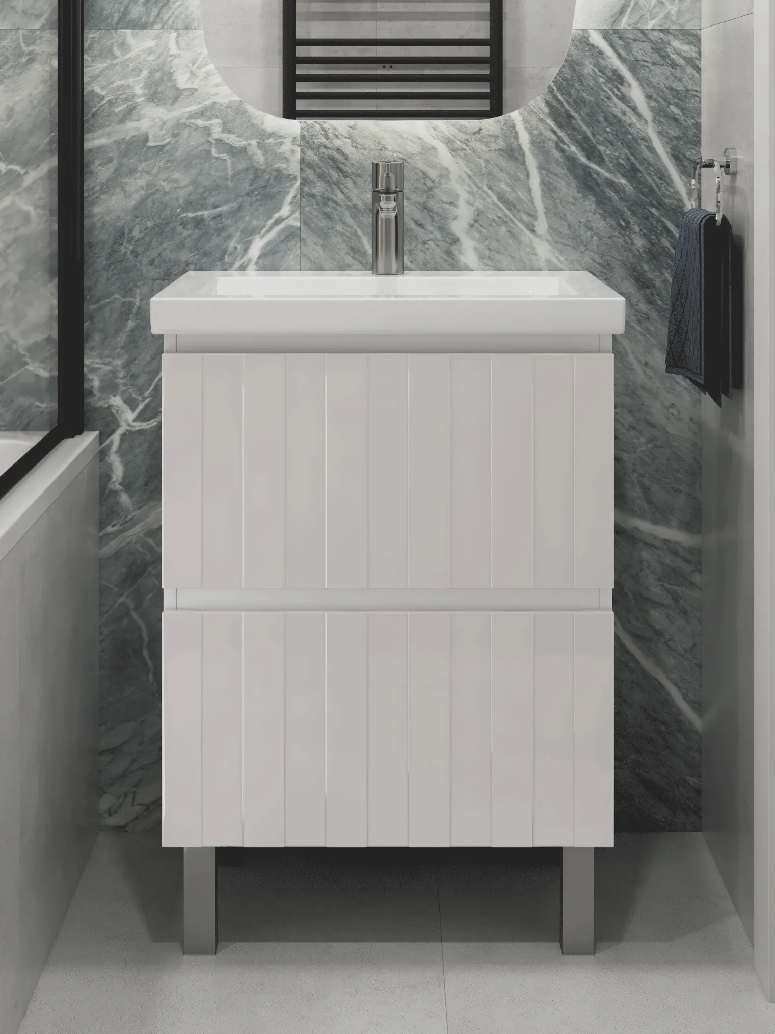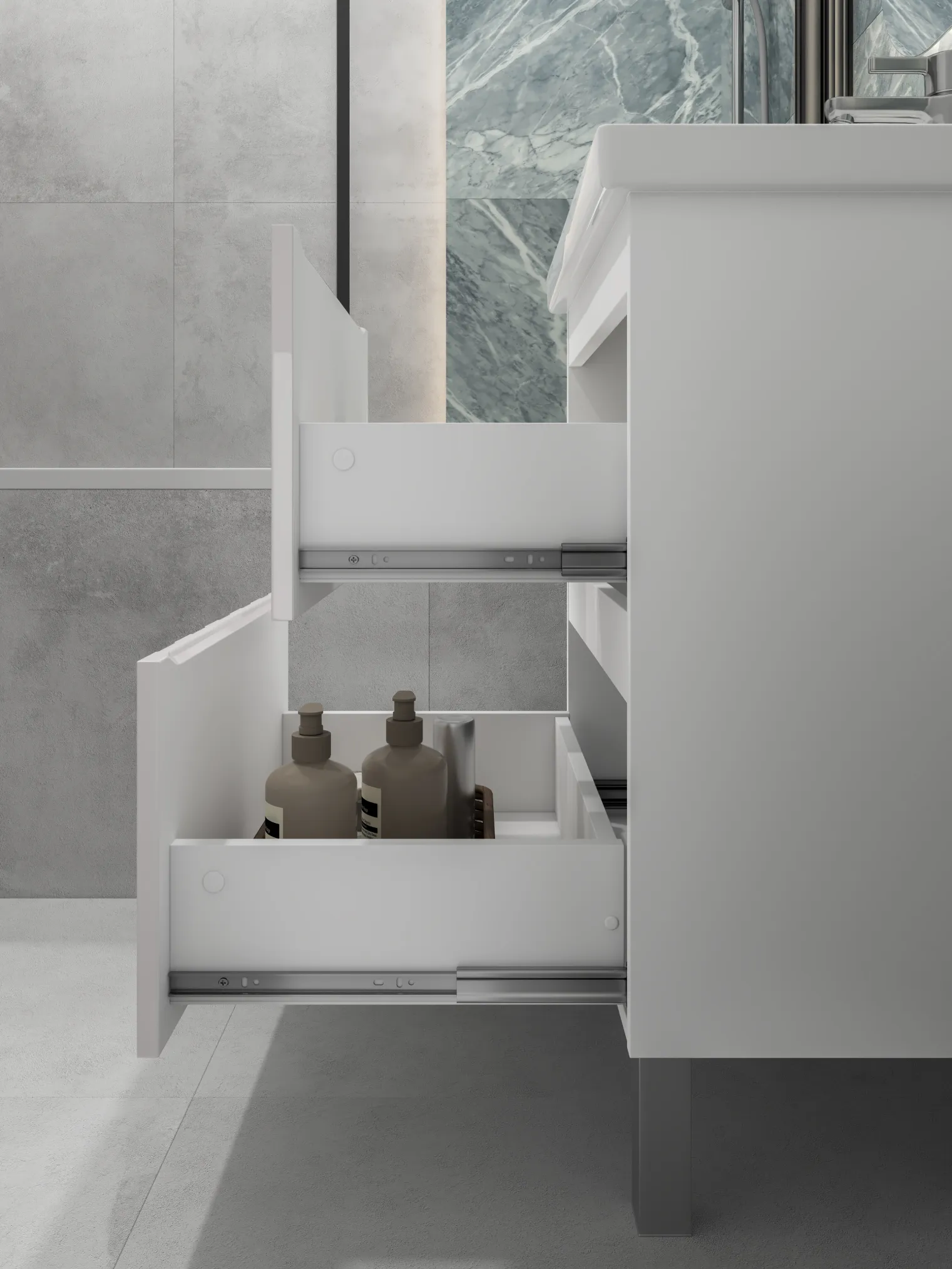 Тумба под раковину Ellio 600-0-2 — стильное решение для тех, кто ценит современный минимализм и функциональность. Эта напольная тумба для ванной комнаты с двумя выдвижными ящиками сочетает лаконичный дизайн, качественные материалы и практичность в использовании. Белый цвет корпуса и глянцевые фасады из ЛМДФ, покрытые прочной влагостойкой плёнкой ПВХ, визуально освежают интерьер и создают ощущение чистоты и лёгкости. Матовая ЛДСП с ламинированным покрытием устойчива к влаге, пару и перепадам температуры, что делает мебель долговечной даже в условиях повышенной влажности. Два вместительных выдвижных ящика позволяют удобно хранить косметику, полотенца и бытовые принадлежности, помогая поддерживать порядок в ванной комнате. Интегрированные ручки обеспечивают удобное открывание и подчёркивают современный облик мебели. Модель Ellio 600-0-2 поставляется без раковины, но идеально подходит под умывальник Como 60. При необходимости можно подобрать другую раковину, ориентируясь на точные размеры тумбы, указанные в технической схеме. OLEVARO — российский производитель мебели для ванной комнаты, который сочетает продуманный дизайн, надёжные материалы и высокие стандарты качества. Вся продукция создаётся с учётом эксплуатации во влажной среде и рассчитана на долгий срок службы. Если вы хотите купить напольную тумбу под раковину в ванную комнату, которая будет сочетать стиль, функциональность и долговечность, — модель Ellio 600-0-2 от OLEVARO станет отличным выбором.