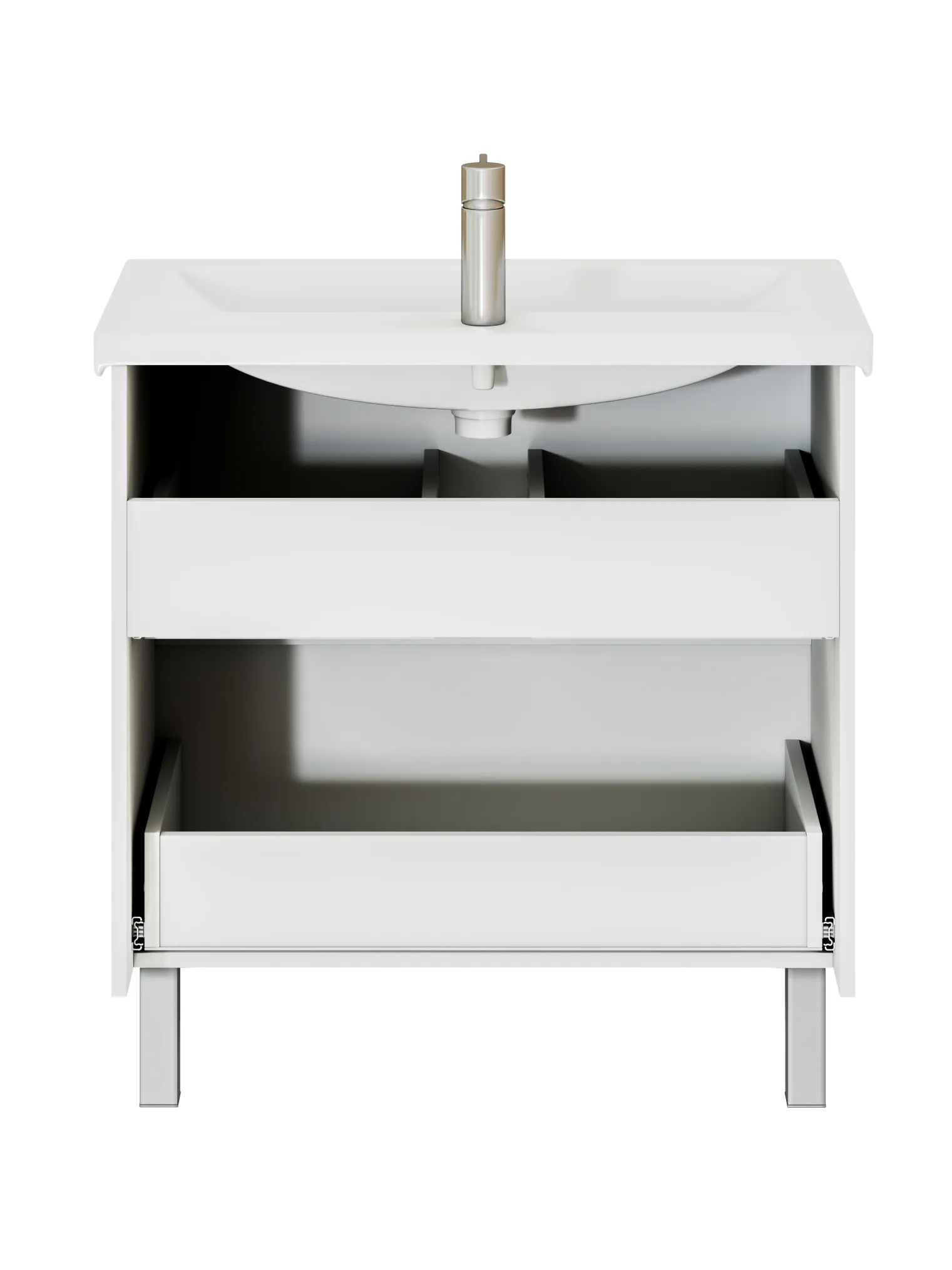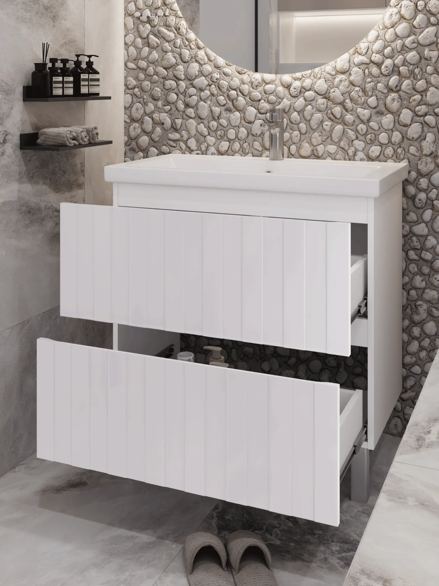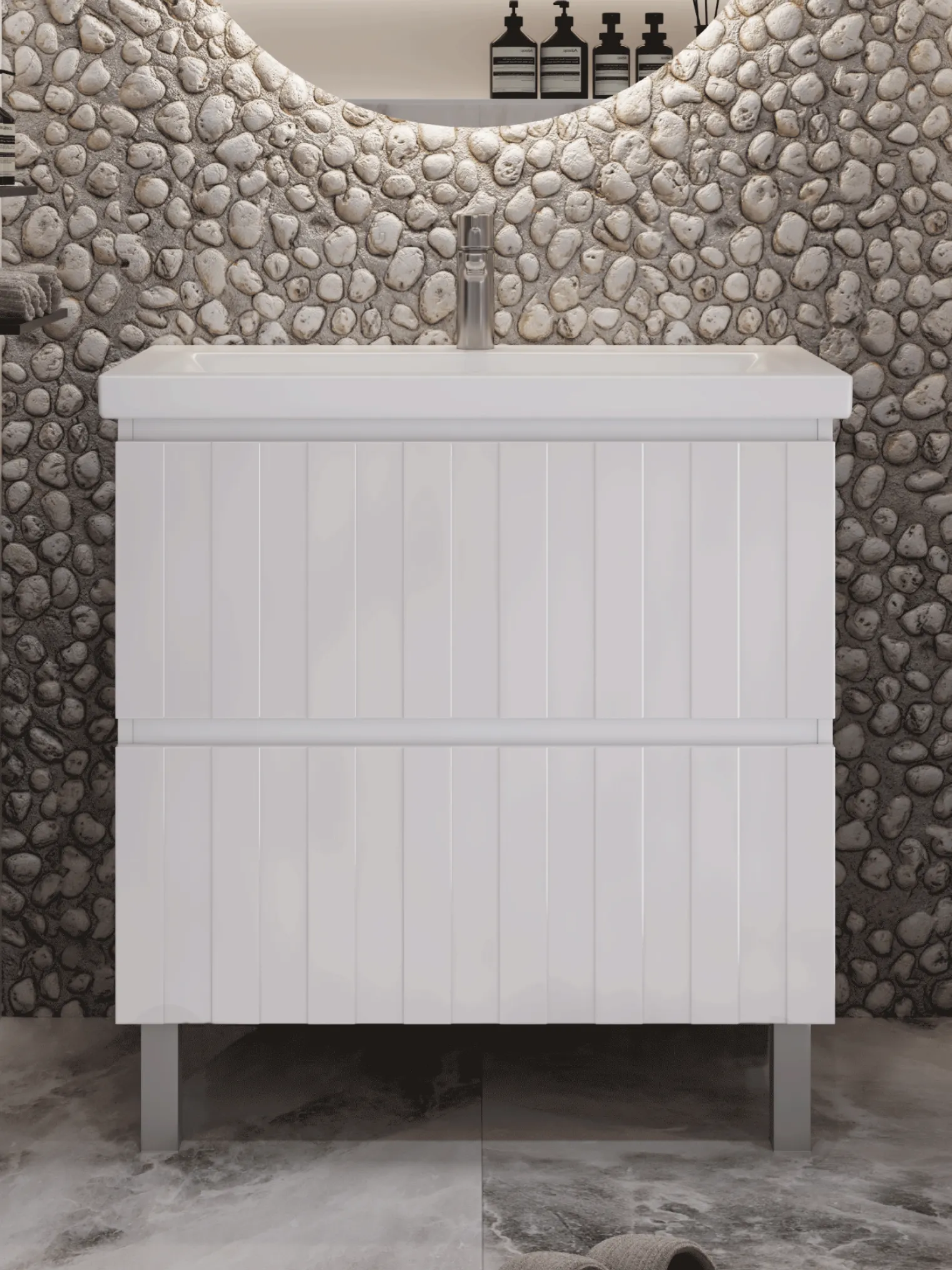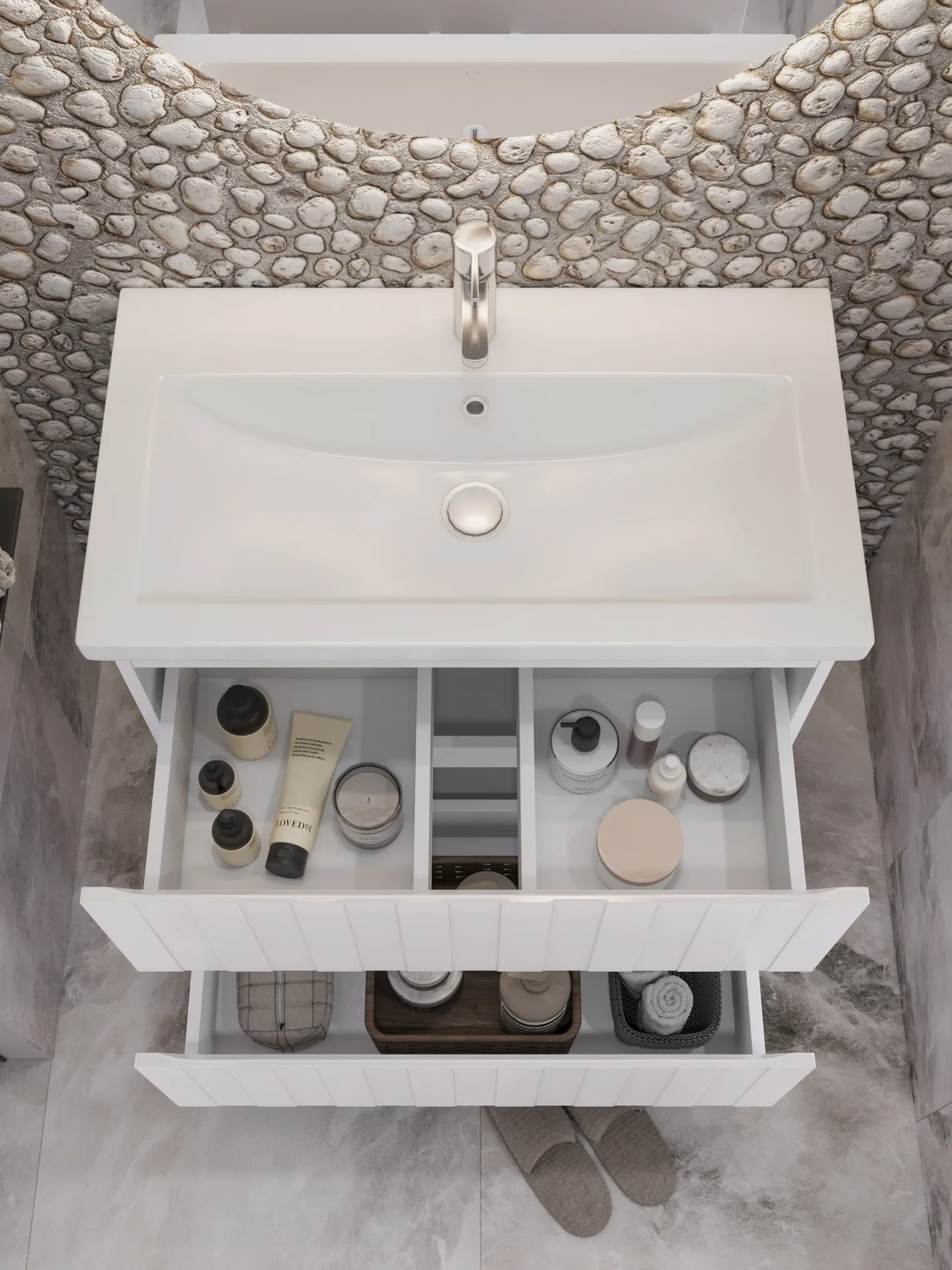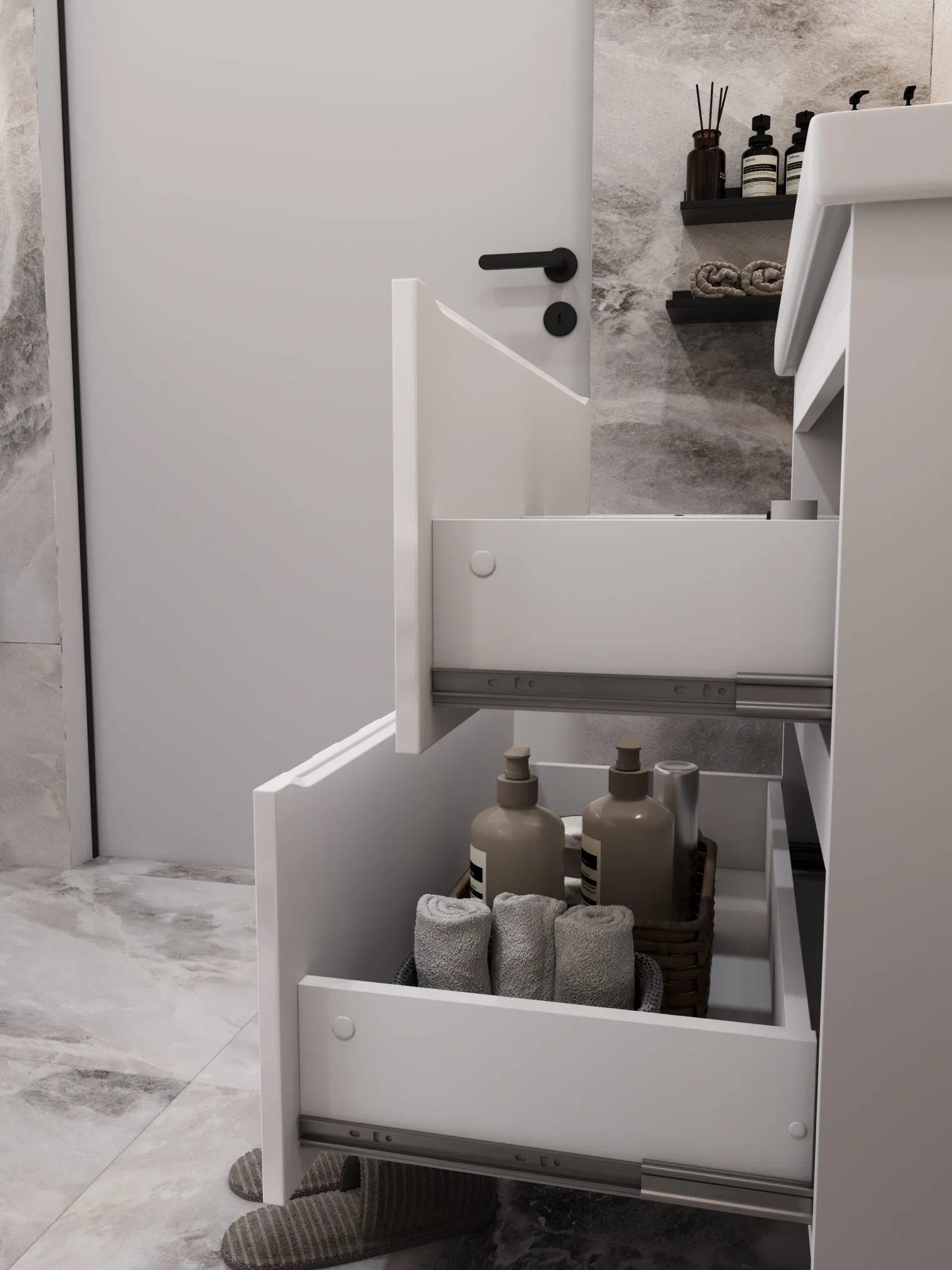 Тумба под раковину Ellio 800-0-2 — удобное, функциональное и эстетичное решение для просторных ванных комнат, где важно сочетание стиля и практичности. Широкая конструкция обеспечивает комфорт при использовании раковины и даёт больше пространства для хранения. Корпус тумбы выполнен из влагостойкой ЛДСП с матовым ламинированным покрытием, устойчивым к воздействию влаги, пара и бытовых нагрузок. Глянцевые фасады из ЛМДФ, защищённые прочной плёнкой ПВХ, сохраняют свой блеск и внешний вид даже при интенсивной эксплуатации. Интегрированная ручка поддерживает чистые линии дизайна и делает внешний вид лаконичным и современным. Два объёмных выдвижных ящика позволяют организовать хранение косметики, бытовой химии, полотенец и аксессуаров. Ящики обеспечивают доступ ко всему содержимому без необходимости наклоняться или заглядывать внутрь, что делает ежедневное использование особенно удобным. Тумба Ellio 800-0-2 поставляется без раковины, но идеально подходит под умывальник Como 80. При желании можно подобрать другую раковину, ориентируясь на точные размеры тумбы, указанные в технической схеме. OLEVARO — российский производитель мебели для ванных комнат, который сочетает современный дизайн, качественные материалы и практичные решения. Продукция разработана специально для влажной среды и сохраняет надёжность и внешний вид долгие годы. Если вы ищете просторную, современную и устойчивую к влаге напольную тумбу под раковину, модель Ellio 800-0-2 (Como) станет отличным выбором и подчеркнёт индивидуальность интерьера вашей ванной комнаты.
