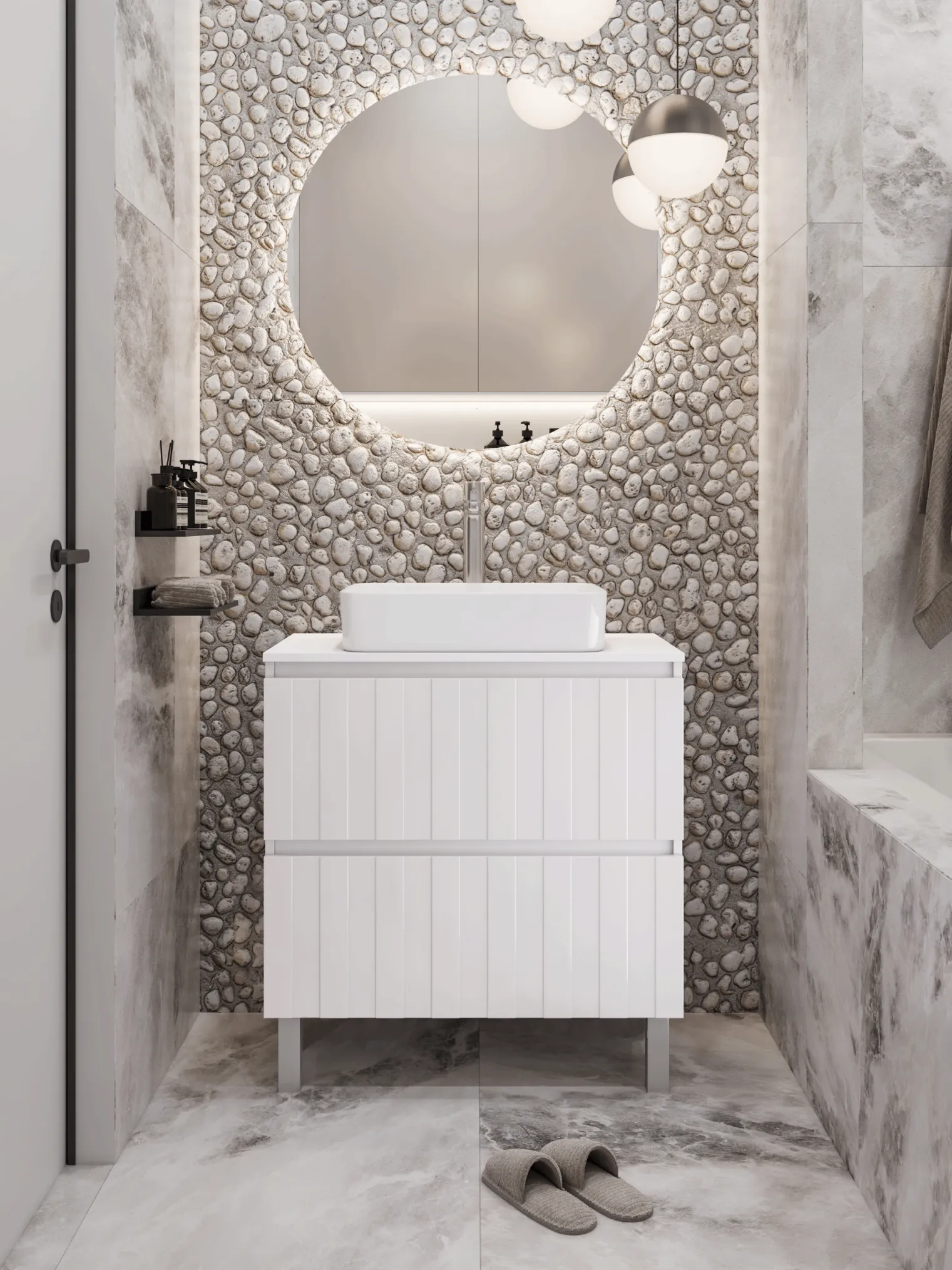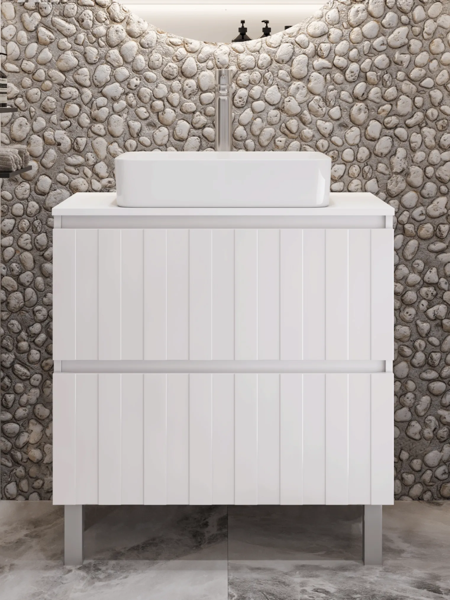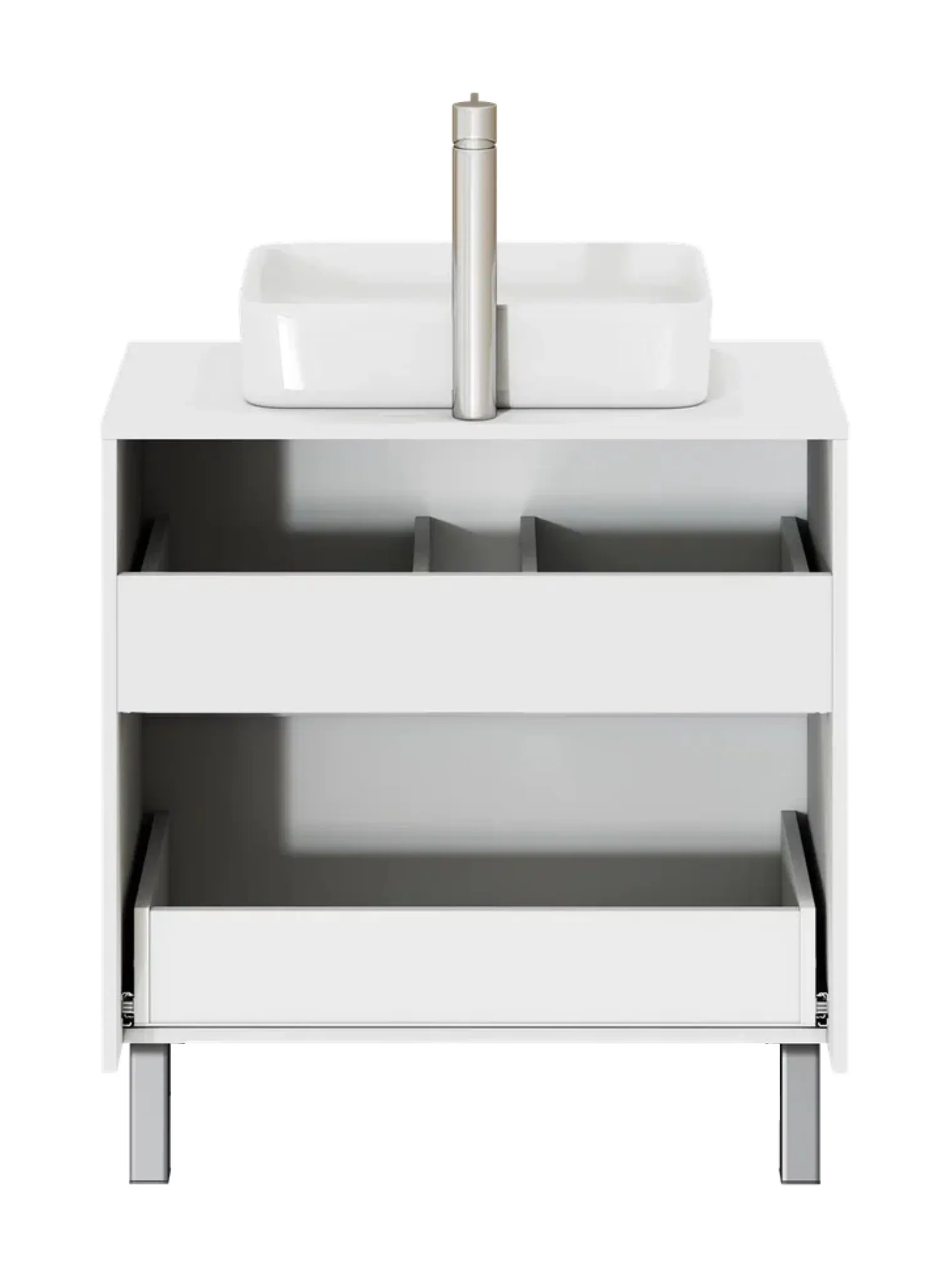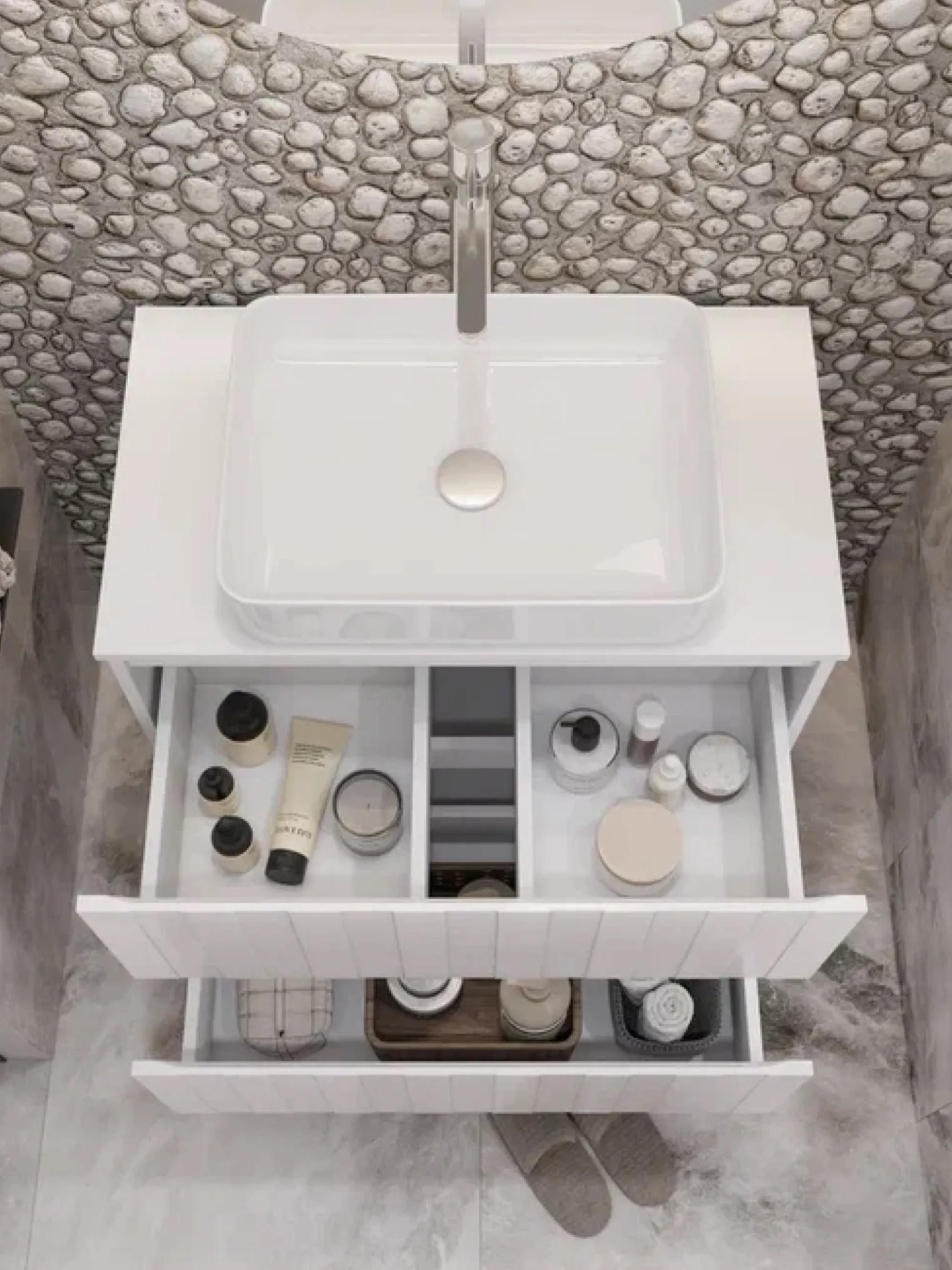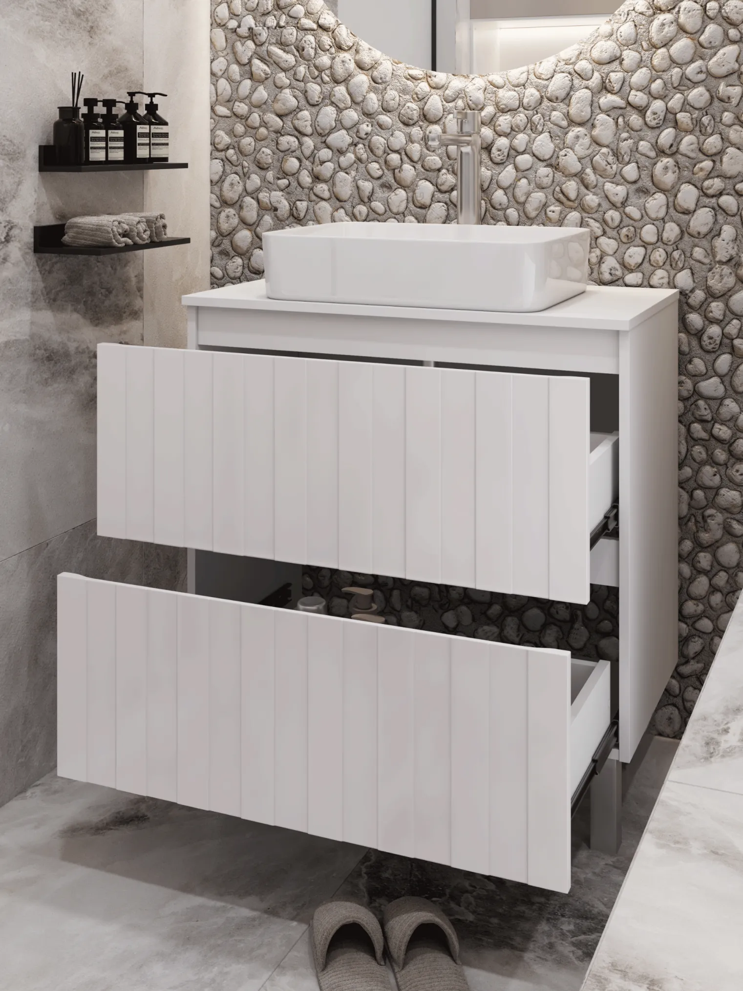 Тумба под раковину Ellio 800-0-2 со столешницей — практичное и стильное решение для тех, кто хочет создать современную и функциональную зону умывания в просторной ванной комнате. Увеличенная ширина обеспечивает комфорт использования и дополнительное пространство для хранения, не перегружая интерьер. Корпус выполнен из влагостойкой ЛДСП с матовым ламинированным покрытием, устойчивым к пару, влаге и ежедневным бытовым нагрузкам. Глянцевые фасады из ЛМДФ, покрытые качественной плёнкой ПВХ, добавляют мягкий блеск и легко очищаются, сохраняя безупречный вид даже при регулярном использовании. Интегрированная ручка подчёркивает лаконичность и чистоту дизайна коллекции Ellio. Внутри расположены два глубоких выдвижных ящика — удобная система хранения для косметики, средств ухода, полотенец и других аксессуаров. Ящики выдвигаются плавно и позволяют поддерживать идеальный порядок без лишних усилий. Тумба оснащена столешницей, что делает её универсальным вариантом: вы можете установить на неё накладную раковину или подобрать модель, которая будет максимально соответствовать стилю ванной. Тумба поставляется без раковины, поэтому при выборе умывальника важно учитывать размеры, указанные в технической схеме на странице товара. Бренд OLEVARO — российский производитель мебели для ванных комнат, известный стремлением к качеству и продуманному исполнению. Каждая модель создаётся с учётом особенностей влажной среды и сочетает функциональность, современный дизайн и износостойкие материалы. Если вы ищете вместительную и долговечную напольную тумбу под раковину со столешницей для просторной ванной комнаты, модель Ellio 800-0-2 станет отличным решением, создавая гармонию, аккуратность и эстетичность в вашем пространстве.