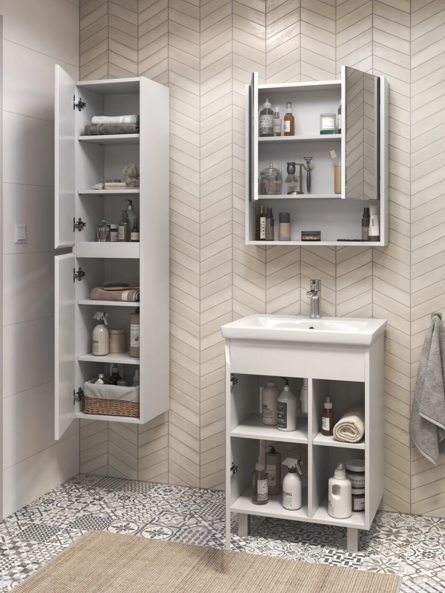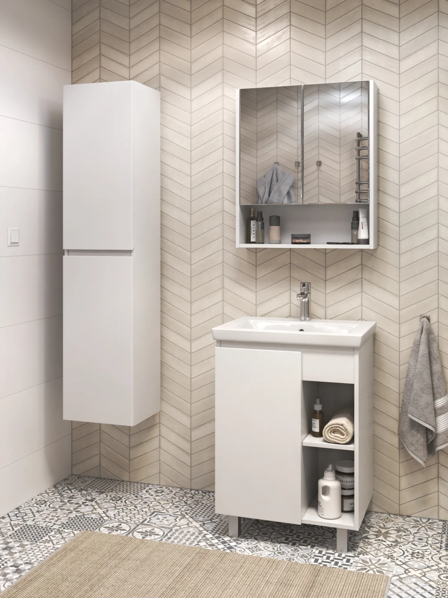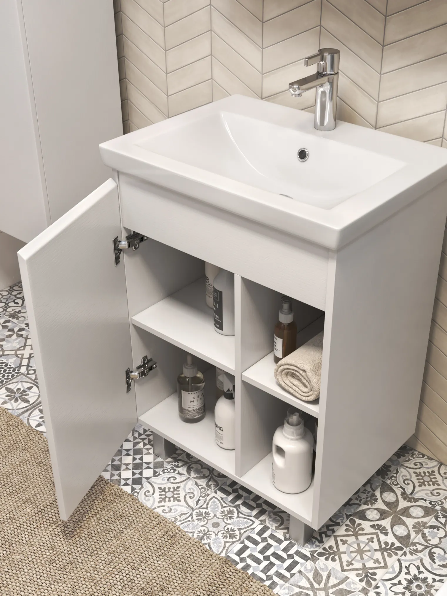 Напольная тумба под раковину Modul 600-1-0 в белом цвете — это функциональное и эстетичное решение для ванных комнат любого размера. Ширина 56,8 см делает модель удобной для небольших и средних помещений, а увеличенная глубина 43,4 см обеспечивает больше пространства для хранения и повышенную удобность эксплуатации. Корпус и фасады выполнены из влагостойкой ЛДСП с матовым ламинированным покрытием, устойчивым к воздействию влаги, перепадам температуры и ежедневным нагрузкам. Белый цвет делает тумбу визуально лёгкой, освежает интерьер и помогает создать ощущение чистоты и порядка. Фасад оснащён интегрированной ручкой, благодаря которой тумба выглядит современно и лаконично, без выступающих деталей. За распашной дверцей находится вместительное отделение, удобное для хранения бытовой химии, аксессуаров для ухода, косметики или текстиля.