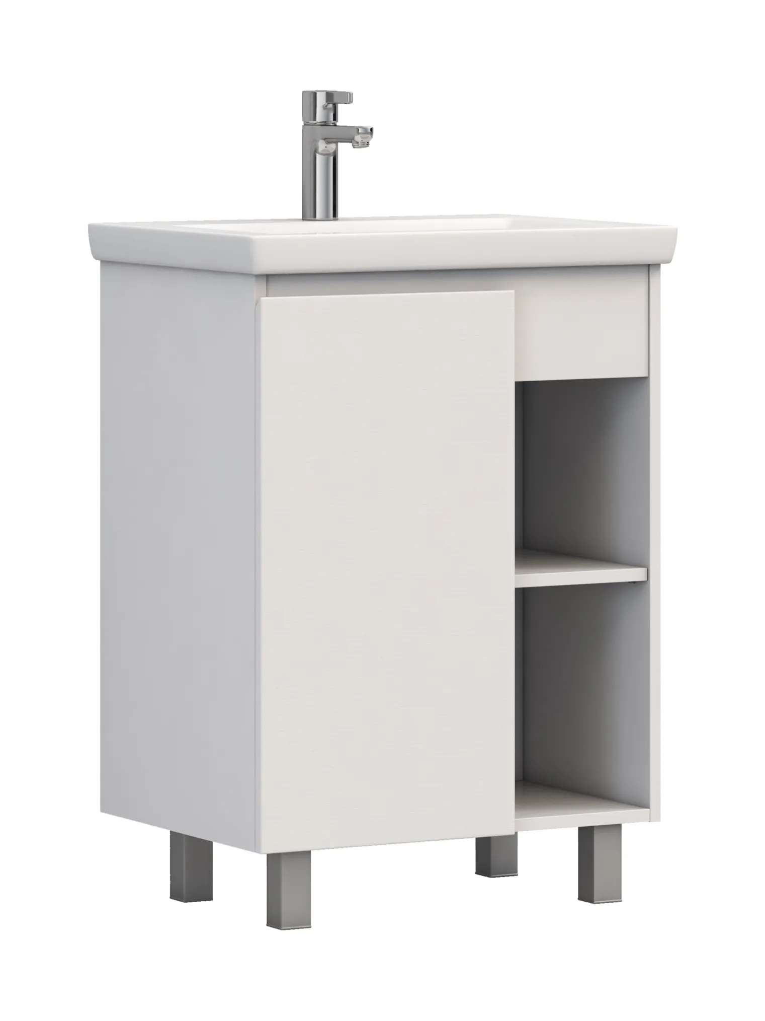 Петли с механизмом доводчика обеспечивают мягкое и бесшумное закрывание, повышая комфорт ежедневного использования. Тумба рассчитана на установку раковины Como 60. Чтобы обеспечить корректную установку и удобство эксплуатации иной раковины, рекомендуется ориентироваться на размеры, указанные в технической схеме. Преимущества тумбы: * универсальный белый цвет — делает пространство светлее и визуально больше; * оптимальная ширина 56,8 см — подходит как для небольших, так и для стандартных ванных комнат; * увеличенная глубина 43,4 см — больше полезного пространства для хранения; * влагостойкая ЛДСП с матовым покрытием — долговечность и устойчивость к влажной среде; * дверца с доводчиком — мягкое и бесшумное закрывание; * интегрированная ручка — современный и лаконичный дизайн; * продуманное внутреннее пространство для хранения; * устойчивая напольная конструкция. OLEVARO создаёт мебель, объединяющую современный дизайн, практичность и высокую устойчивость к условиям влажной среды. Продукция бренда сохраняет аккуратный внешний вид и удобство использования на протяжении многих лет. Если вам нужна стильная, практичная и визуально лёгкая тумба под раковину, которая поможет поддерживать порядок и украсит современный интерьер ванной комнаты, — Modul 600-1-0 в белом цвете станет отличным выбором.