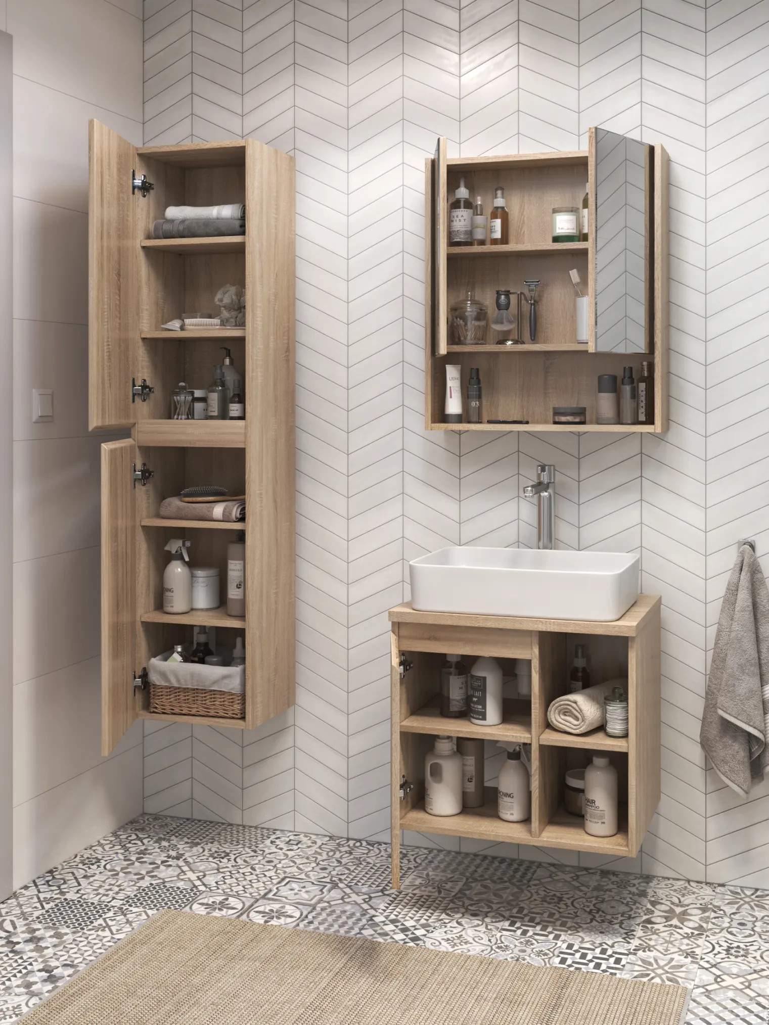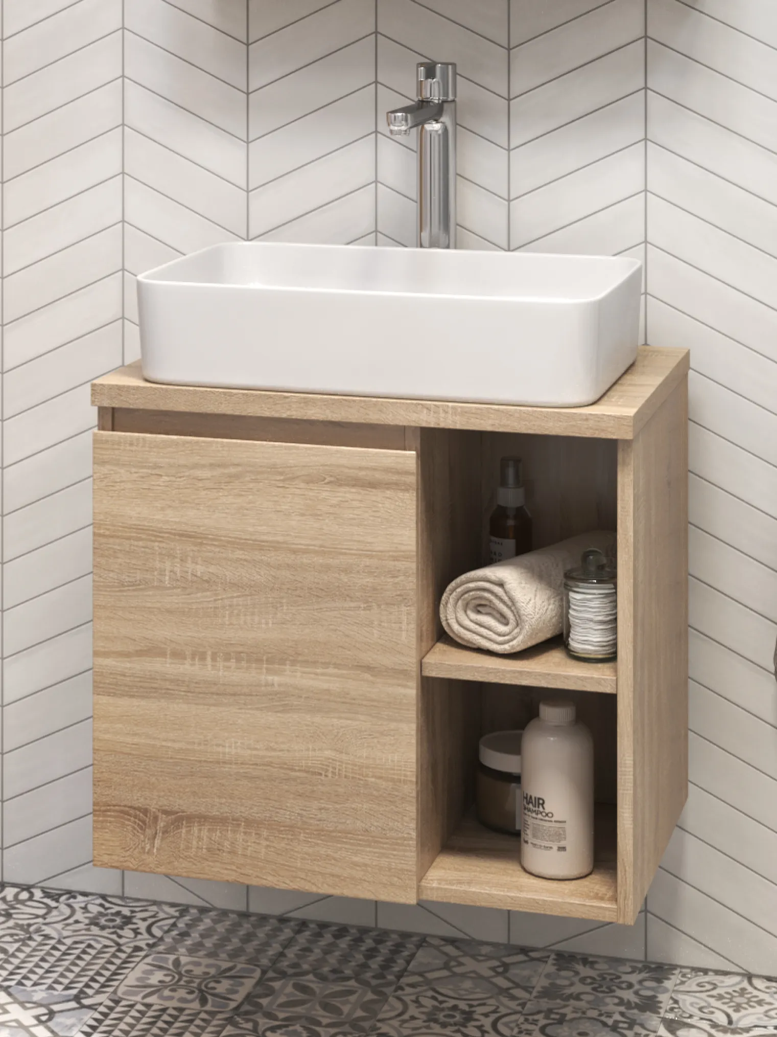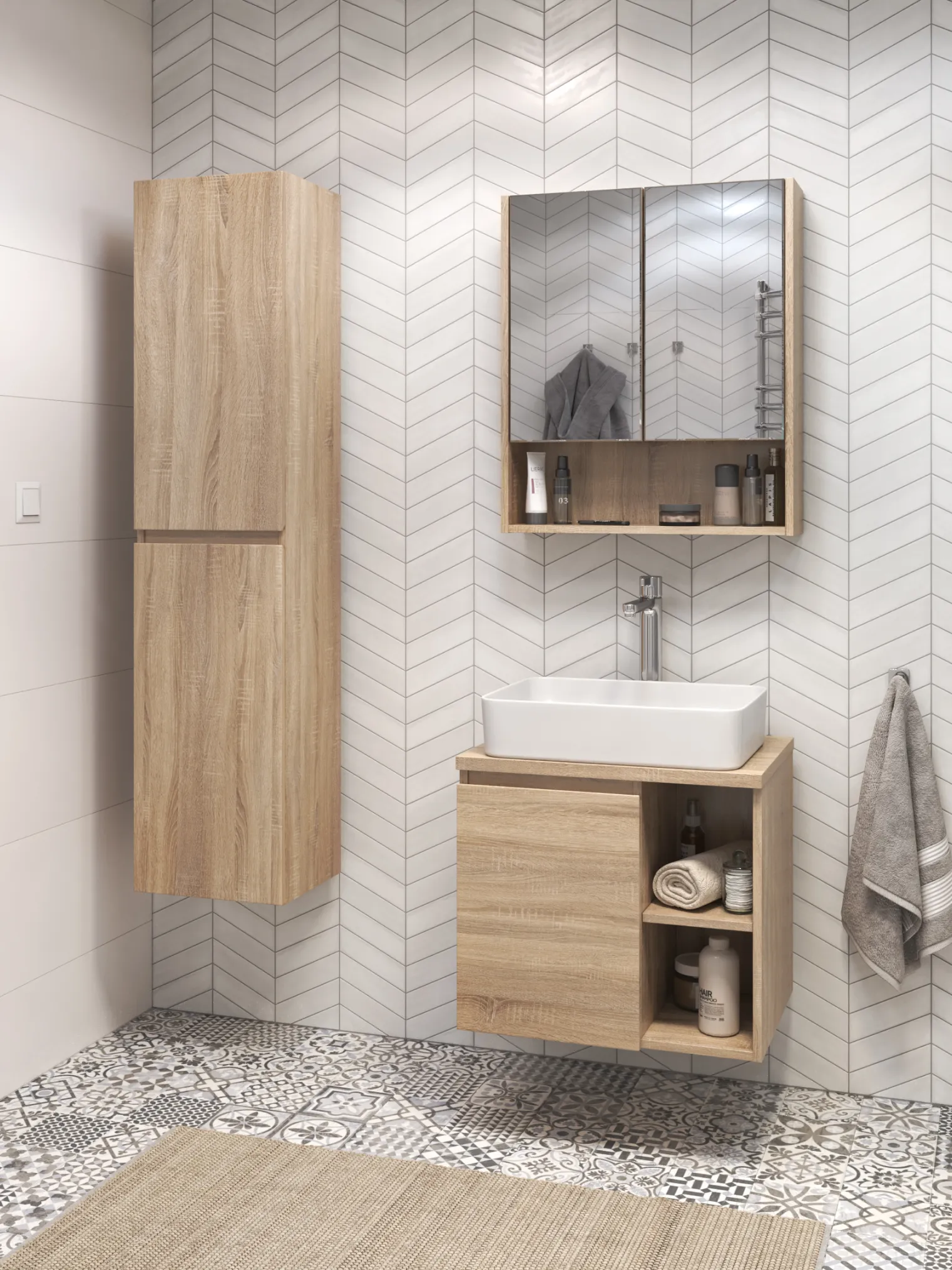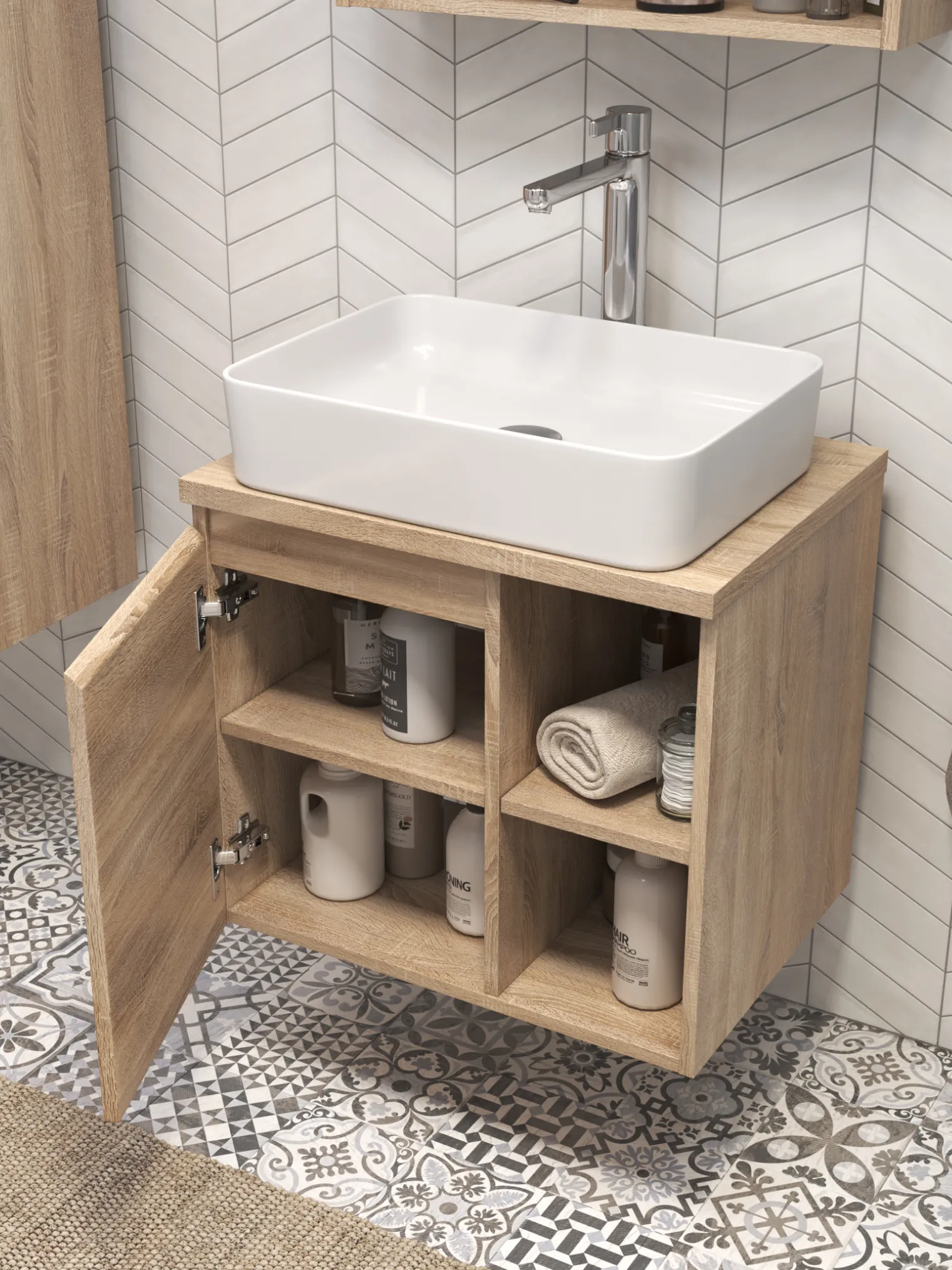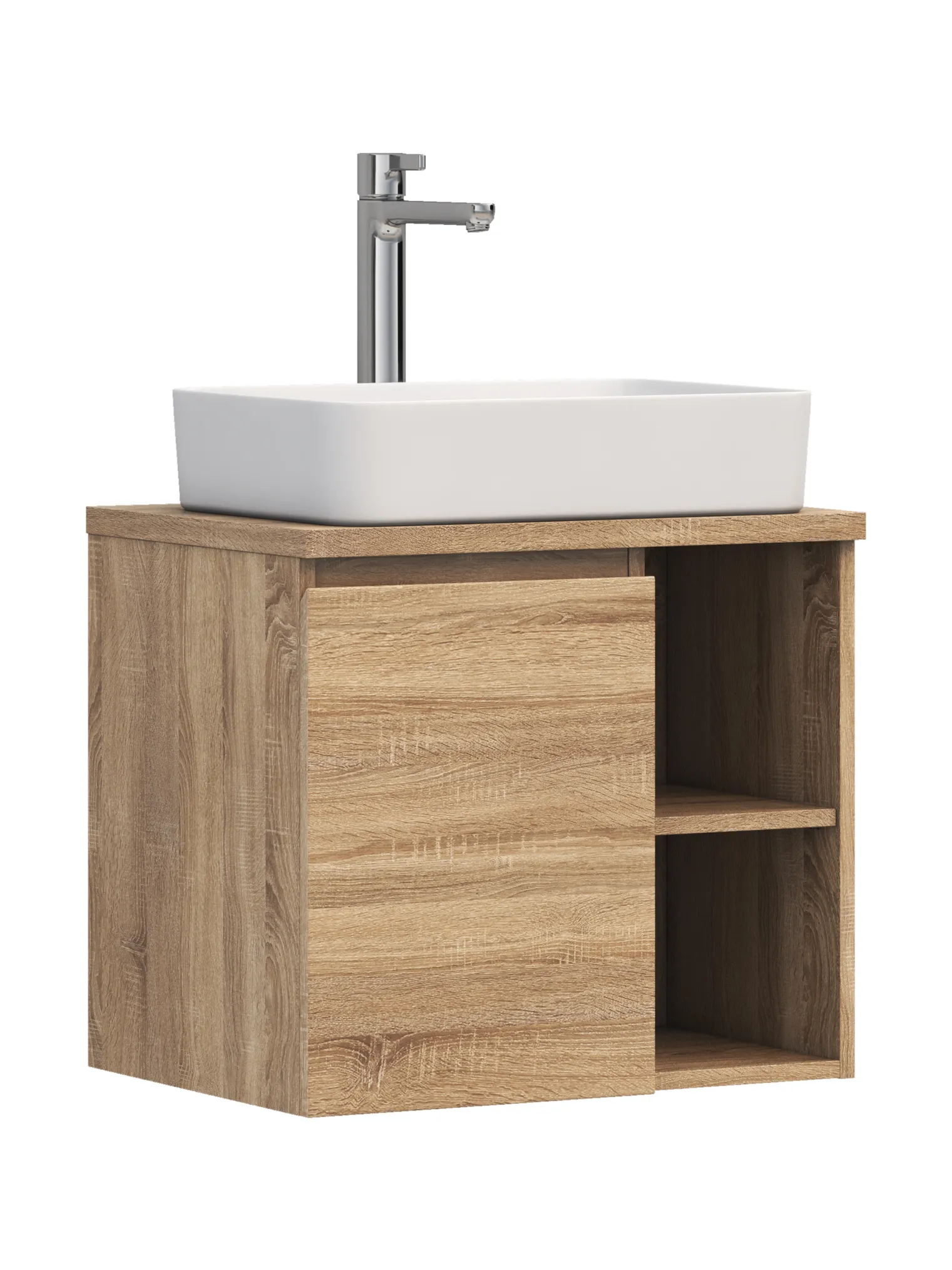 Петли с механизмом доводчика обеспечивают плавное и бесшумное закрывание — важное преимущество для комфортной ежедневной эксплуатации. Интегрированная ручка подчёркивает минималистичный характер коллекции Modul и делает конструкцию визуально лёгкой и аккуратной. Преимущества тумб: * подвесная конструкция — визуальная лёгкость и удобство уборки; * природный оттенок дуб сонома — тёплый и универсальный вариант для современных интерьеров; * широкая столешница — возможность установки накладной раковины или размещения аксессуаров; * ширина 57,2 см — оптимальный размер для компактных и стандартных ванных комнат; * влагостойкая ЛДСП с матовым покрытием — надёжность и долговечность в условиях влажности; * дверца с доводчиком — мягкое и бесшумное закрывание; * интегрированная ручка — современный минималистичный дизайн; * удобное внутреннее отделение для хранения. OLEVARO разрабатывает мебель, которая сочетает стиль, эргономику и высокую устойчивость к влажной среде. Все изделия создаются с учётом ежедневных нагрузок и сохраняют аккуратный внешний вид долгие годы. Если вы ищете подвесную тумбу с натуральной текстурой, удобной столешницей и современной эстетикой, — Modul 600-1-0 в цвете дуб сонома станет отличным выбором для вашей ванной комнаты.