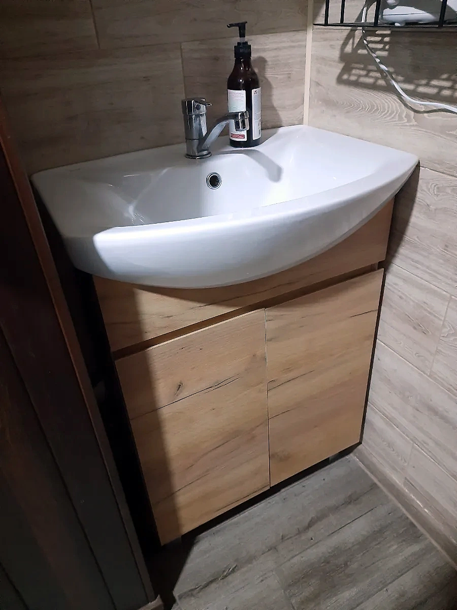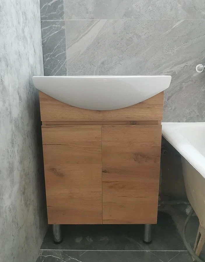 Напольная тумба под раковину Modul 600-2-0 в цвете дуб золотой — это сочетание лаконичного дизайна, компактности и функционального хранения. Благодаря ширине 56 см модель отлично подходит для небольших и средних ванных комнат, создавая аккуратный и организованный интерьер даже в ограниченном пространстве. Корпус и фасады выполнены из влагостойкой ЛДСП с прочным матовым ламинированным покрытием. Текстура дуб золотой добавляет интерьеру естественности и тепла, при этом матовая поверхность остаётся практичной — на ней менее заметны отпечатки и следы от капель воды. Тумба рассчитана на установку раковины Балтика 60, создавая аккуратную функциональную зону умывальника. Высота конструкции вместе с раковиной составляет 84 см, что обеспечивает комфортное использование для всей семьи. Внутри размещена система хранения с двумя дверцами, которая позволяет аккуратно организовать бытовую химию, средства ухода, косметику и другие необходимые предметы. Дверцы оснащены механизмом доводчика, обеспечивающим мягкое и бесшумное закрывание — без хлопков и лишней нагрузки на фурнитуру. Интегрированная ручка подчёркивает чистоту линий серии Modul и делает конструкцию современной и удобной. Преимущества тумбы Modul 600-2-0 тёплый оттенок натурального дуба — уютный акцент для современной ванной; компактная ширина 56 см — идеальна для небольших помещений; влагостойкая ЛДСП с матовым покрытием — долговечность в условиях высокой влажности; совместима с раковиной Балтика 60 (высота тумбы с раковиной — 84 см); дверцы с доводчиками — мягкое и бесшумное закрывание; интегрированная ручка — аккуратный, минималистичный внешний вид; удобное внутреннее пространство для хранения; напольная конструкция — устойчивая и практичная. OLEVARO проектирует мебель с акцентом на долговечность, удобство и устойчивость к влажной среде, что особенно важно для ванной комнаты. Если вам нужна стильная и компактная напольная тумба под раковину в тёплом древесном оттенке, которая обеспечит порядок и подчеркнёт современный интерьер, — Modul 600-2-0 танет отличным выбором