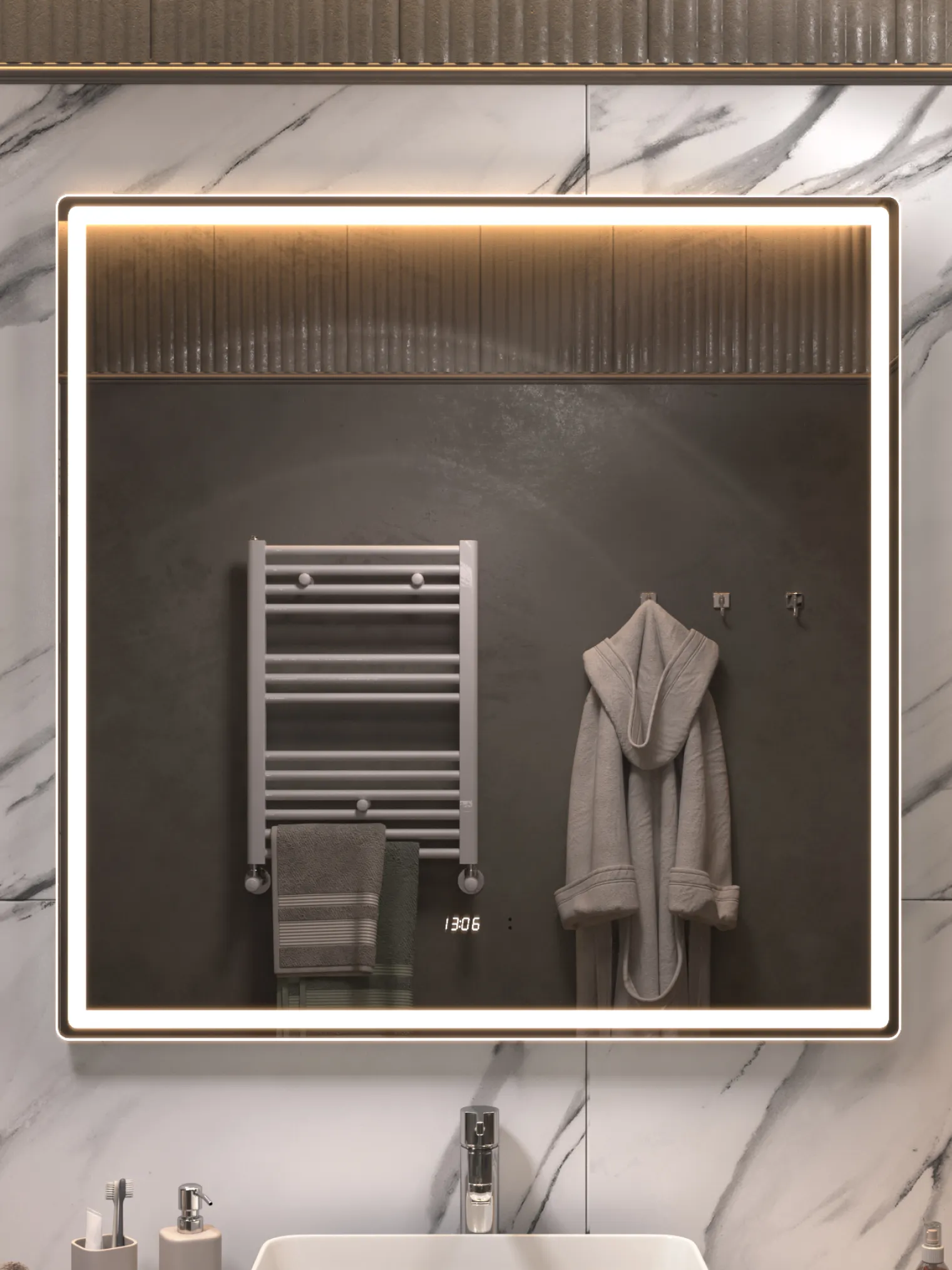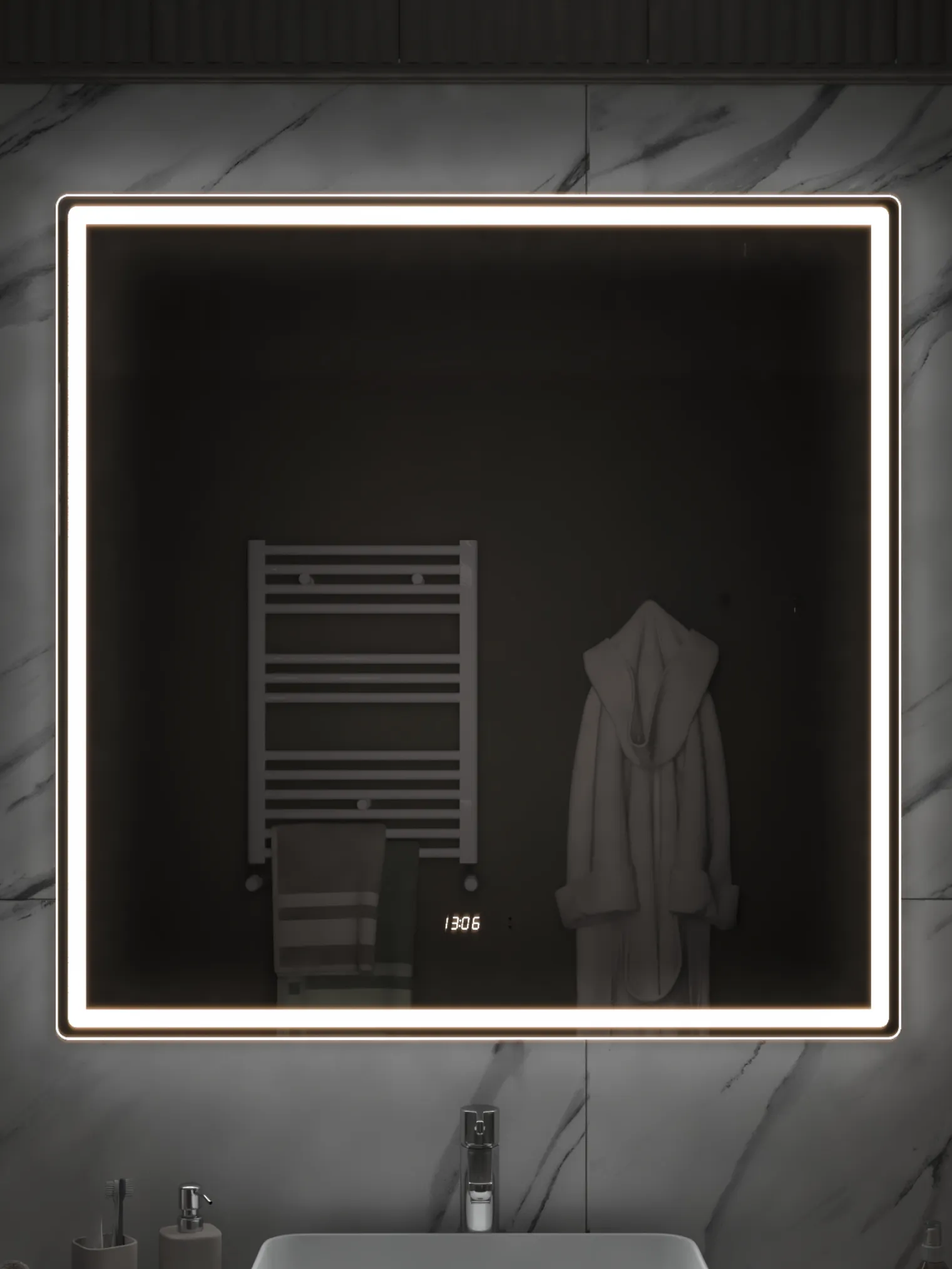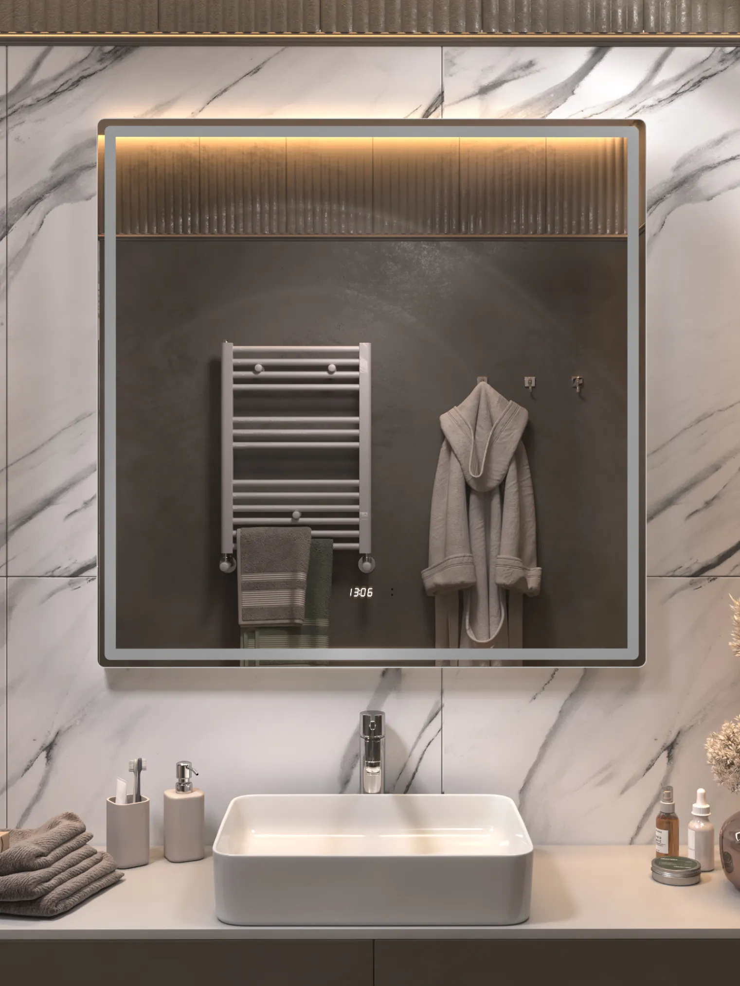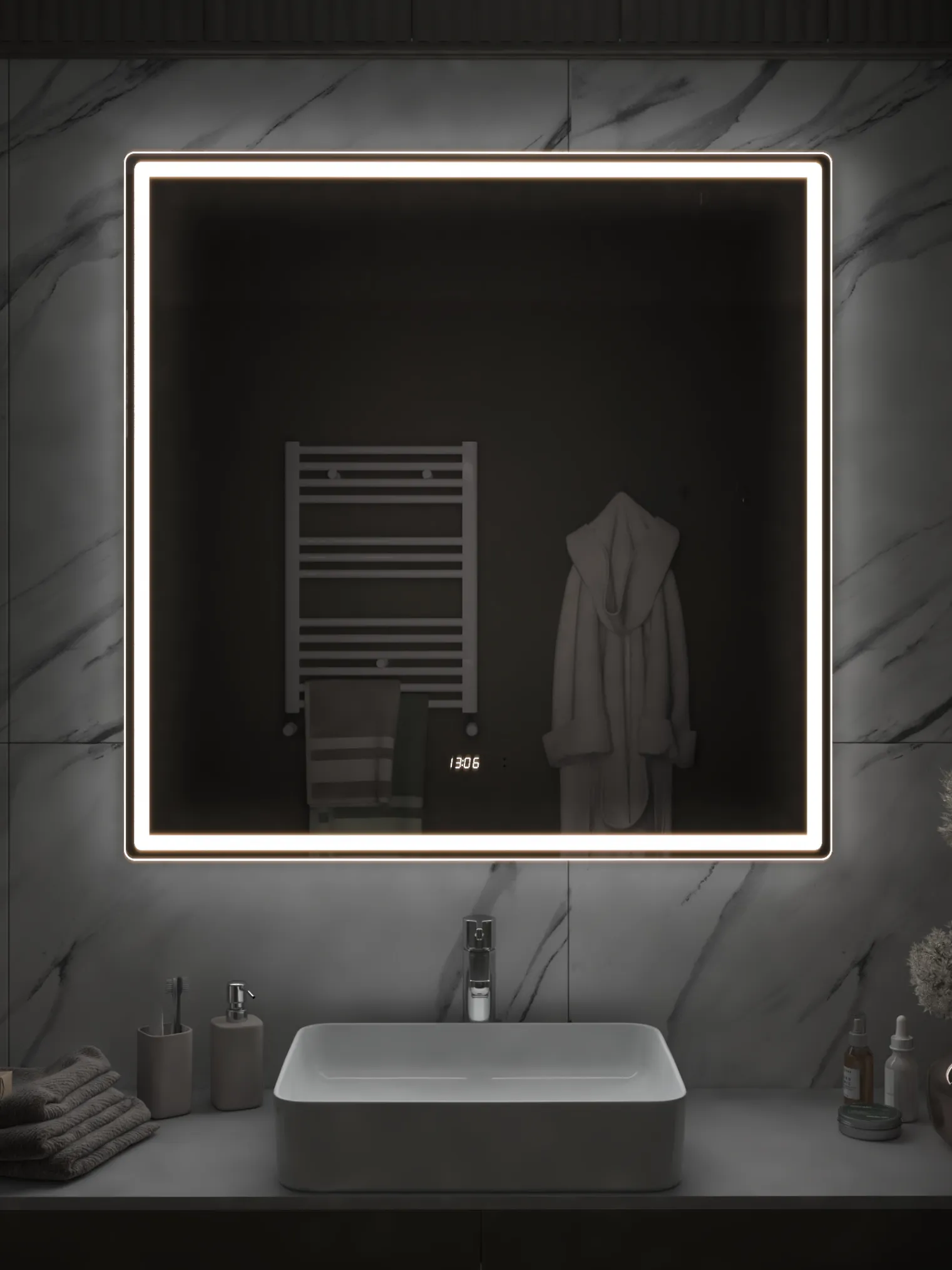 Совершенный баланс света и функциональности. Квадратная модель Ellio Luxe 1000 OLEVARO станет выразительным акцентом современной ванной комнаты. LED-подсветка нового поколения COB обеспечивает сплошное, мягкое освещение без бликов и световых точек, а добавленные функции часов и датчика температуры делают зеркало не только красивым, но и практичным. Бесконтактное управление и диммер позволяют регулировать свет движением руки — легко, удобно и без следов на поверхности. Функция антизапотевания (30×40 см) сохраняет зеркало прозрачным даже при высокой влажности. Ellio Luxe 1000 — зеркало, которое делает утренние ритуалы стильными и технологичными.